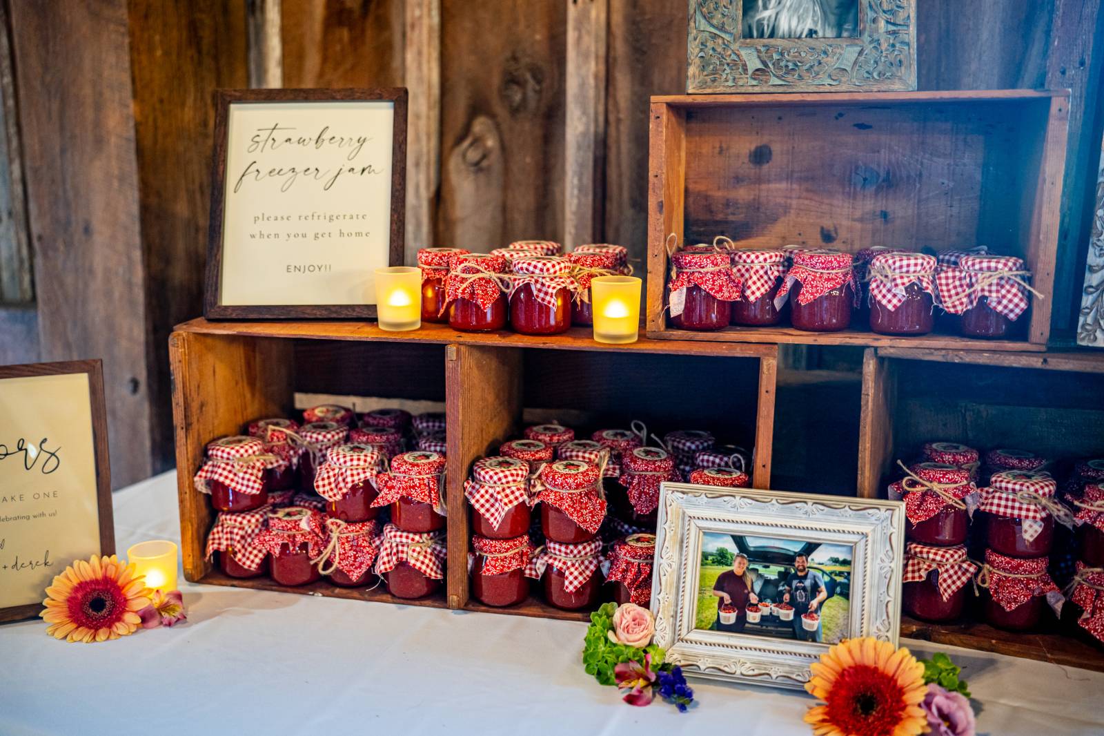 Sydnie wrote, “We wanted our guests to take home something that Derek and I spent time on, to show how much we appreciated having our loved ones share our wedding day with us. We made homemade strawberry jam for each guest, made with handpicked strawberries from Mayberry Farms; we had to pick 8 buckets of strawberries!”