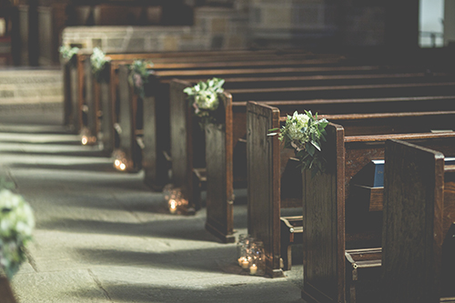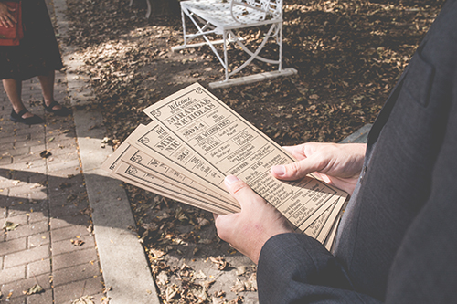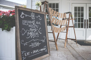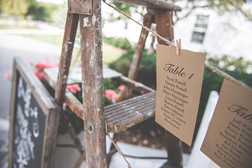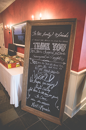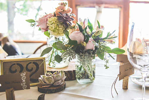 A mix of rustic and elegance, this fall green, gold & silver wedding consisted of wooden center pieces, a wooden guest book piece made by the couple’s friend, kraft paper programs along with hundreds of mason jars that adorned the tables.