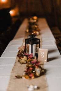 DESCRIBE YOUR FLOWERS:  Pike Place Market has always been a favorite West Coast vacation stop of mine. So when presented with a chance for a weekend getaway in Seattle, a visit was in order. Due to the time of year, I found that many flower vendors were selling dried products. I’ve always loved the look of dried bouquets. With so many options in one place, I knew what I had to do! I worked with a long-time vendor to pick and arrange stems to craft my bridal bouquet. Then, we carefully wrapped the bouquet for hand carrying on the flight home (I got a lot of funny looks and questions at the airport!). Back in Wisconsin, I added pheasant feathers to represent Mitch’s and my shared love of the outdoors. I then worked with online vendors to purchase bunches of dried flowers (Larkspur, German statice, strawflowers) to match those in my bouquet, which I hand-tied into my bridesmaids’ bouquets. For decorations, my mom and I designed and grew numerous planters with fountain grass, coleus, and heucheras. We interspersed these with locally grown gourds to fit our October theme. We also purchased autumnal garlands to run down the length of each of the long banquet tables we used at our reception.