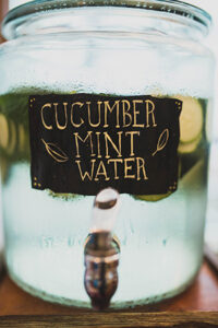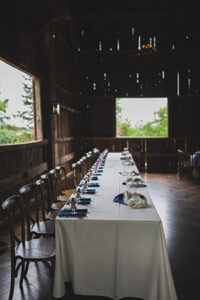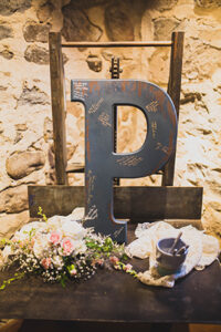 WERE THERE ANY PERSONAL TOUCHES OR DIY ELEMENTS? There were several things that we created for our wedding. Christine painted the “Welcome” sign and the memorial board was handcrafted for the occasion. The guest table assignments were displayed on a series of shutters that had been taken off a 19th-century hotel from the community that we are both from. The table numbers were painted onto plinth blocks that were taken from Scott’s family home after a remodel. We also brought a collection of yard games for everyone to play during cocktail hour. Also, the card box was fabricated using a suitcase taken from Scott’s Grandma’s attic. Name tags were hand painted with roses or vines and put on shutters.