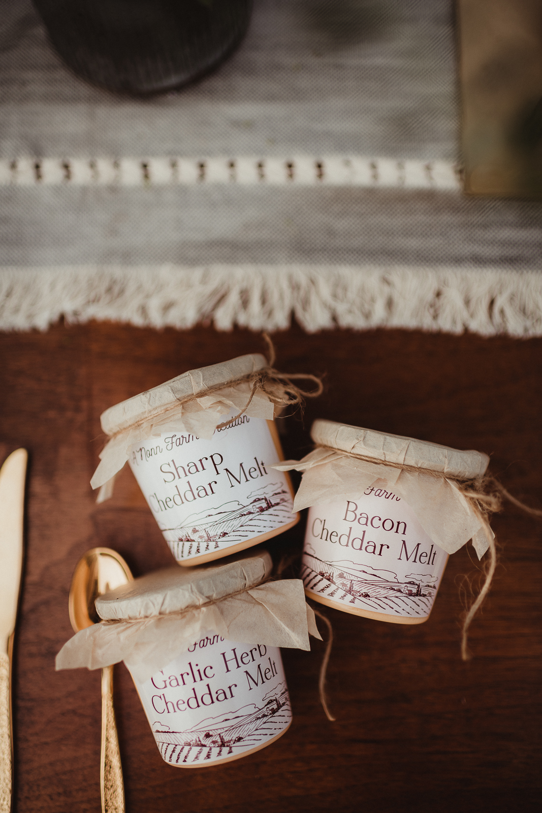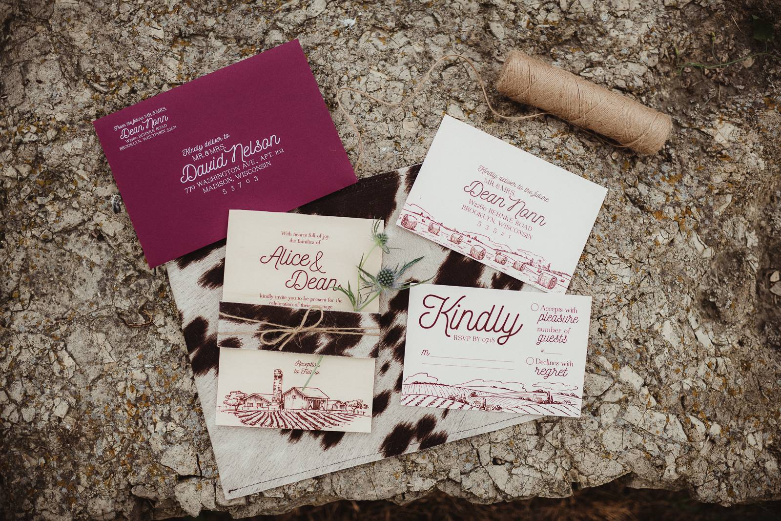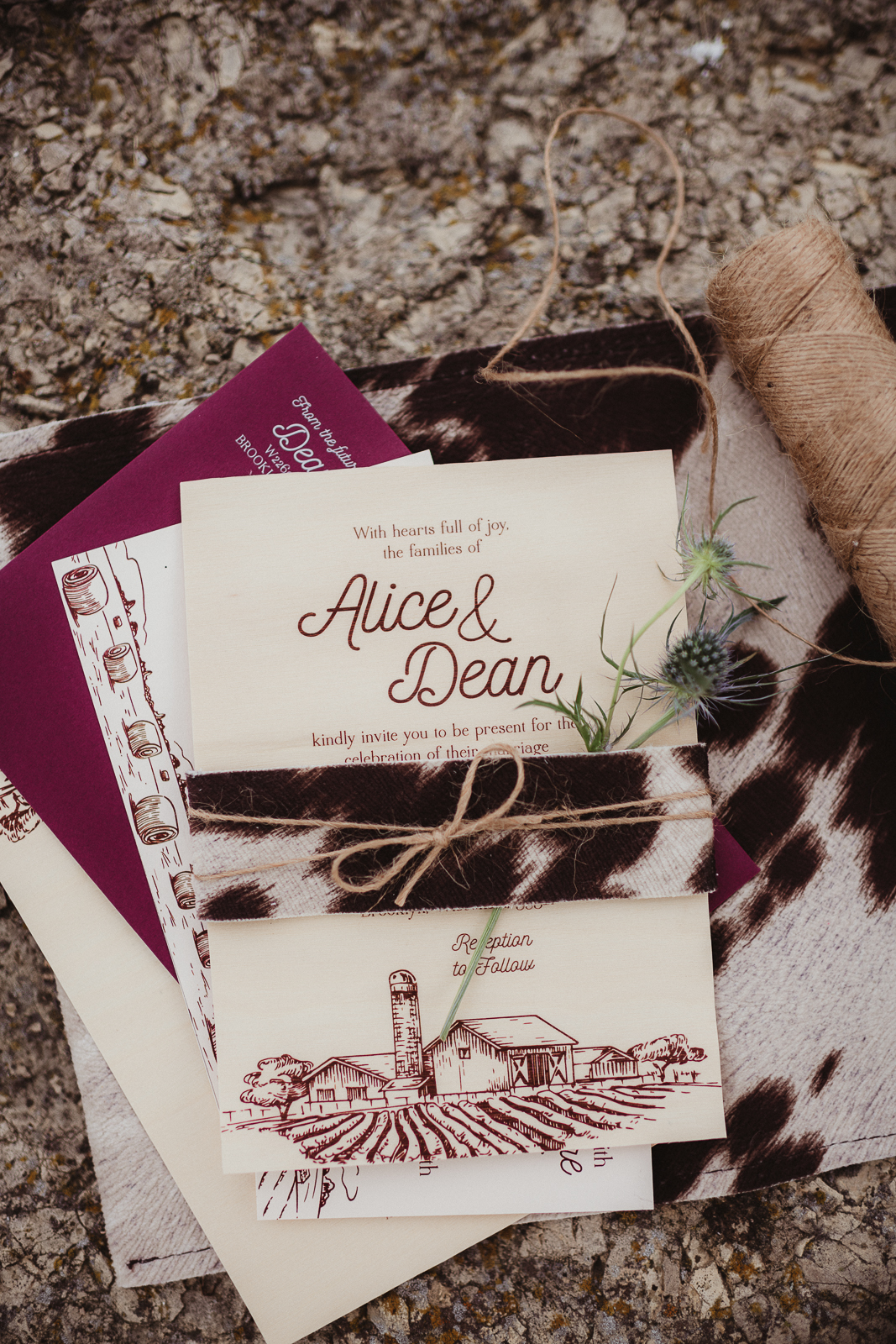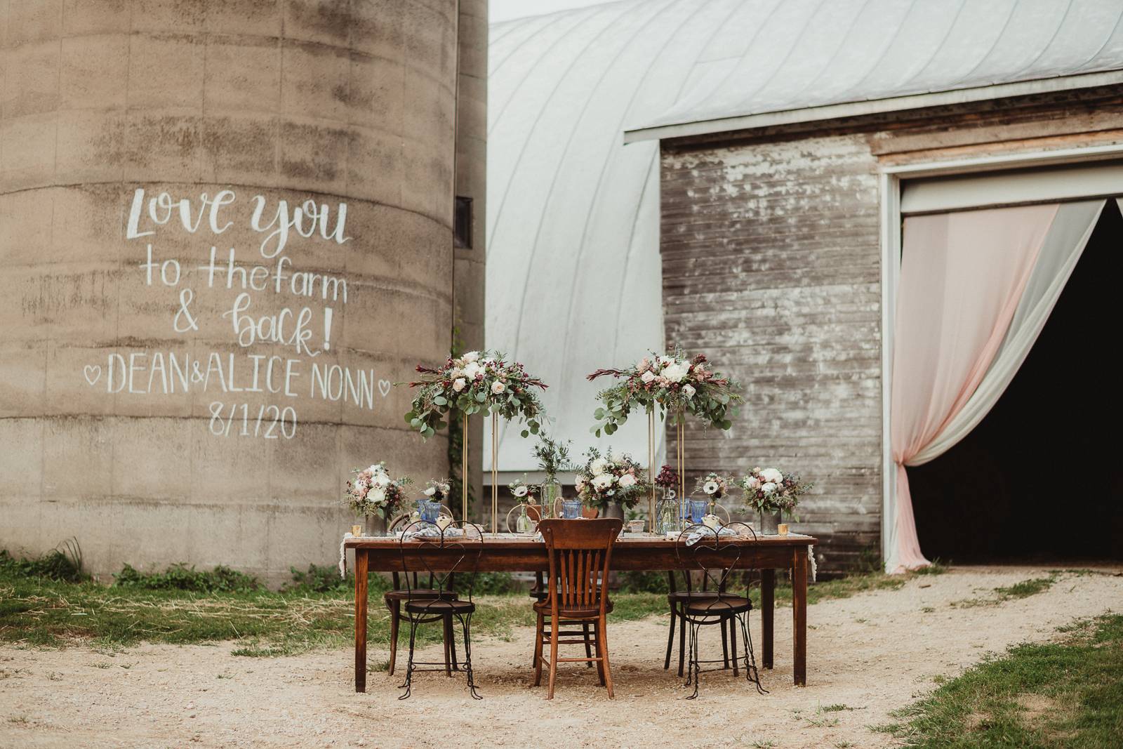 LK Bridal Studio brings detailed design and rustic texture within the paper elements of this farm wedding scape. LK Bridal designs thoughtful and intentional components to incorporate into your big day from invitation suites, programs, wedding favor labels, escort cards, table numbers, and beyond. A real wooden invitation and custom contoured fan programs make their gorgeous appearance in this hometown scape.