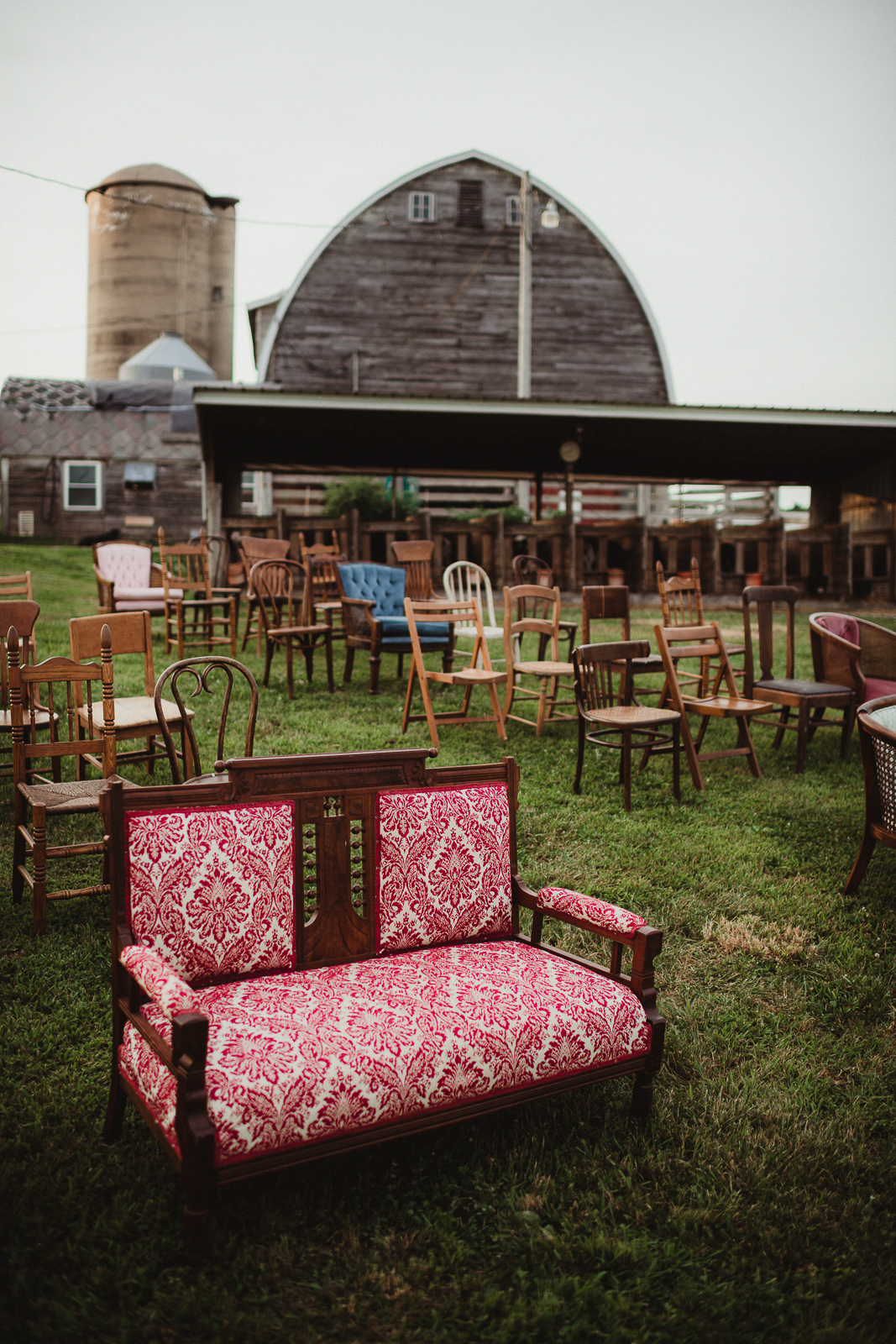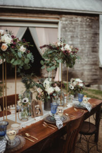 Simply Glamorous Rentals & Event Design uses an eclectic array of furniture and decor elements to design the spaces throughout your special day. Their delicate glassware and vintage decor pieces make for a perfectly lovely, delicate, and rustic display in this sweet farm wedding scape.