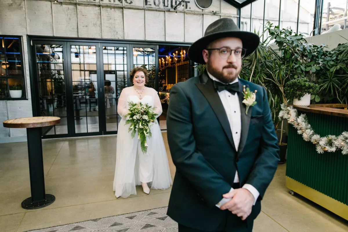 A stylish Mid-Century Modern winter wonderland wedding at The Tinsmith, complete with bespoke bridal fashion, festive décor, and meaningful handmade touches.