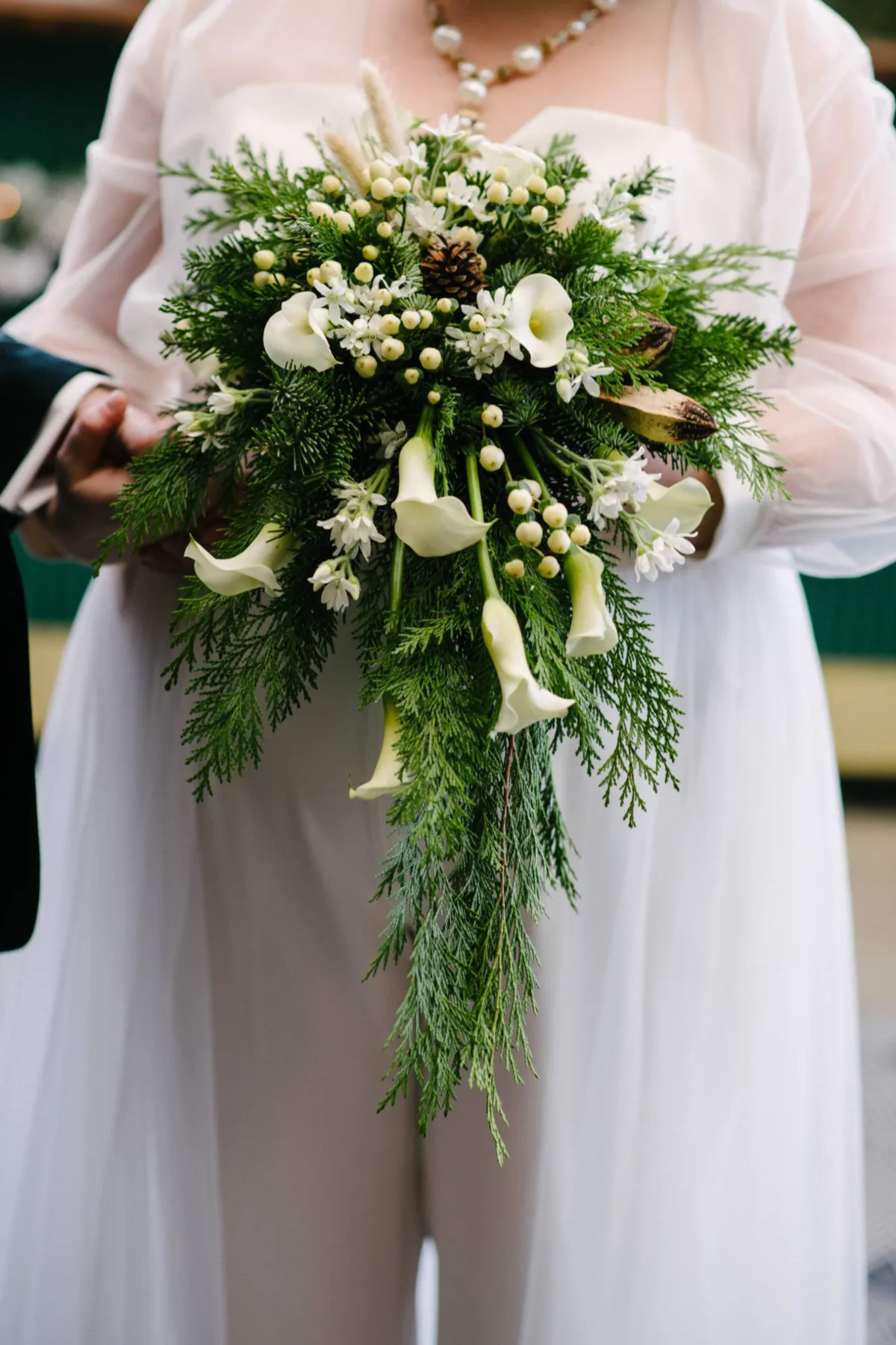 Other bridal accessories included a gold sun halo, an antique fur stole, a gold and pearl statement necklace, and sparkling heels. Felly’s Flowers created a festive, cascading bouquet of calla lilies, evergreen bunches, white berries, bunny tail stems, and pinecones.