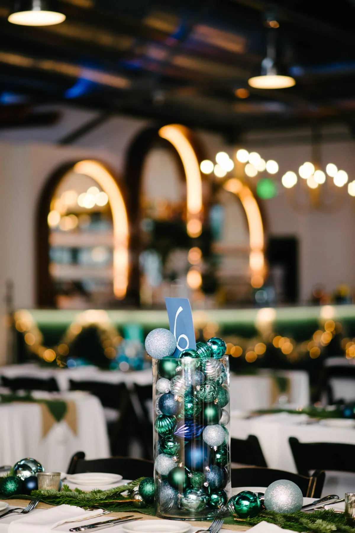 For their winter wonderland wedding, ornaments and pine trees were a must. Sarah and Kendrick put love, time, and artistry into creating many of their décor items, including over a thousand ornaments and over a dozen trees of various colors and heights. The bride and groom also handmade their corsages, boutonnieres, signage pieces, and games for their guests.