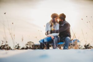 At the top of a snowy bluff, the breathtaking Wisconsin landscape made the perfect backdrop for this nature-loving couple. A special place for both Ali and Jake, this family farm became even more precious as they hiked to the top of the property and promised to committed to one another for the rest of their lives. LK Bridal Studio captures their love for each other during a cold and wintry engagement photo shoot with playful colors, an heirloom ring and a love that was meant to be. Read more about their story and wedding plans down below.
