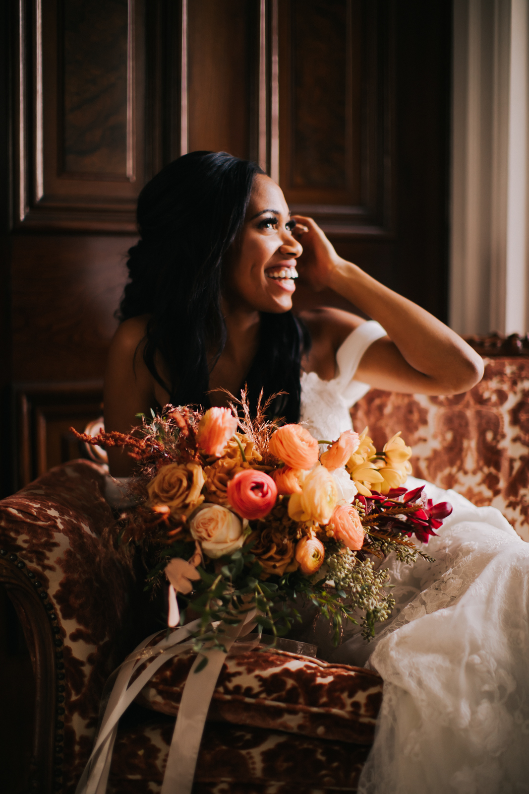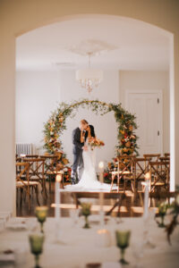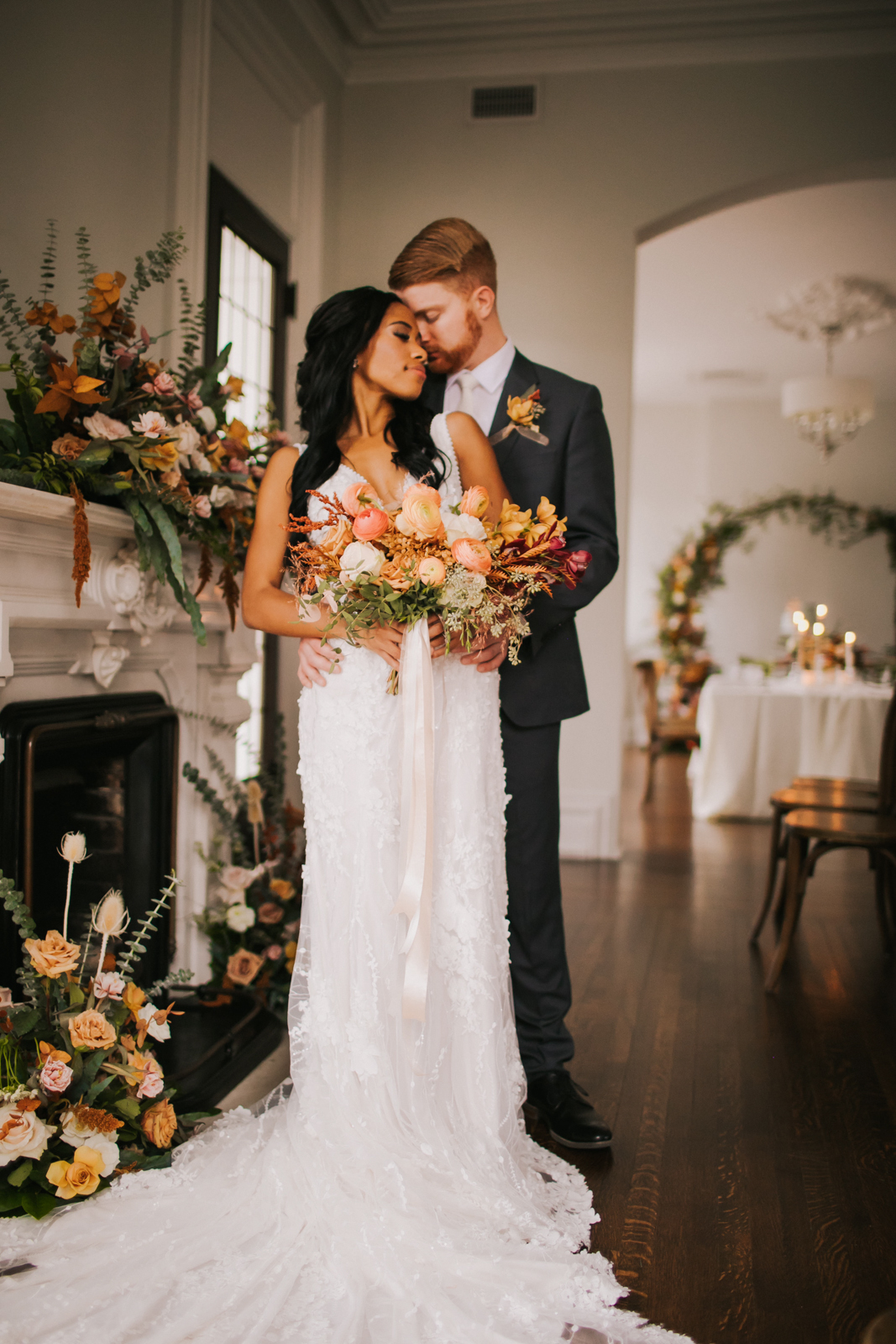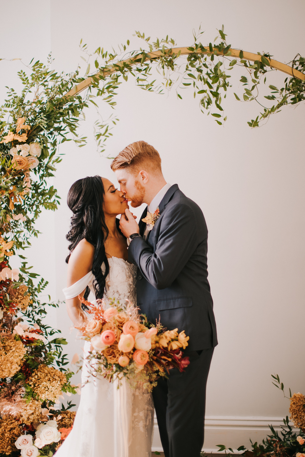 Soft, muted peaches, pale Tiffany blue with pops of rich reds, and citrus tones were the backbone of this Autumn Ethereal styled wedding. A circular archway of immaculate cascading florals by Buttercup Bouquets was the perfect backdrop for Tanesha and Mason – a real-life couple!