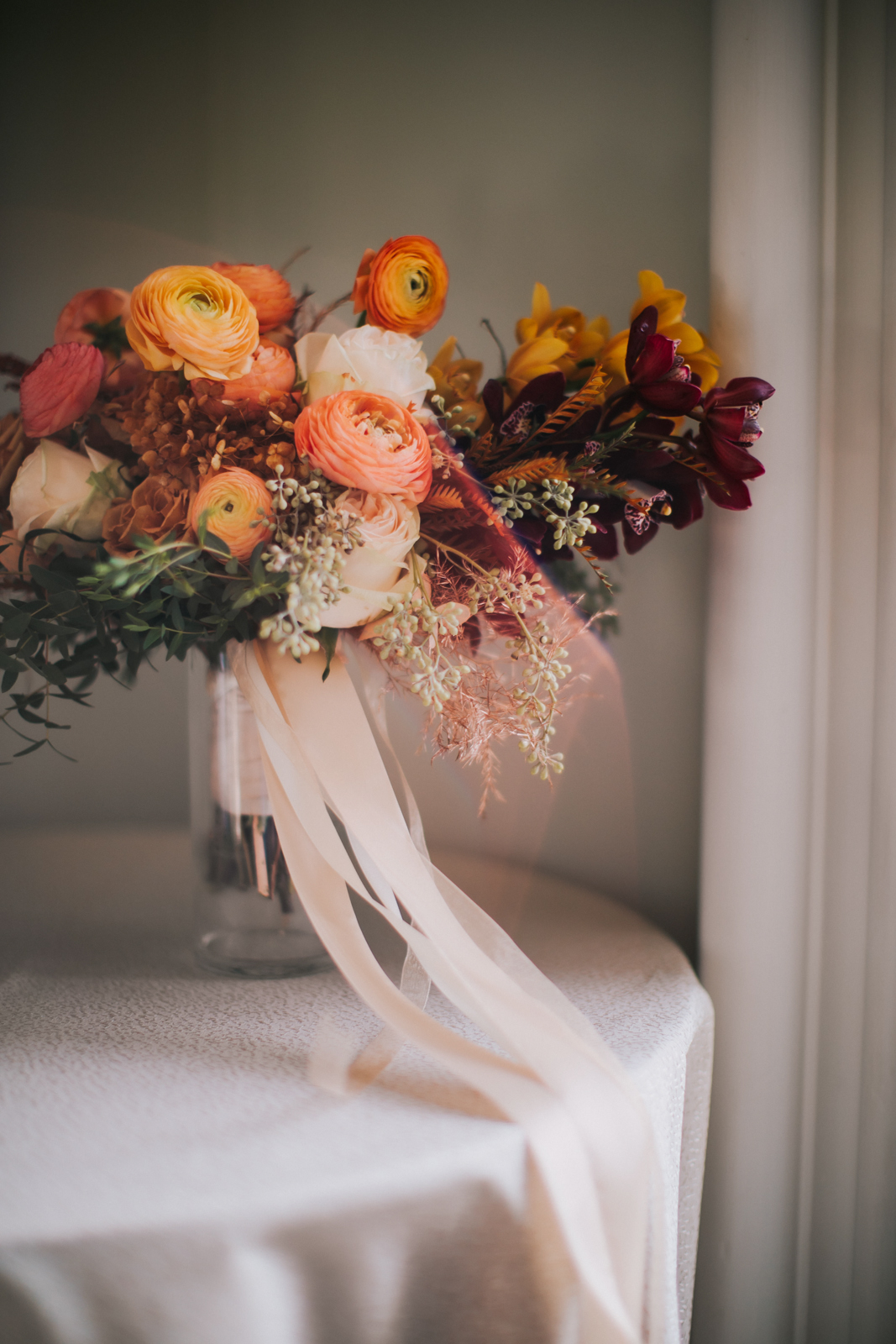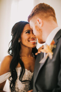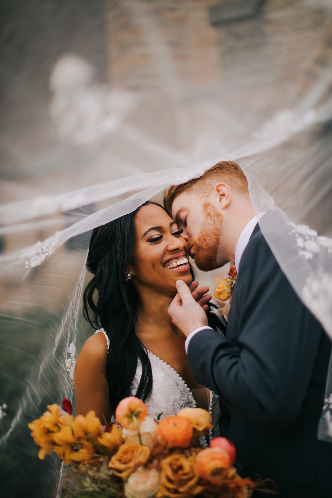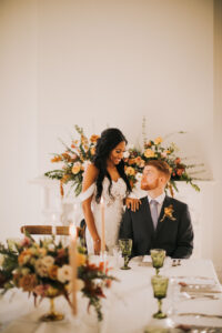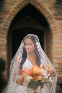 Soft, muted peaches, pale Tiffany blue with pops of rich reds, and citrus tones were the backbone of this Autumn Ethereal styled wedding. A circular archway of immaculate cascading florals by Buttercup Bouquets was the perfect backdrop for Tanesha and Mason – a real-life couple!