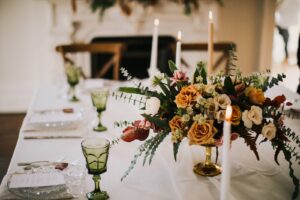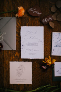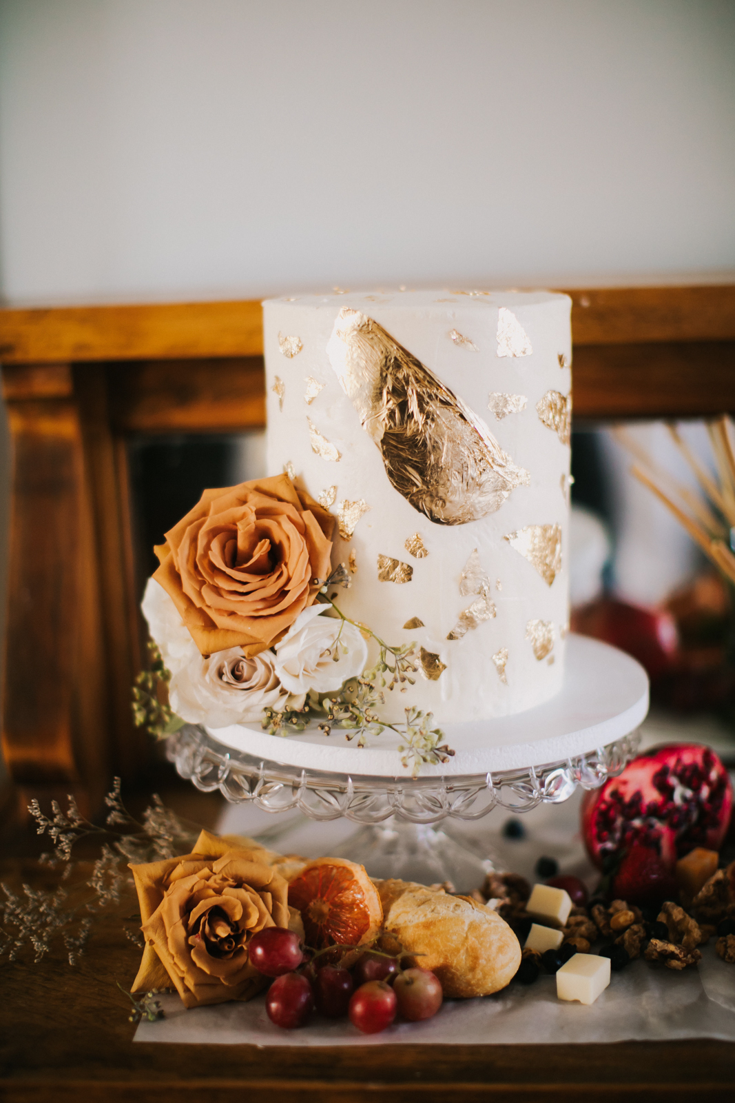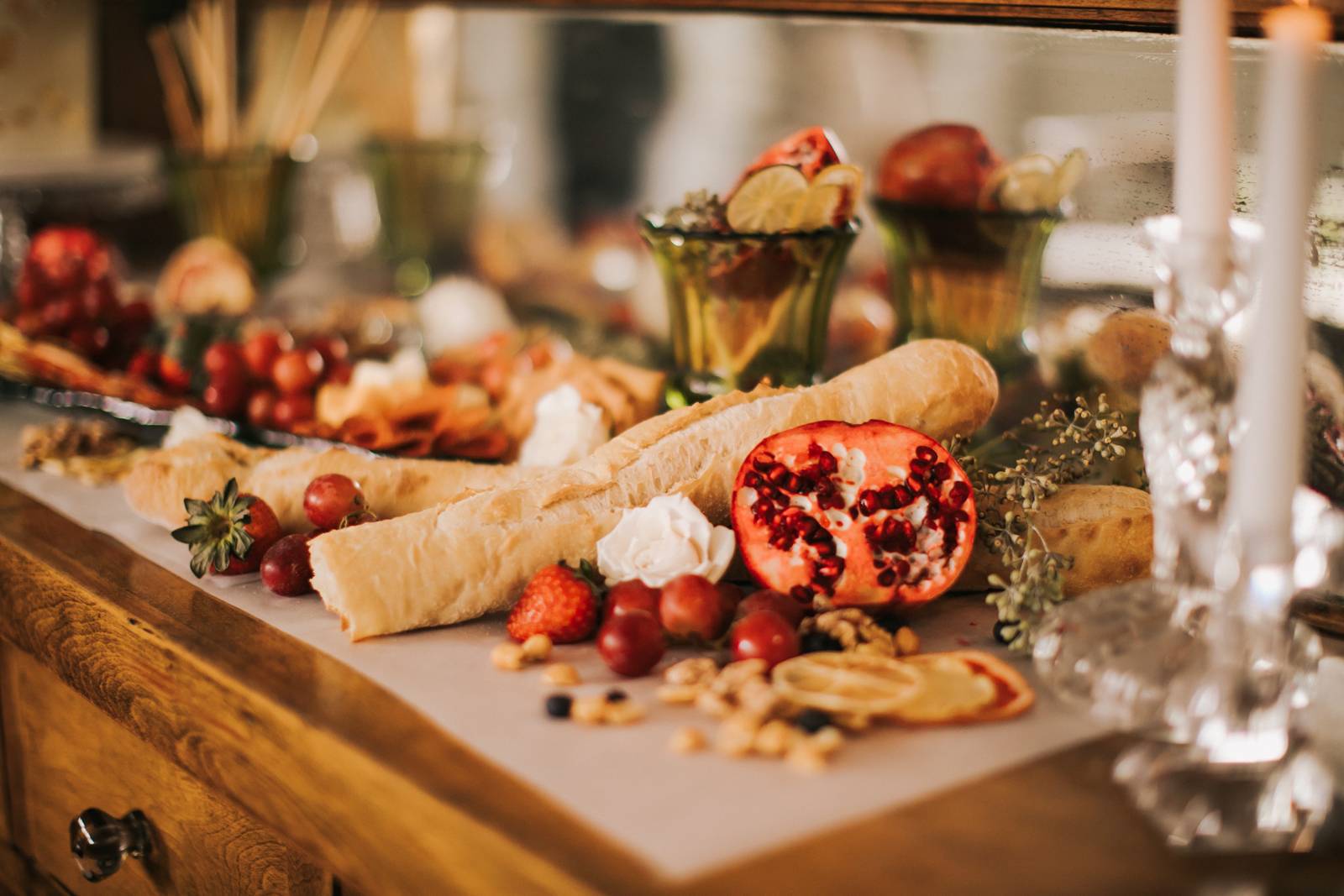 Venturing down the historic hallways, we’re met by a dramatic charcuterie spread. Ruby red pomegranates, fresh cheeses, and a gold-flecked cake by Culinary Fusion tumbled out across an antique dresser with a vintage mirror as a backboard. Sweet notes of fresh fruits top of the atmosphere in today’s scape!