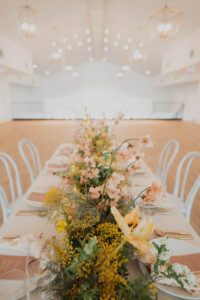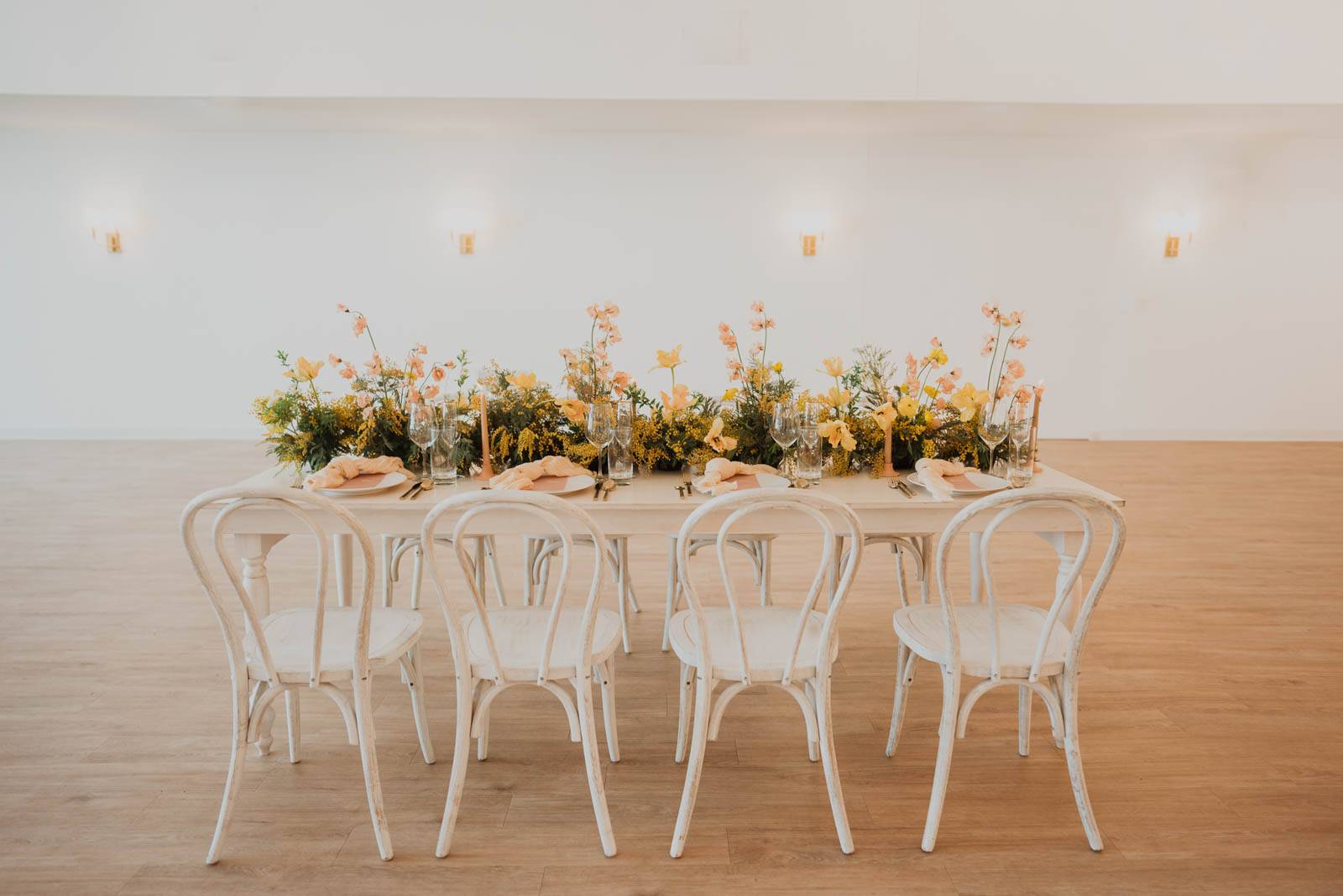 A La Crate Rentals’ whitewash spindle table provides the perfect neutral foundation for this stunning tablescape dressed in abundant spring florals.
