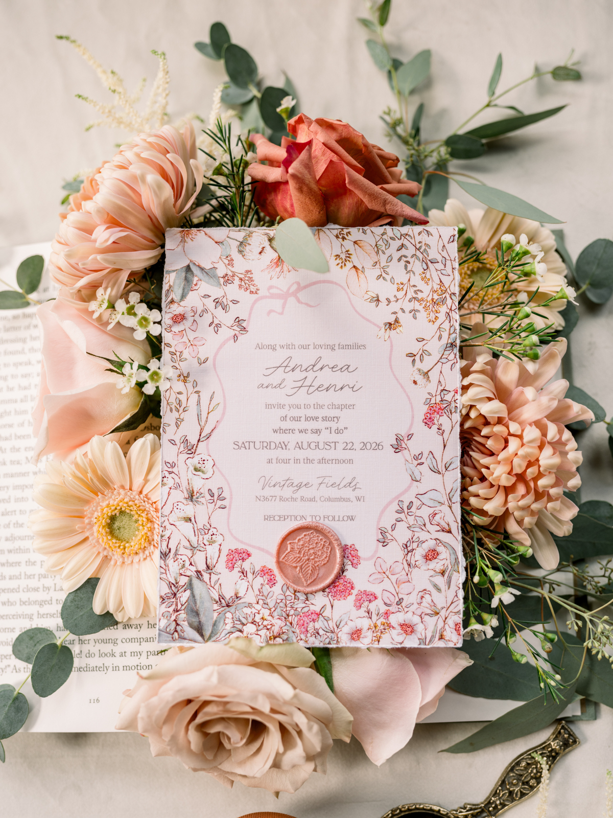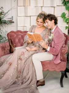 Nestled at the beautiful Vintage Fields in Columbus, Wisconsin, poetry meets petals in this literary cottagecore wedding inspiration. For those with a bookish heart, get inspired to write the next chapter in your own real-life love story, surrounded by bows, soft pink details, enchanting florals, and cozy vintage touches.