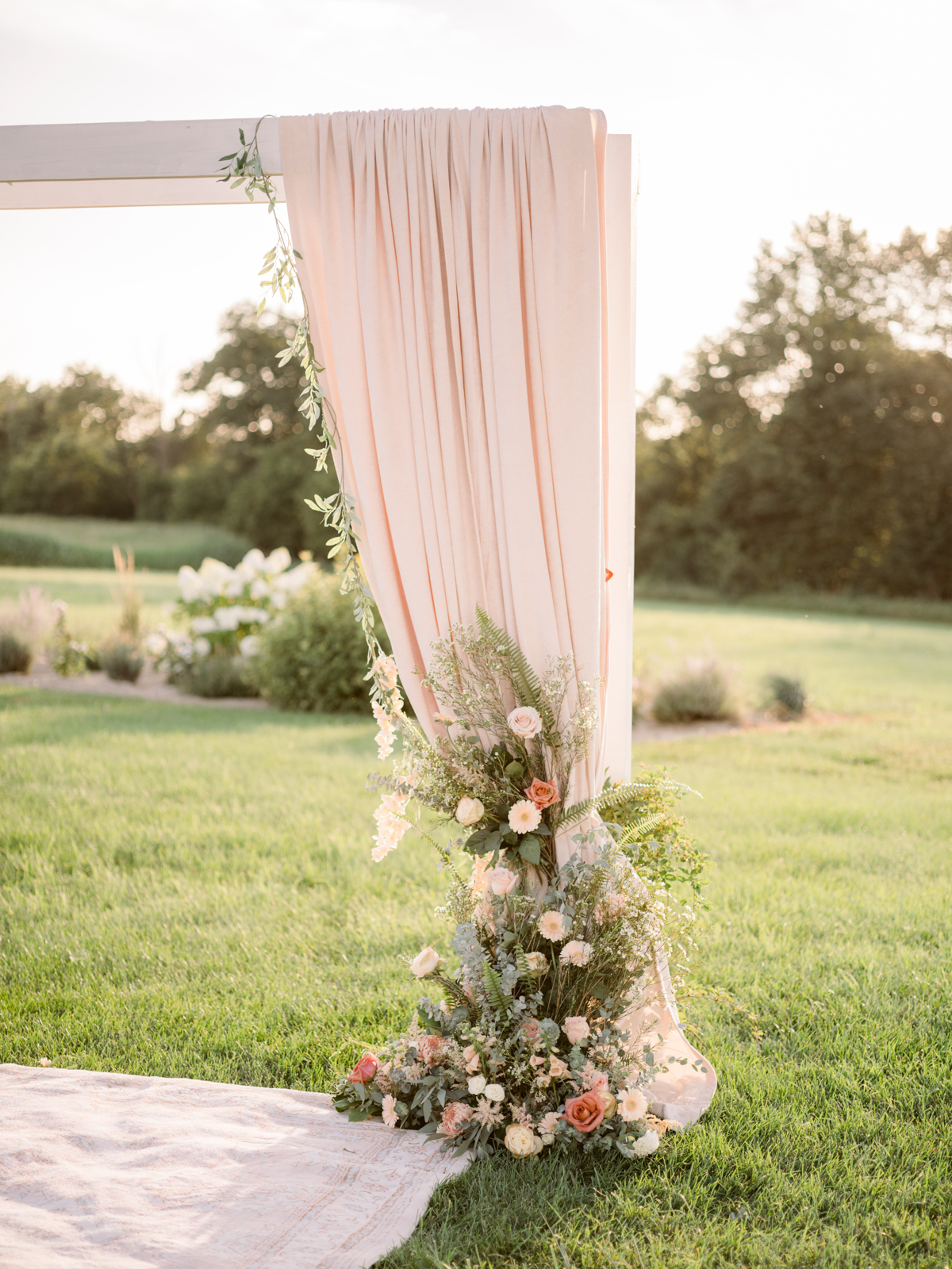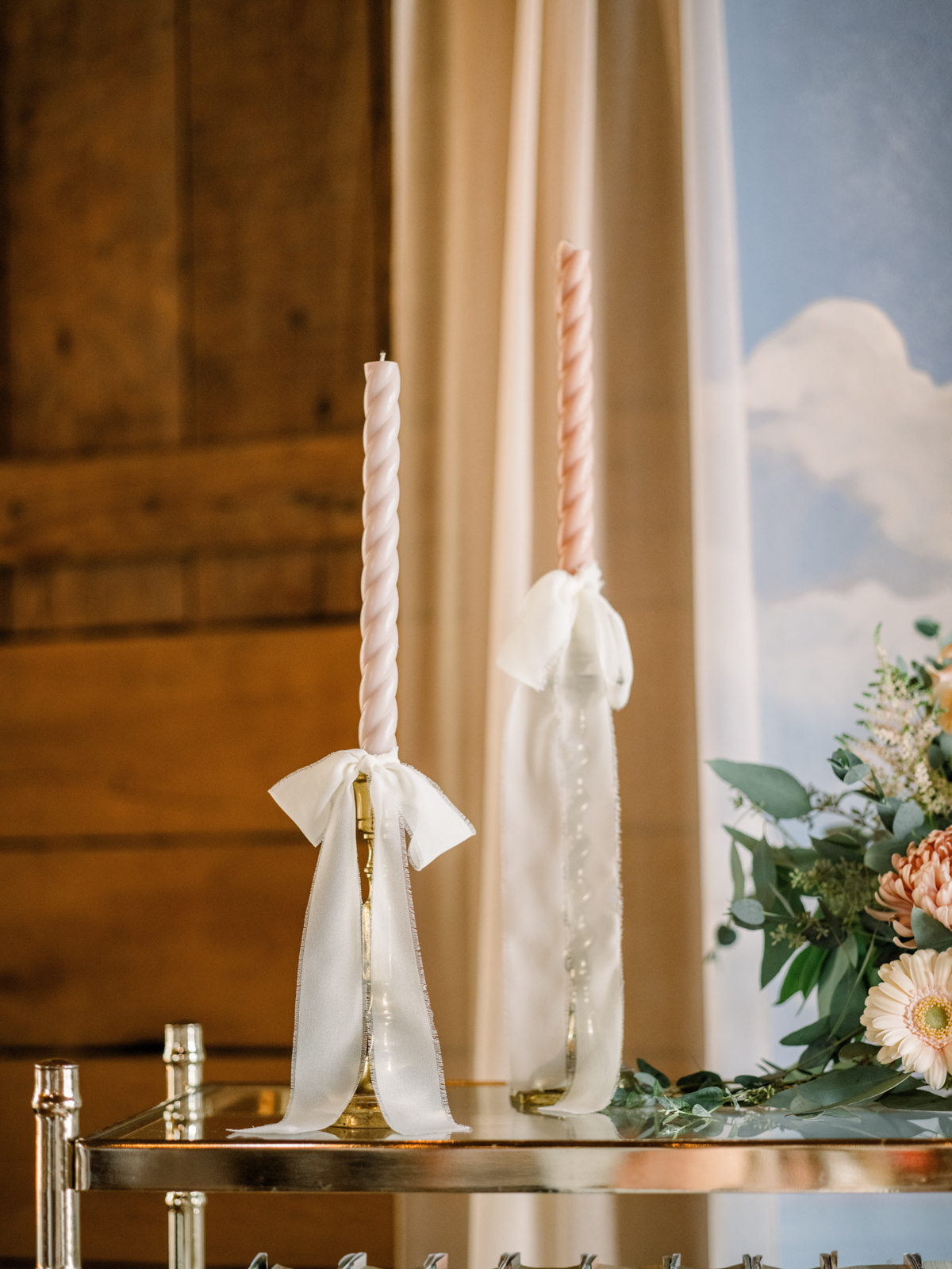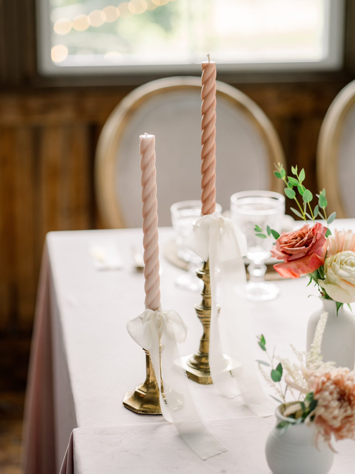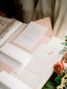 Expertly coordinated and designed by LK Bridal Studio, bows, wildflowers, and natural textures graced every aspect of this literary-inspired celebration. Creams, pinks, and greens flowed through the day’s design, reflected in each stunning stationery and signage piece. The invitation, surrounded by illustrative florals straight out of a vintage love story, set the tone, with the suite also including a details card, RSVP, framable quote, envelope, and scenic liner. Many print pieces featured torn edges, adding to the soft, gentle aesthetic.