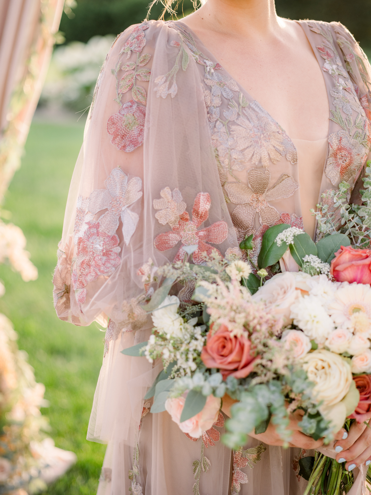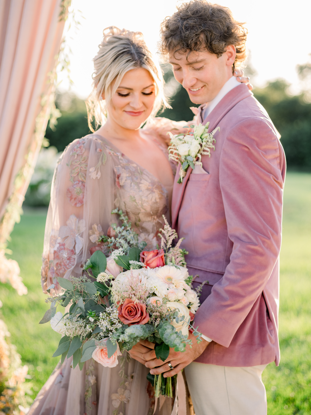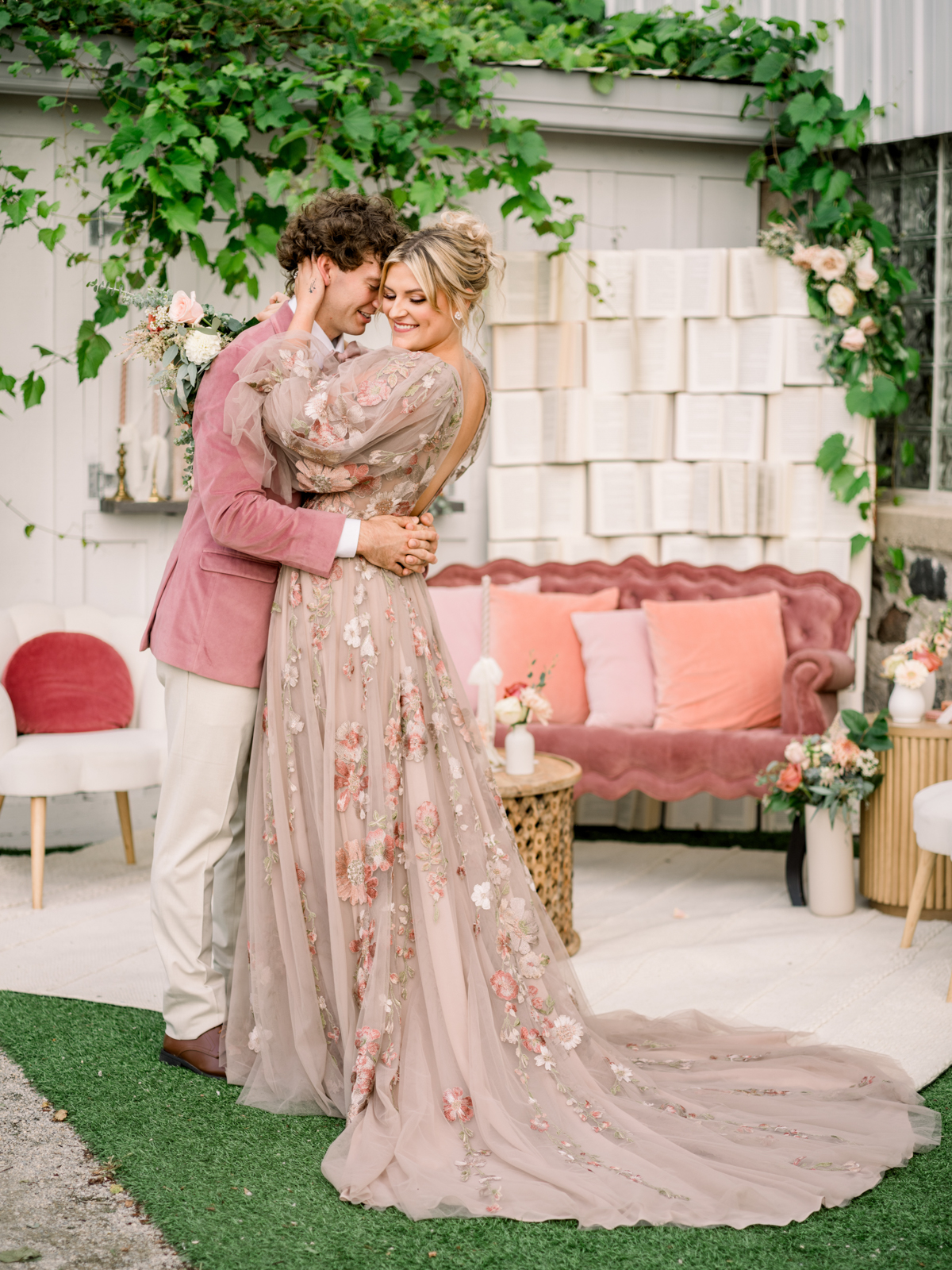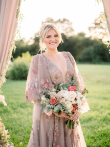 A flowery dusty pink gown from Vera’s House of Bridals provided the perfect look for the bride. With its delicate embroidered flower detailing, plunging neckline, soft and ethereal tulle fabric, and romantic, billowing balloon sleeves, the gown was perfect for twirling, walking down the aisle, or cuddling up for a quiet moment to soak in the day.