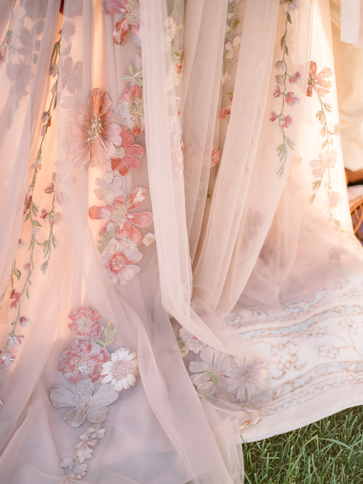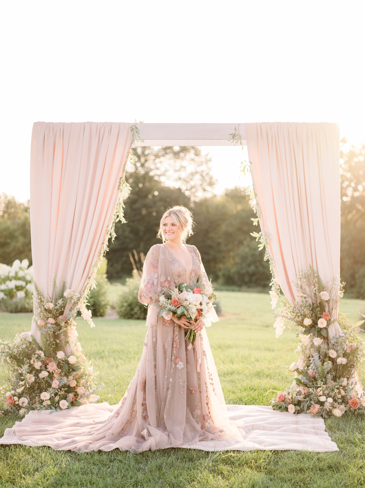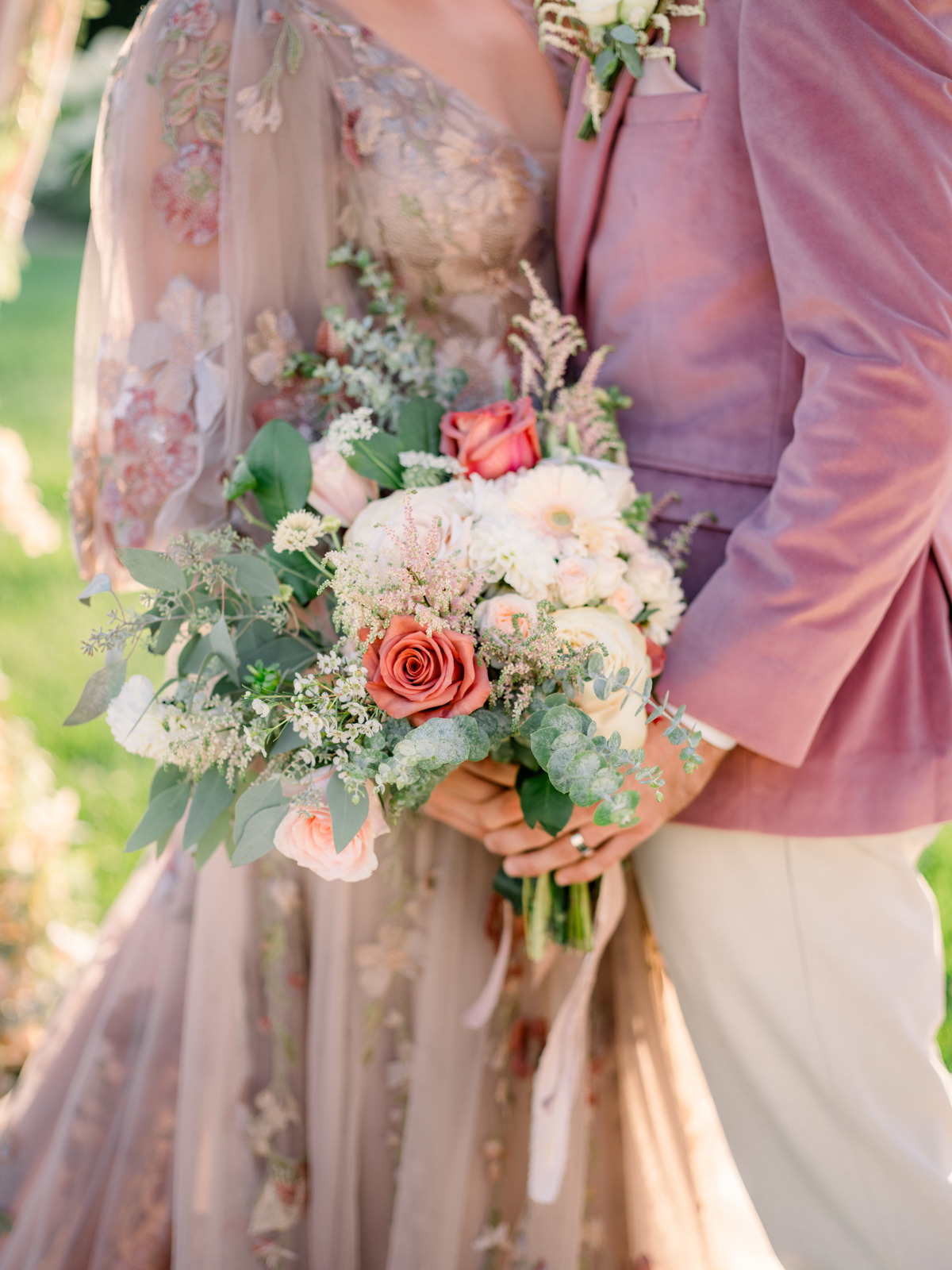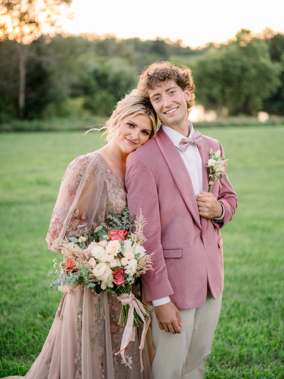 A flowery dusty pink gown from Vera’s House of Bridals provided the perfect look for the bride. With its delicate embroidered flower detailing, plunging neckline, soft and ethereal tulle fabric, and romantic, billowing balloon sleeves, the gown was perfect for twirling, walking down the aisle, or cuddling up for a quiet moment to soak in the day.
