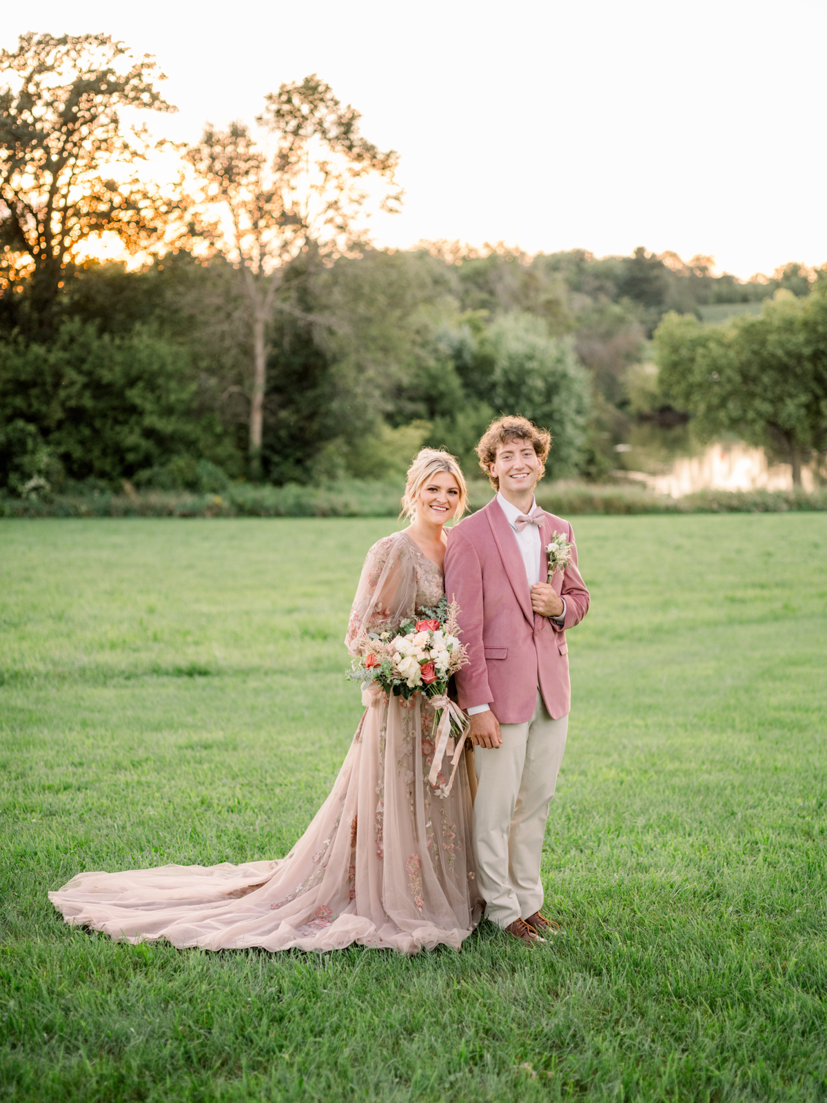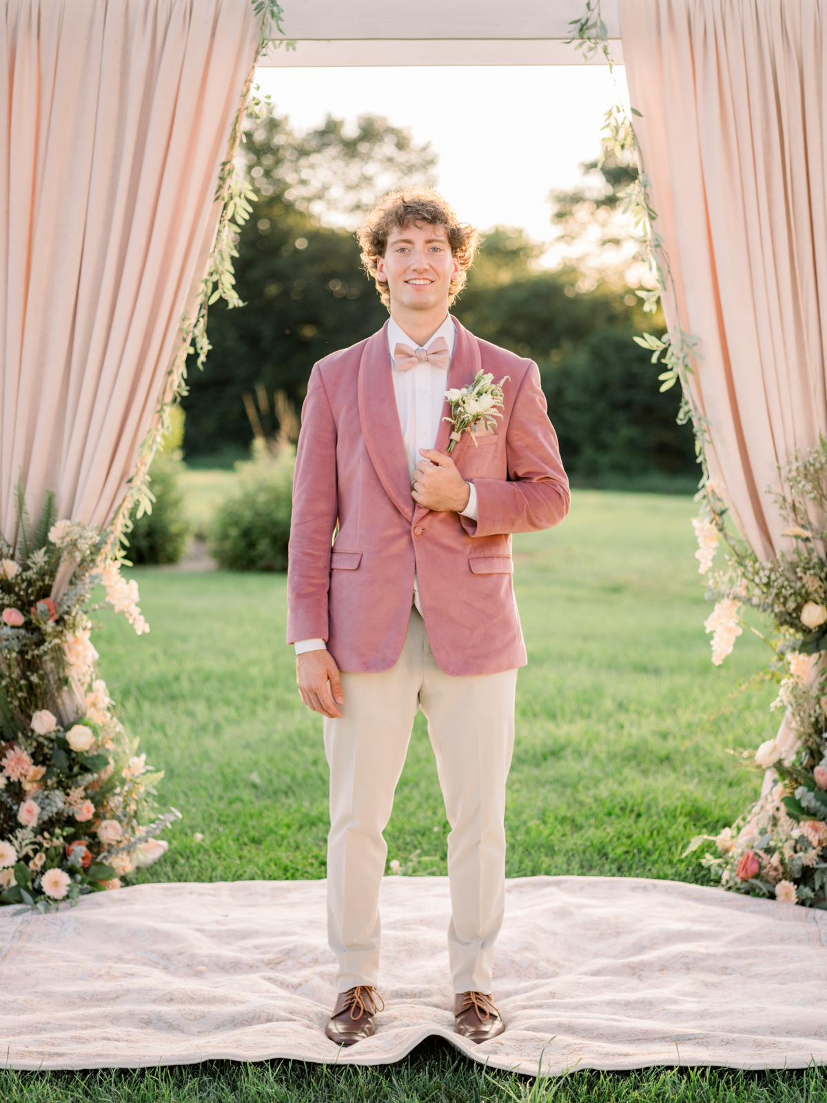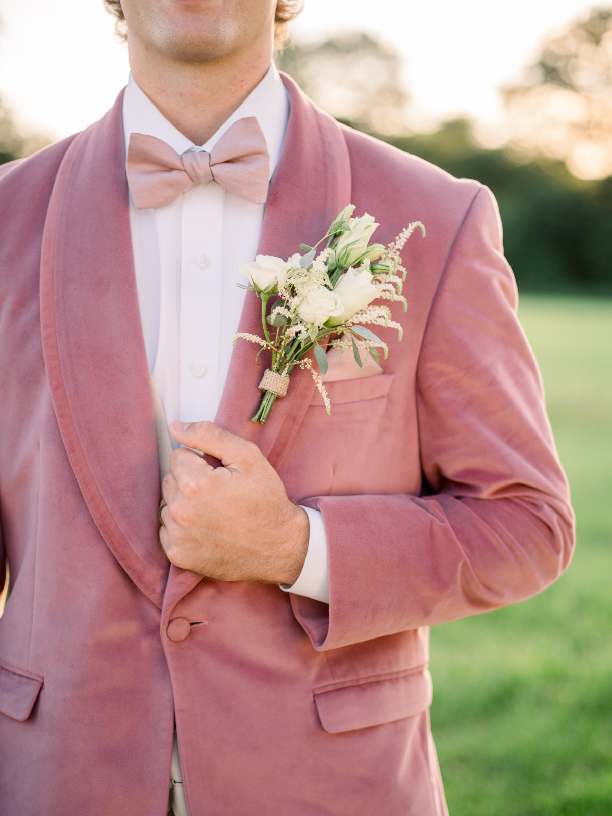 To create a subtly bold and cohesive ensemble, DuBois Formalwear styled the groom in a complementary pink velvet jacket paired with a matching pale pink bowtie and pocket square, tan pants, and brown shoes.