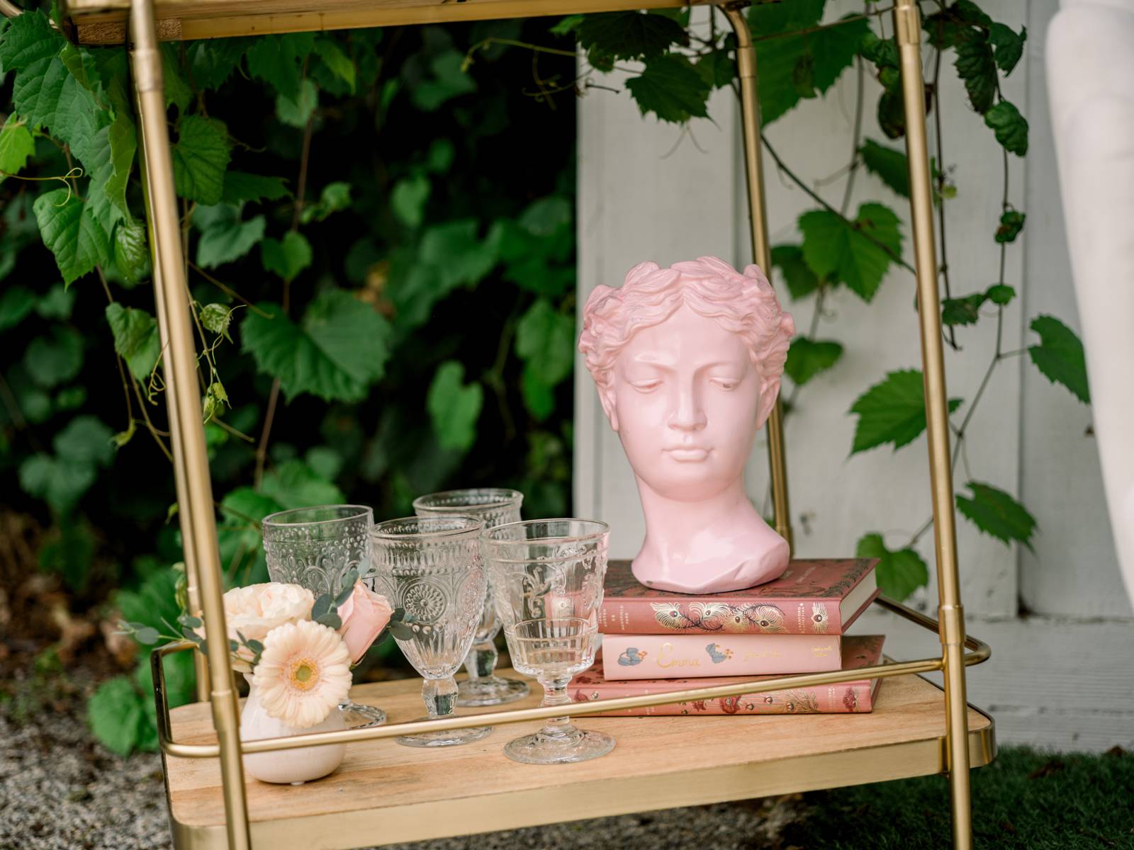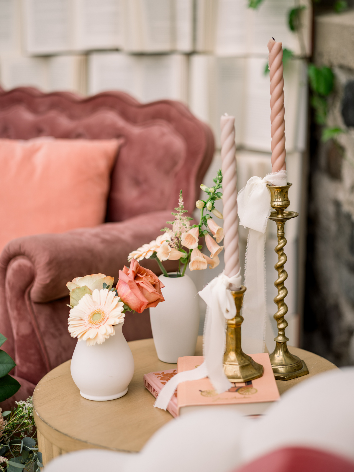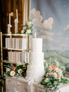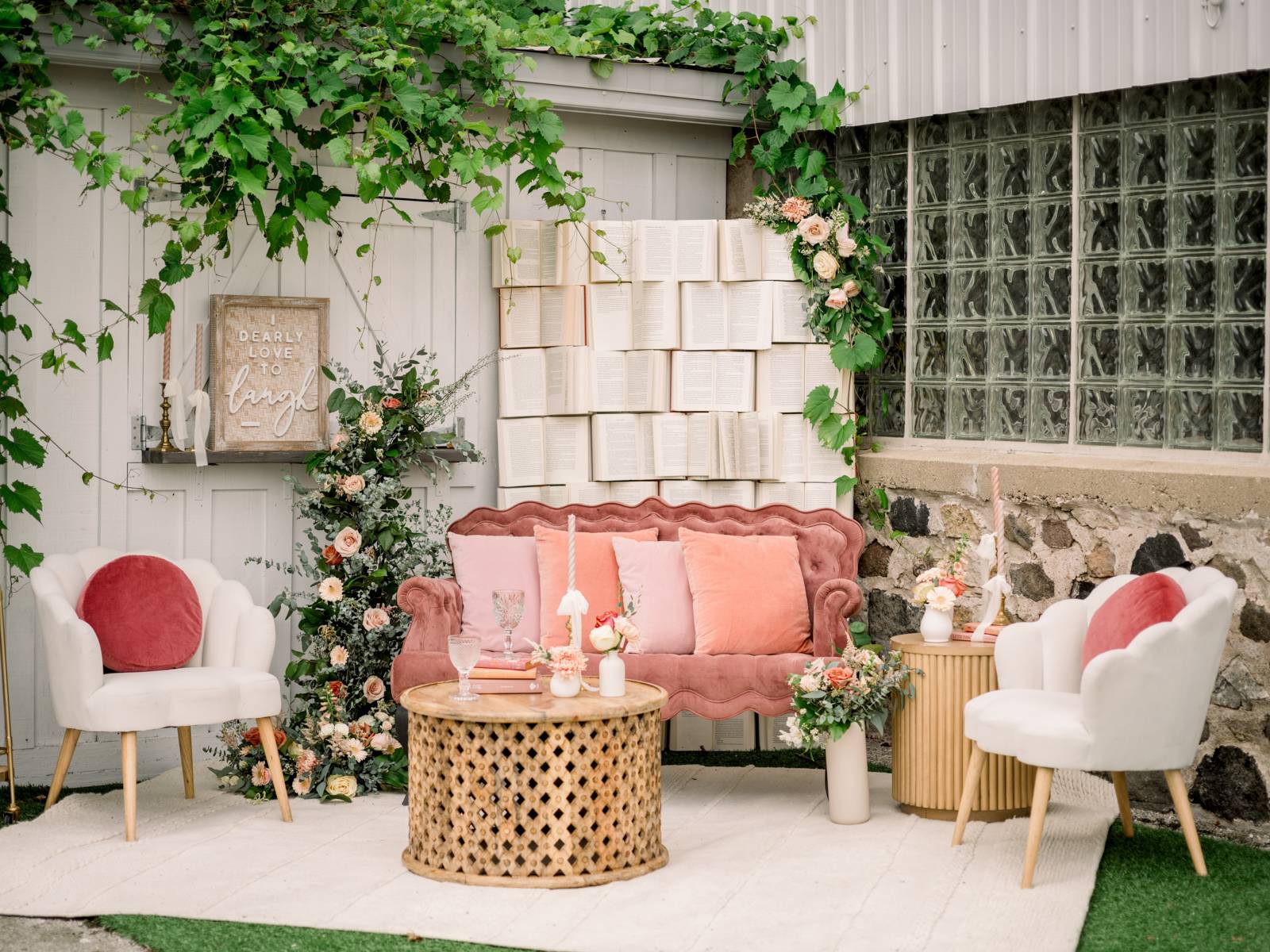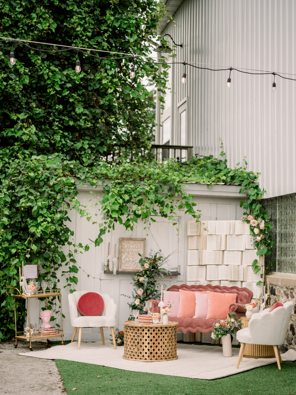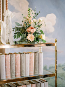 The outdoor lounge area created the perfect cocktail corner, where guests could enjoy sipping on signature drinks while relaxing in cozy seating that encouraged mingling. The showstopping book wall backdrop added a fun literary touch, enhancing the celebration’s enchanting atmosphere.