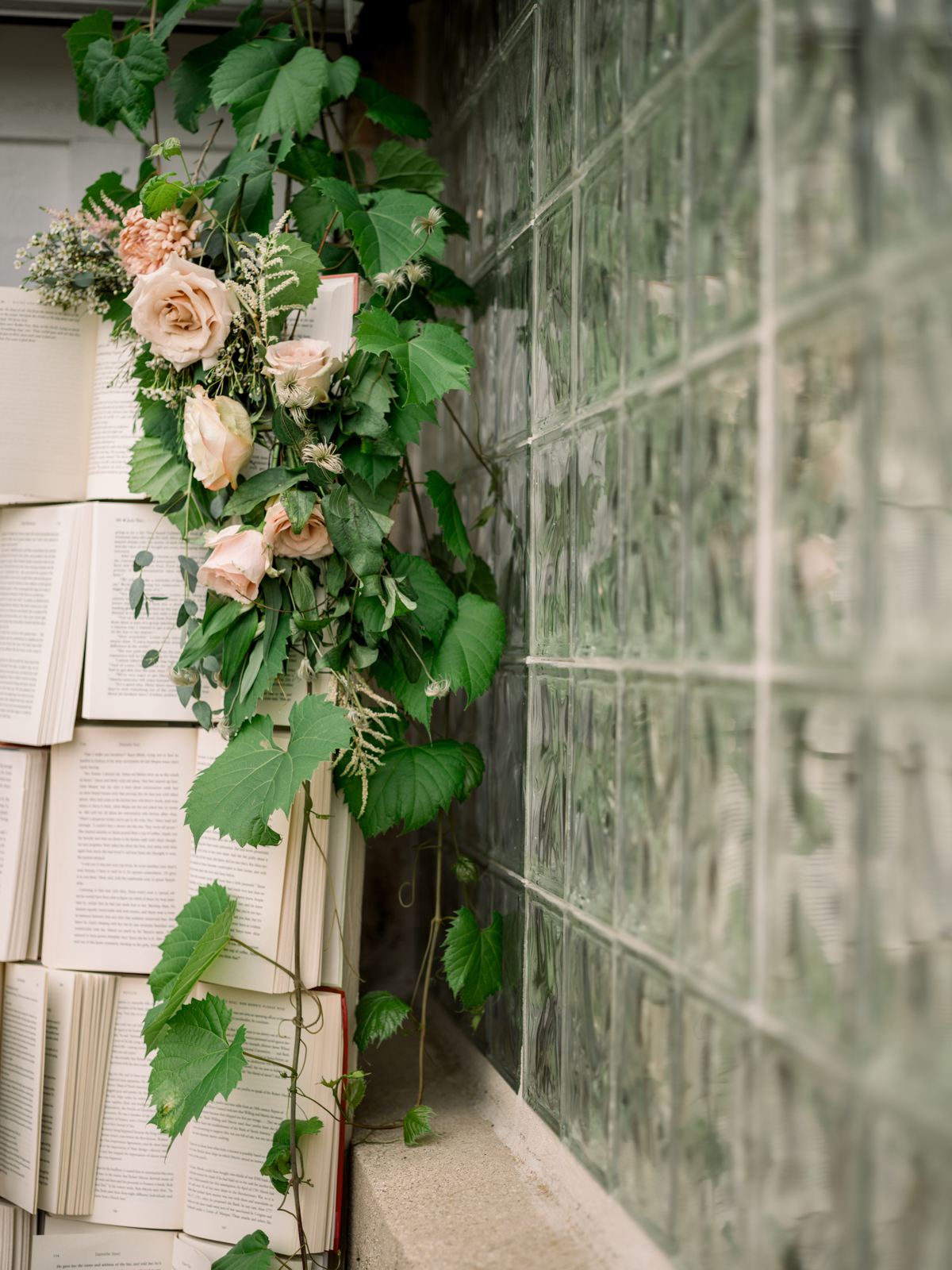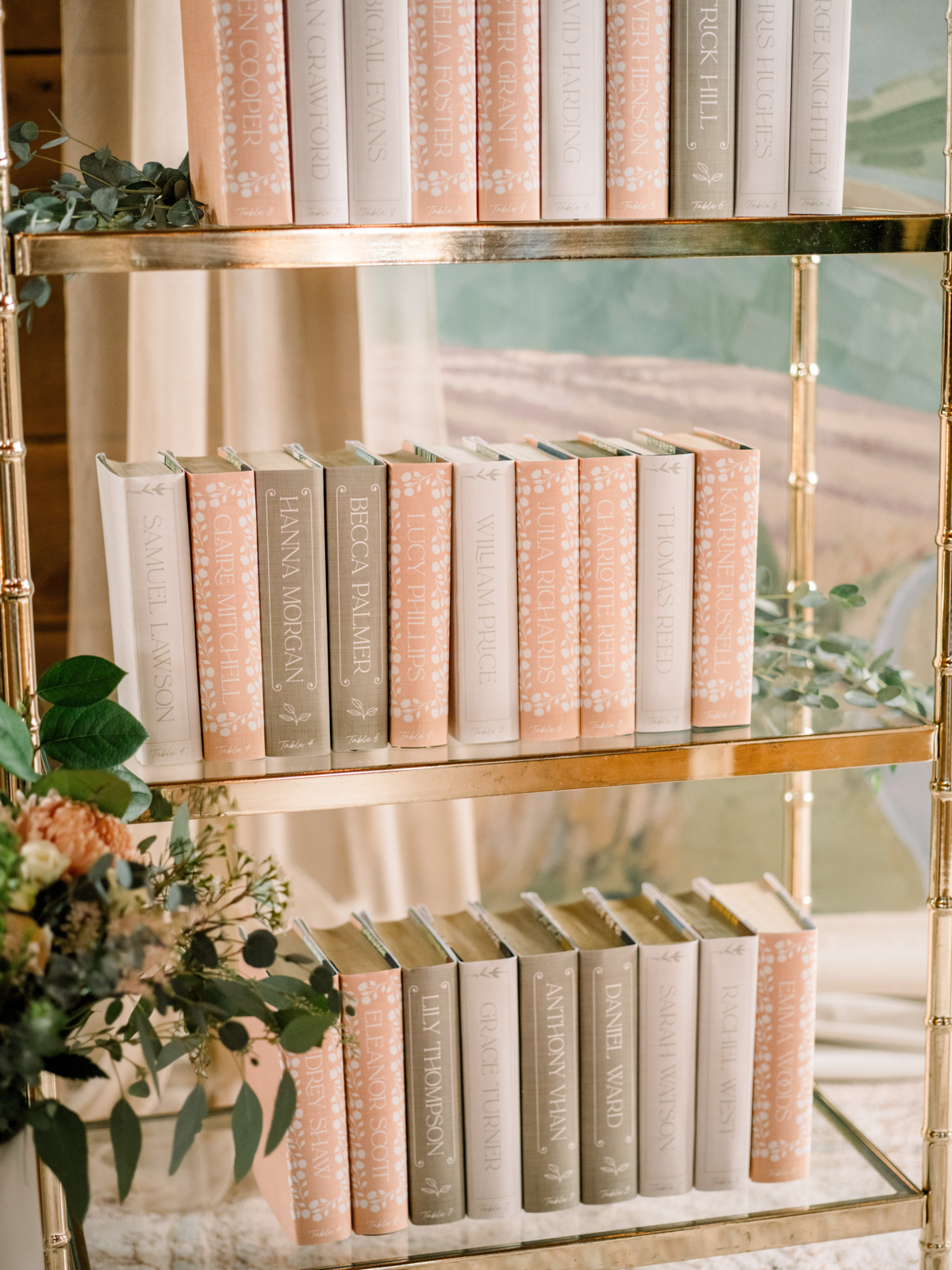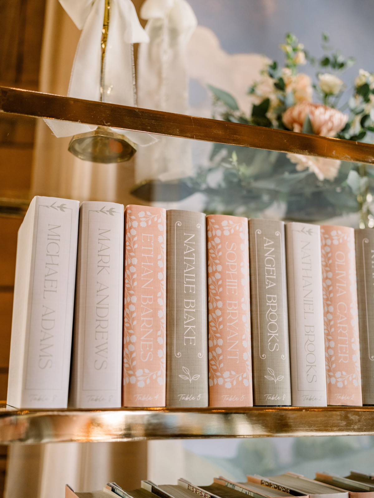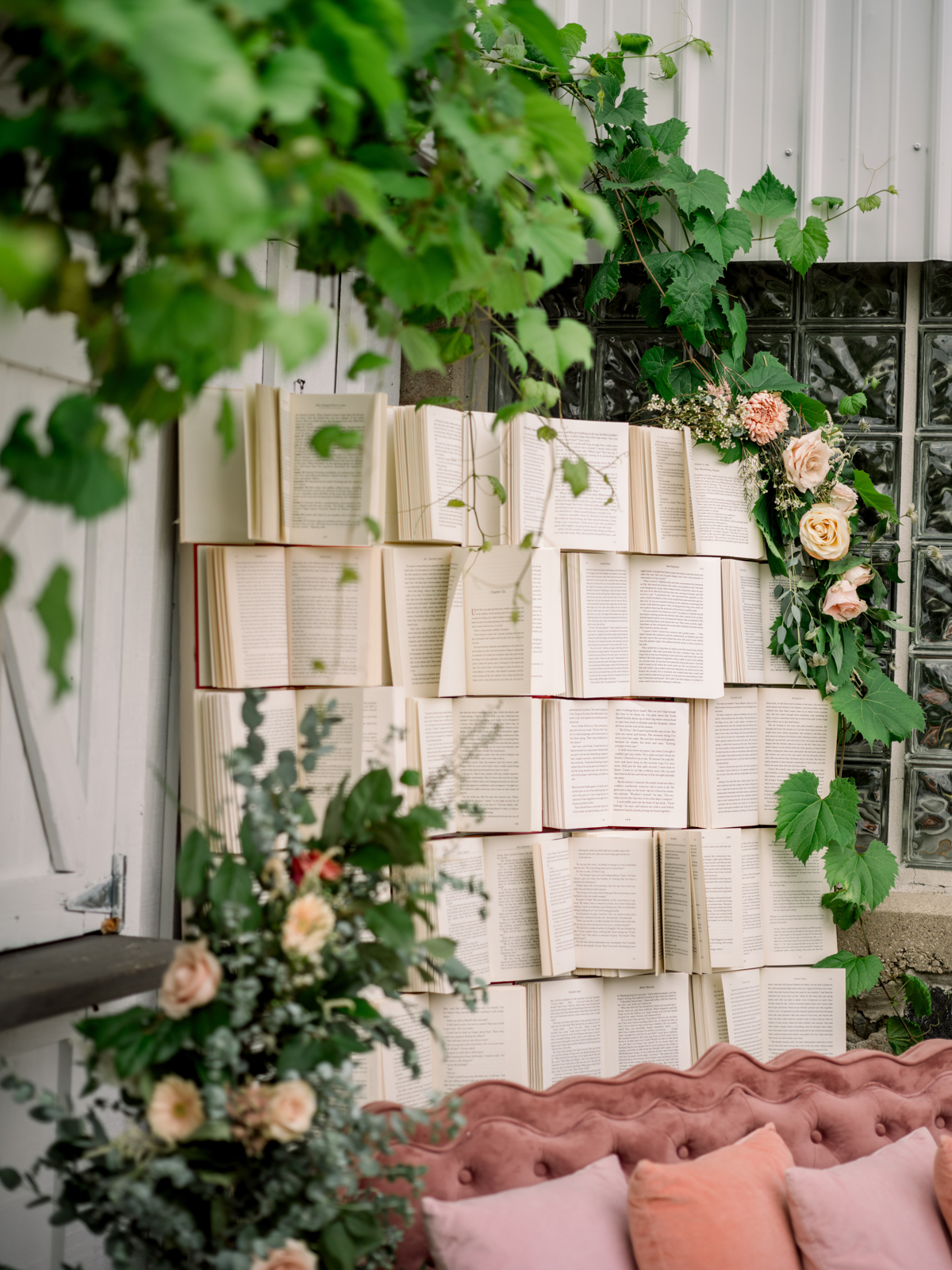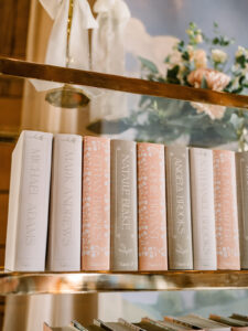 A book wall backdrop offered a whimsical photo op at the entrance before and after the ceremony. Once inside, an interactive welcome book greeted guests and invited them to write and seal personalized notes to the couple to open on their first wedding anniversary. Custom-designed wrapped books with decorative spine elements, color-coded to meal choices, guided guests to their seats and doubled as thoughtful favors. At each table, double-layered, embossed bookmark name cards and framed t