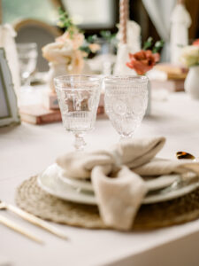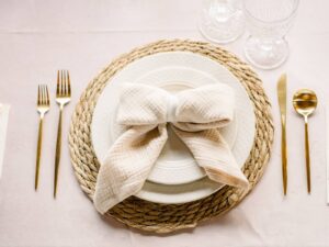 Event Essentials elevated the reception table with a perfect blend of classic elegance and textured warmth. Light pink velvet tablecloths created a soft, luxurious base, while natural Rustico napkins tied into charming bows added depth and texture. Classic ivory dinner and salad plates provided a refined foundation, enhancing the romantic and timeless vibe.