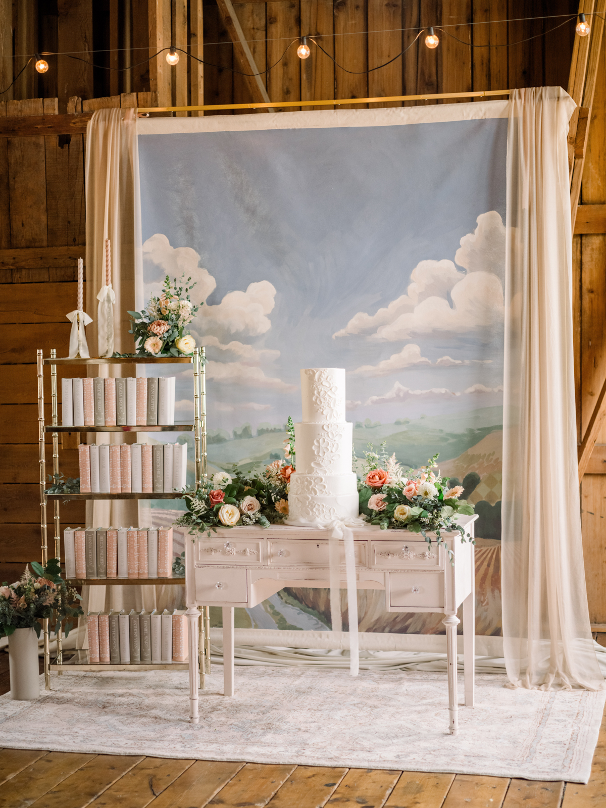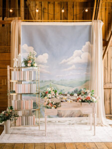 Castle Walls Wedding added a unique touch of artistry to the celebration with their hand-painted “Checkered Hills” mural, which served as the perfect backdrop for the cake and dessert displays. This serene Wisconsin landscape, painted in soft pastel hues, captured the essence of the region’s beauty. The mural featured a subtle checkered pattern in the hills and stripes of farm fields, bringing the outdoors in and creating a lovely, inviting atmosphere.