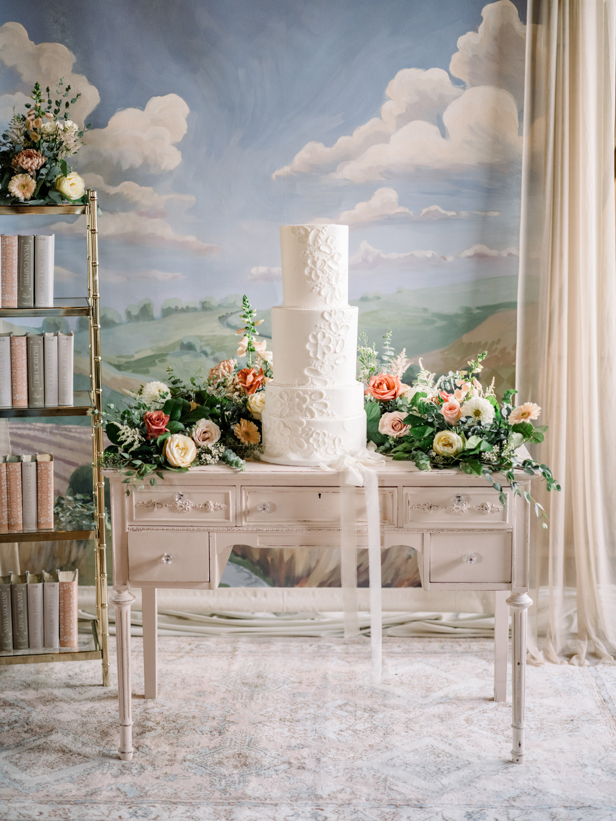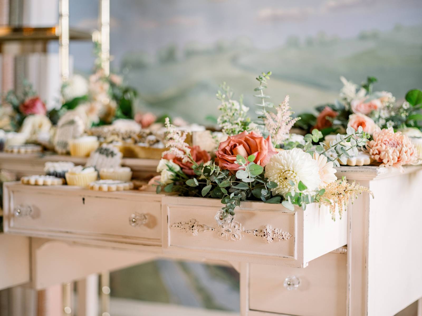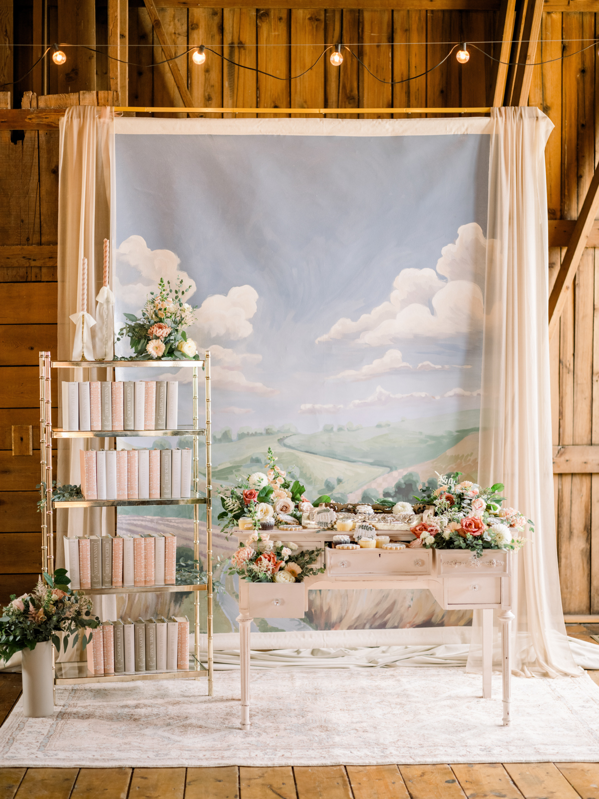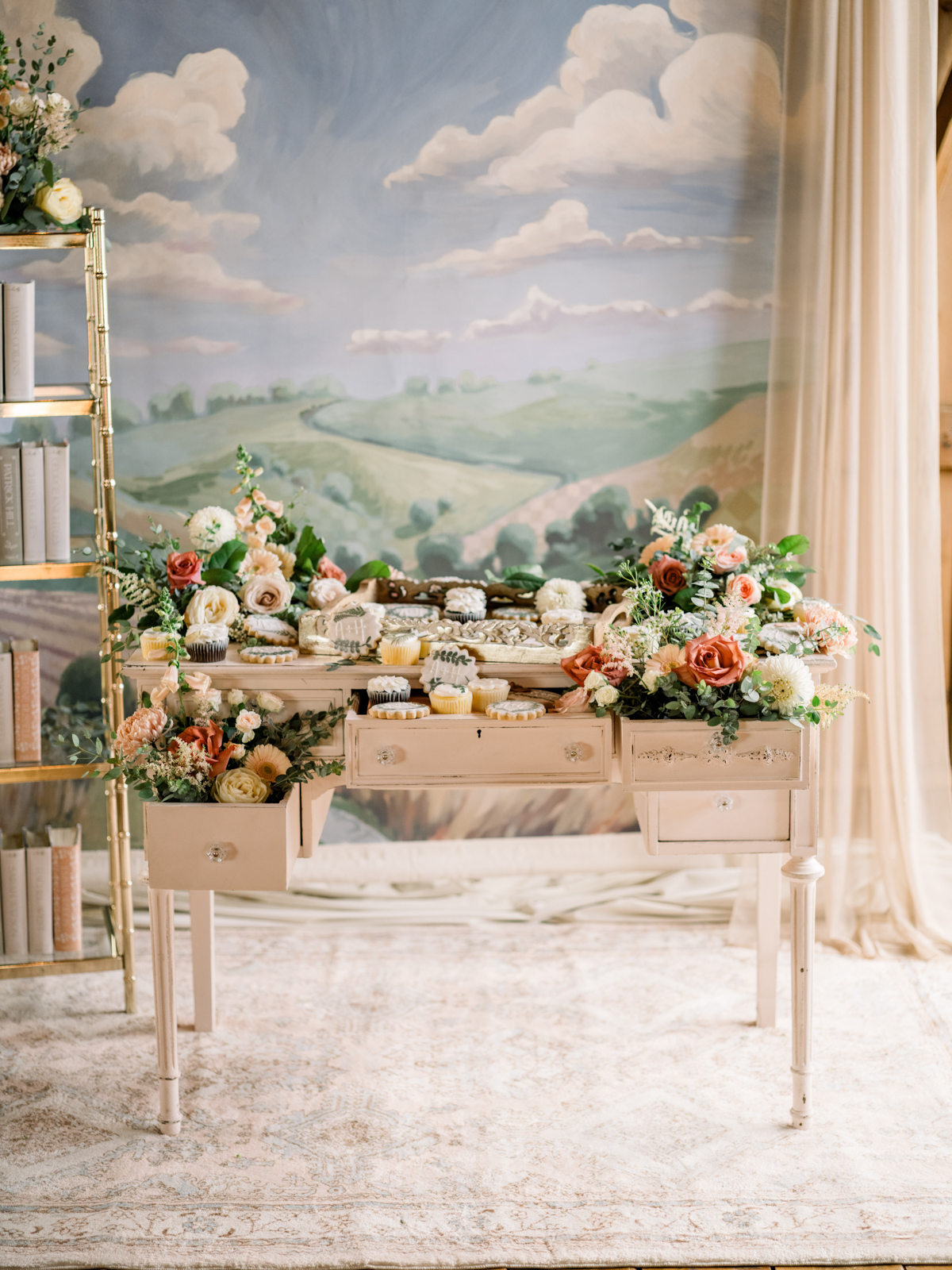 From the beautifully designed lounge area to the soft, inviting rugs, French dining chairs, antique brass shelving, gold flatware, accent decor, and more, Velvet Rentals helped create a timeless, stylish space that radiated romance and refinement with their unique rental pieces. The blush pink Emma Desk, a perfect vintage-inspired piece, served as the guest sign-in area before transforming into an elegant dessert display.