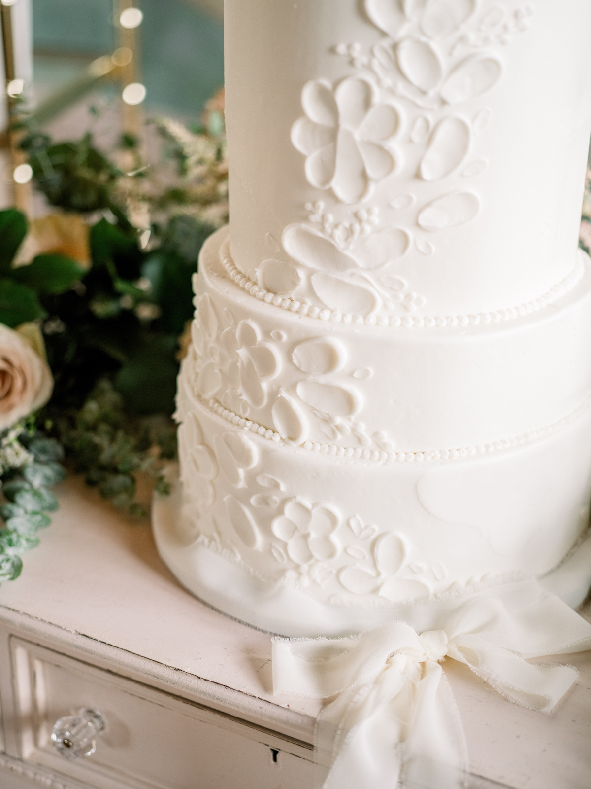 A stunning 4-tier white cake from Sandy Kakes stood gracefully in a “cake nest” of soft blooms, becoming a captivating centerpiece for the reception. Adorned with a monochromatic floral pattern, the cake exuded elegance and charm. Also including custom cookies and cupcakes featuring an array of delicate details from lettering to dried greenery, the dessert display was both a visual masterpiece and a delicious indulgence.