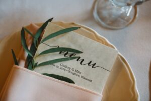 DID YOU USE ANY SPECIALTY CHAIRS, LINENS, GLASSWARE OR DINNERWARE? The chairs were cream chiavari from The Fields Reserve that are a bit distressed. There were also blush colored napkins on all the tables with menus inside of them along with eucalyptus tucked inside. The parent’s table as well as the head table had wine waxflowers in addition to the eucalyptus in their napkins. All of our dinnerware and glassware were vintage, mismatched china dishes that our caterer provided. We loved this as it went with our theme and really brought some individuality and charm to our dinner.