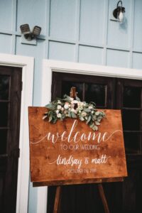 We had some fun directional signs placed at our reception venue (The Fields Reserve) as well as a custom wood welcome sign with our names and date on it right outside of the main entrance. There have been many beautiful weddings at The Fields Reserve, but we wanted to customize ours and do something no one else has. We added café lights in the middle of the barn over the dance floor, cascading among the chandeliers, as well as soft amber uplighting throughout the entire barn. We also (with the help of the very talented Chance Productions) created a custom pole that was the length of the outdoor patio (110 feet) so we could hang sheer drapery to the posts and connect them with beautiful greenery mixed with floral and string lights. It added a layer of elegance that really accented the beauty of the outdoors.