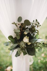 DESCRIBE YOUR WEDDING FLOWERS: A beautiful mix of greenery and floral. They mimicked our theme of rustic and elegant perfectly. They were mostly light in color (ivory and blush) with pops of wine, blue thistle and berries. I wanted all the bouquets and arrangements to look very “textured” and that they had a lot of depth.