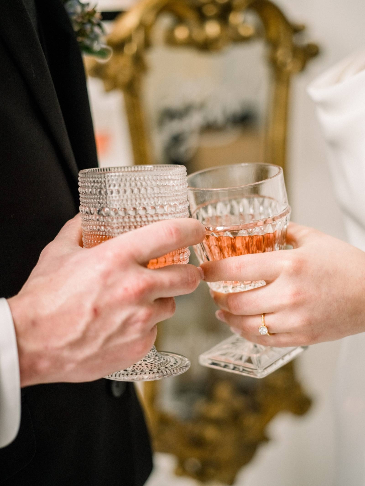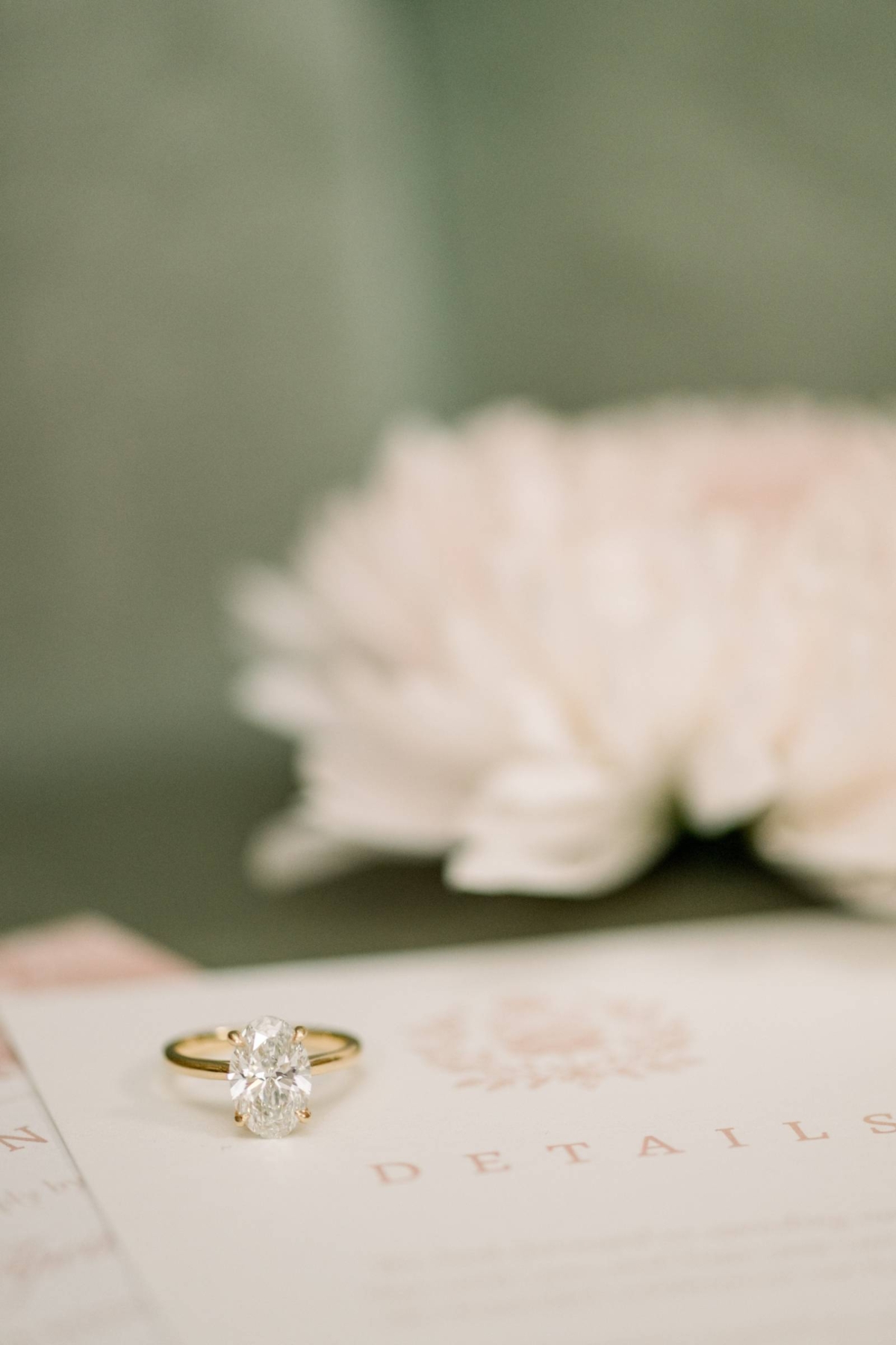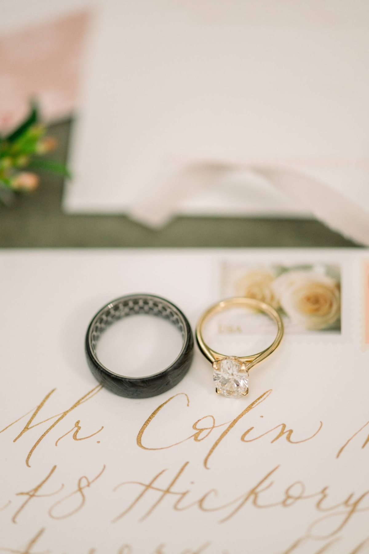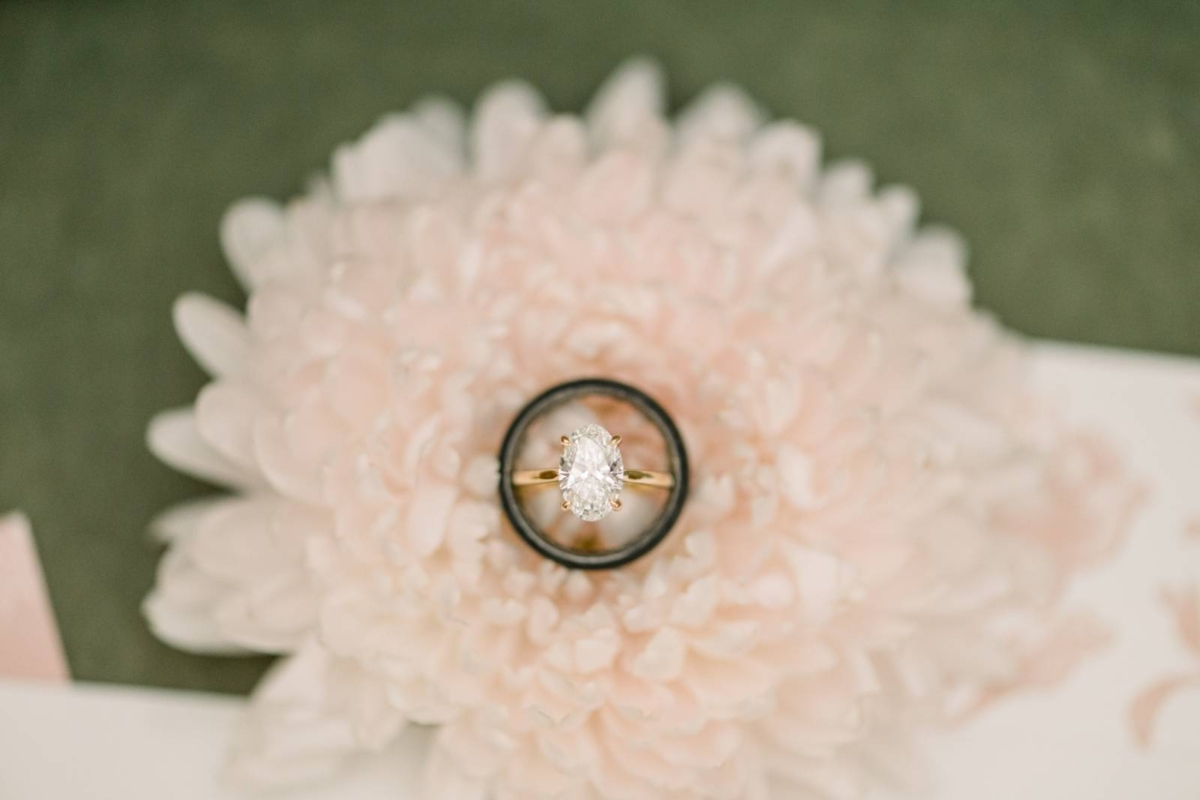 For the bride, Soha Diamond Company brought an oval-cut solitaire diamond ring in yellow gold. The groom wore a black band with subtle texture.