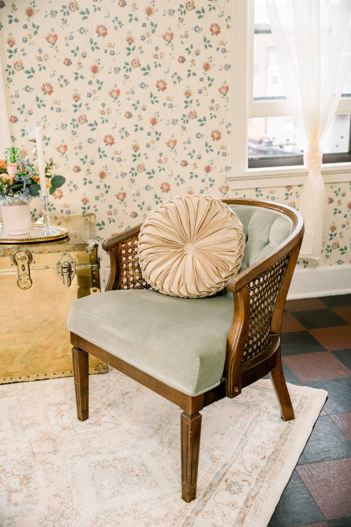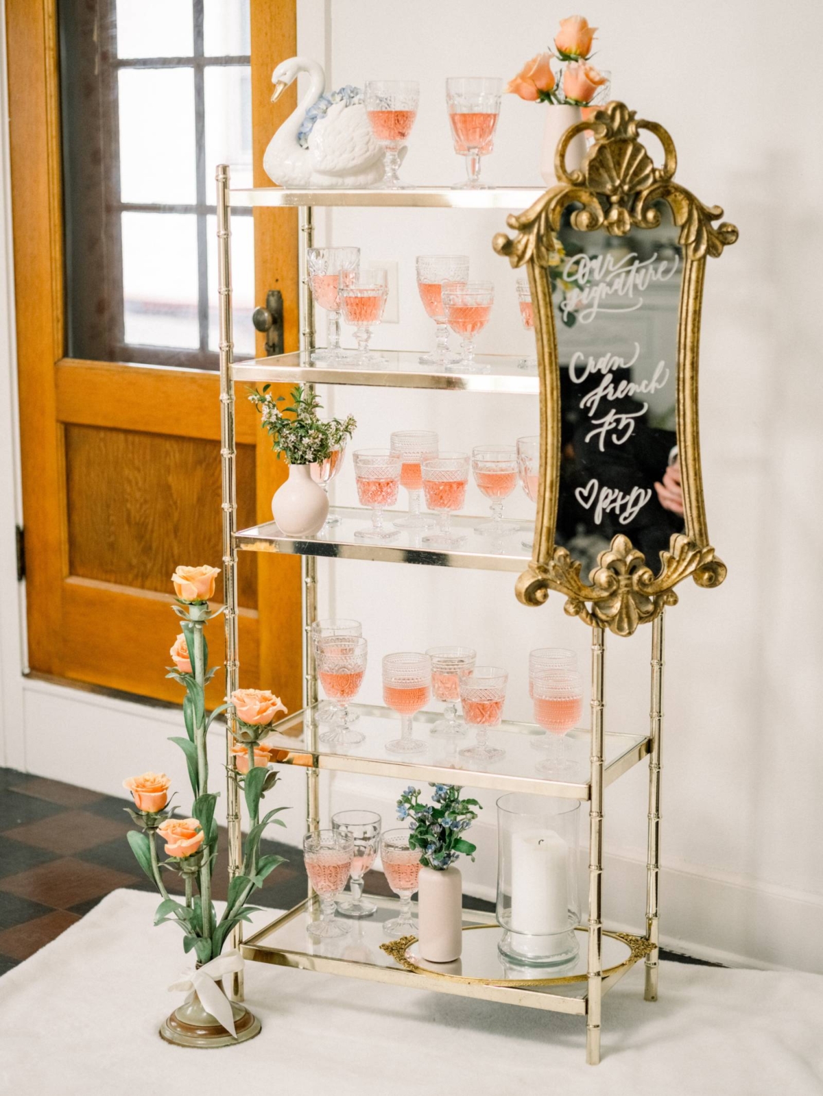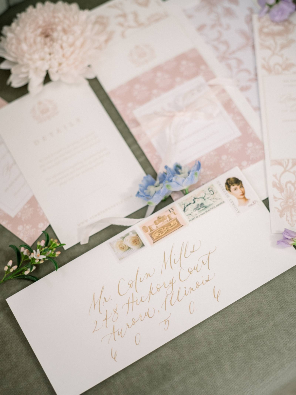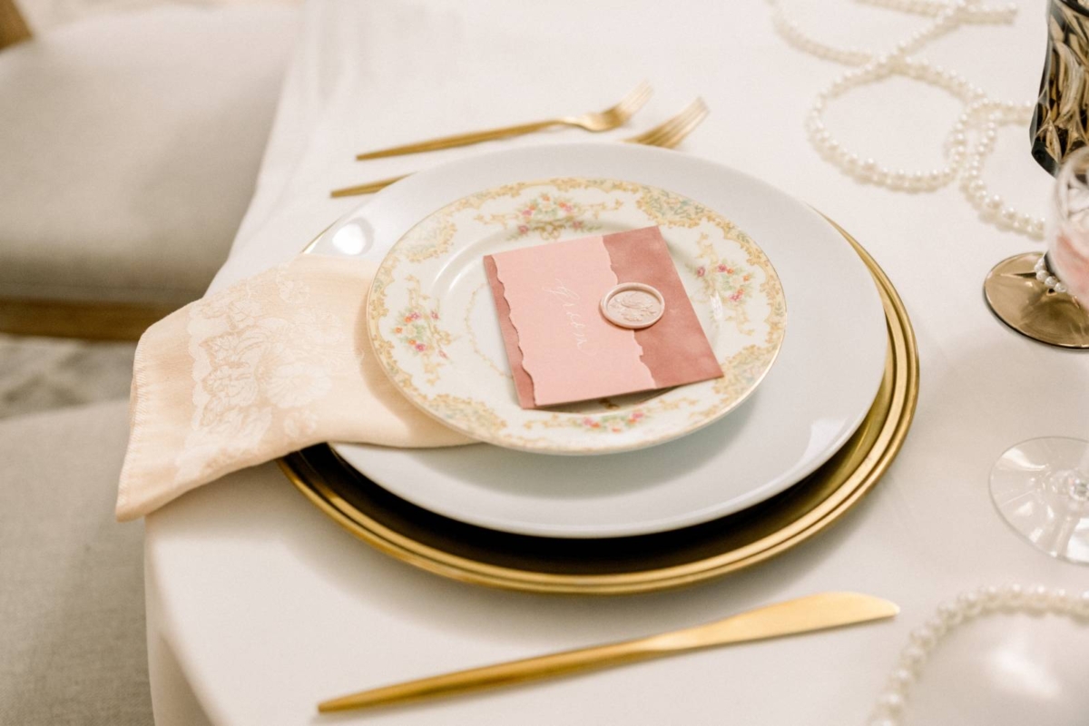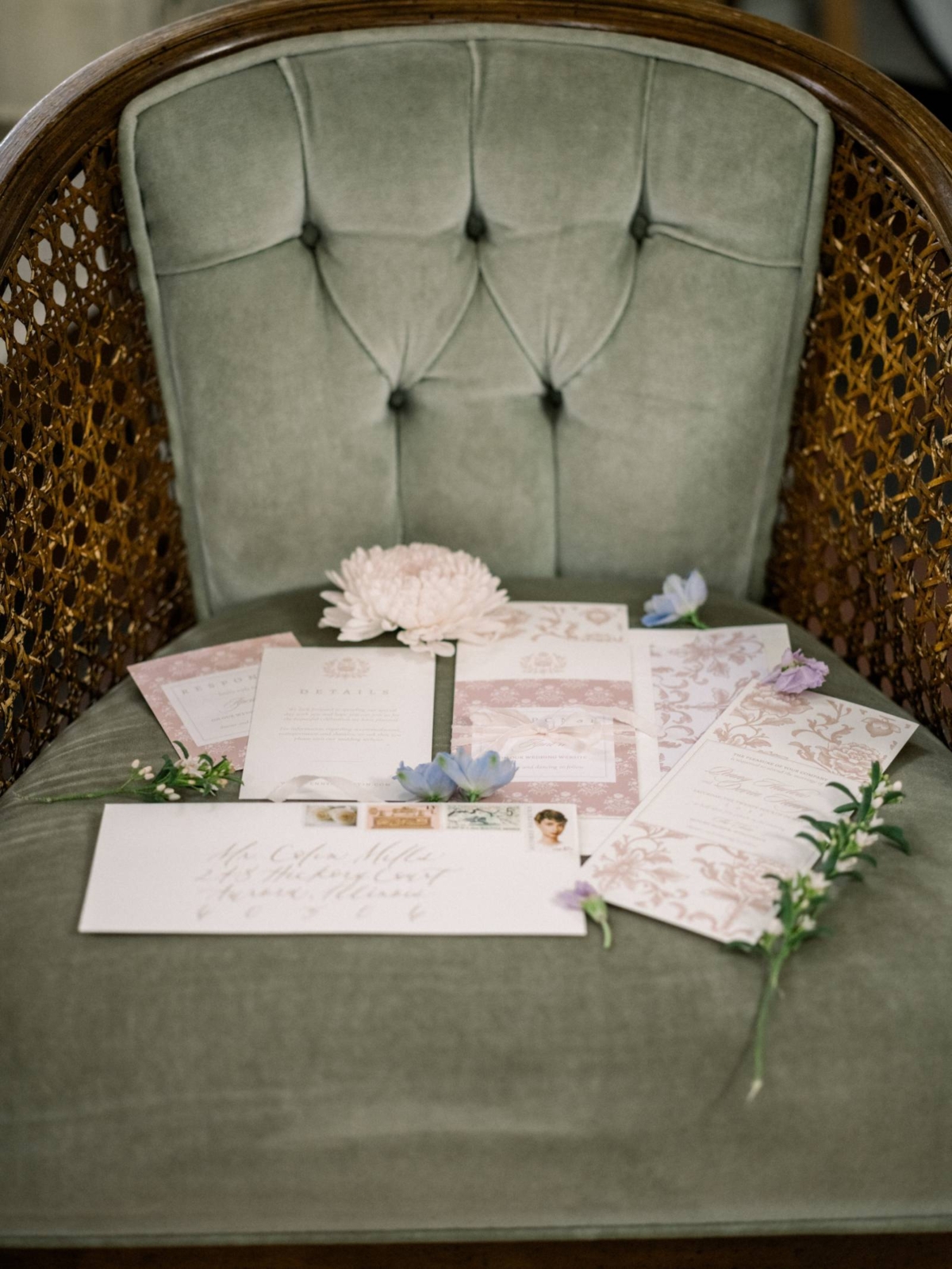The stationery suite, designed and calligraphed by Lettered By Shi, set the tone for a soft spring celebration. Pieces included an invitation, a details card, an RSVP, an envelope, and an envelope liner. The unique suite was designed to fit into a longer envelope, breaking the tradition of a 5×7". The pieces featured soft pink detailing and vintage patterns, a tasteful mix of script and serif fonts, as well as hand calligraphy in gold ink on the envelope. Before being placed into the envelope, the suite was secured with a pink ribbon.