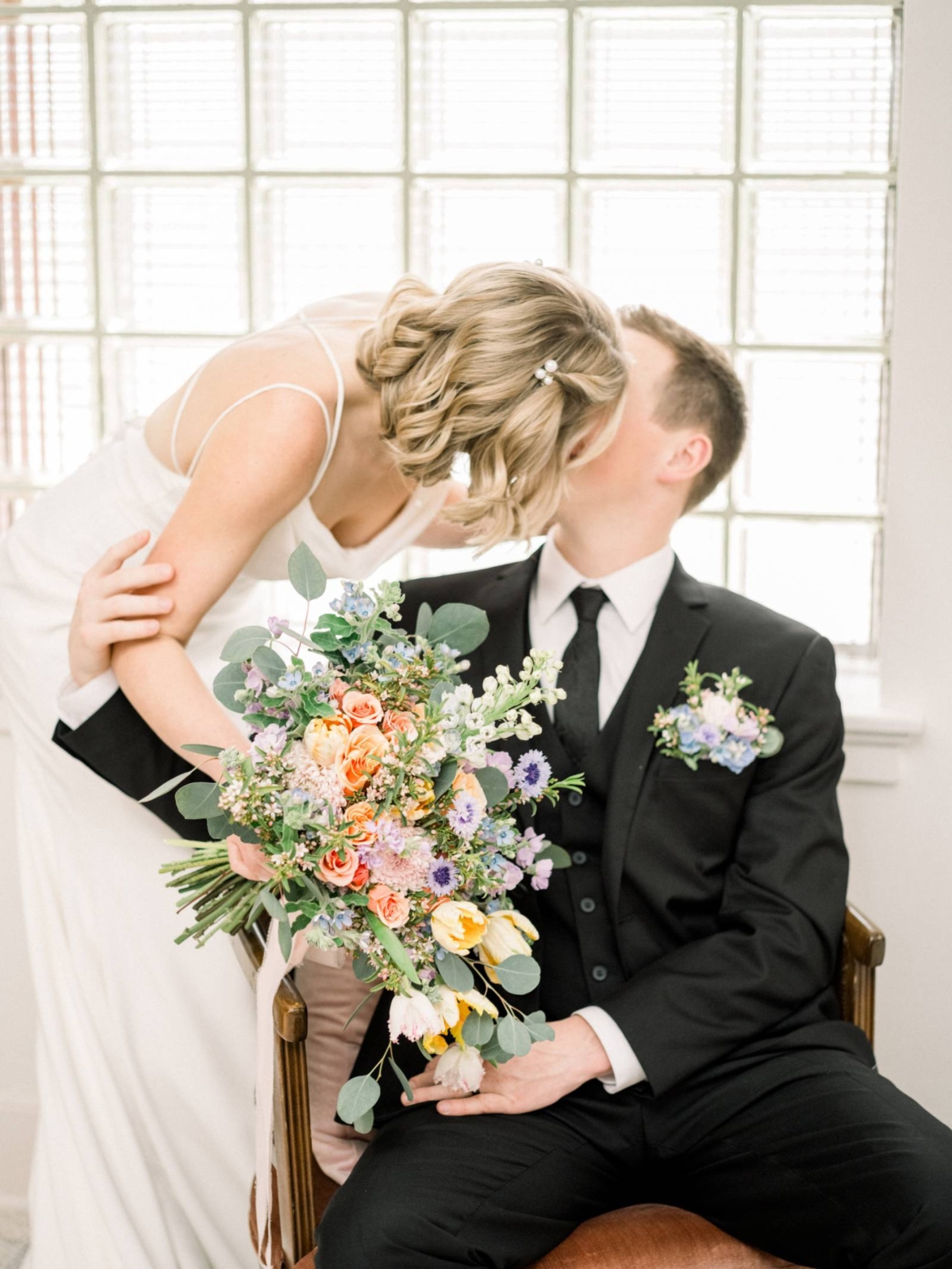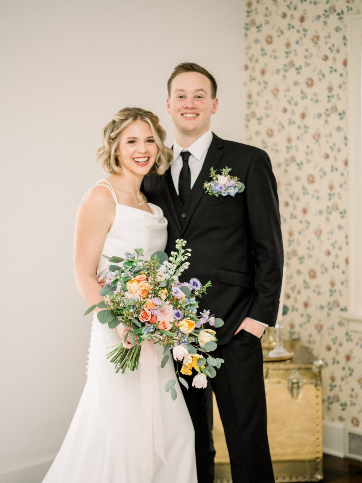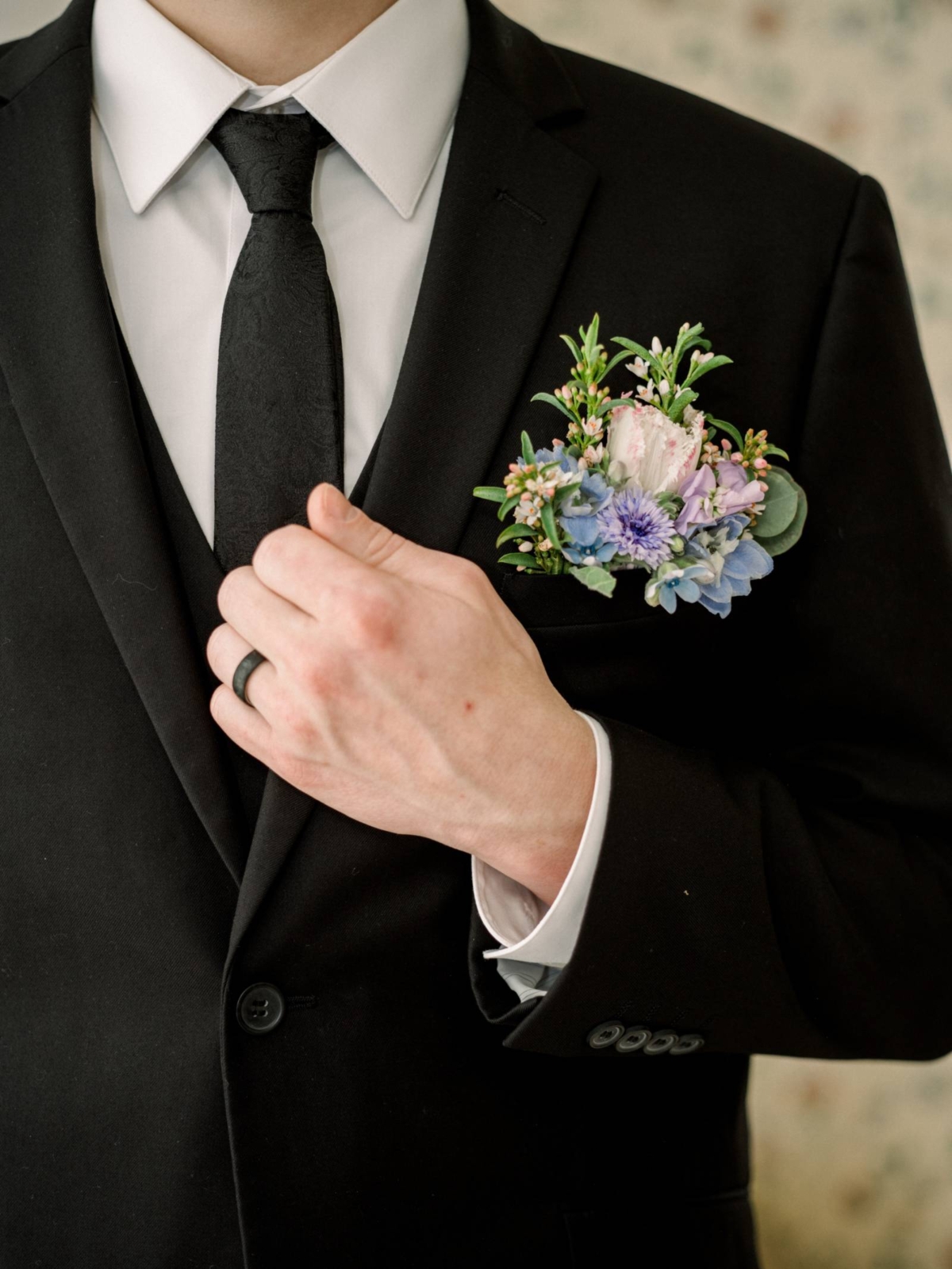 Colton was styled in a luxe black suit, black vest, crisp white undershirt, and accessorized with black shoes and a black patterned tie. He also wore a floral boutonniere pocket square with blooms that matched the bride's bouquet.