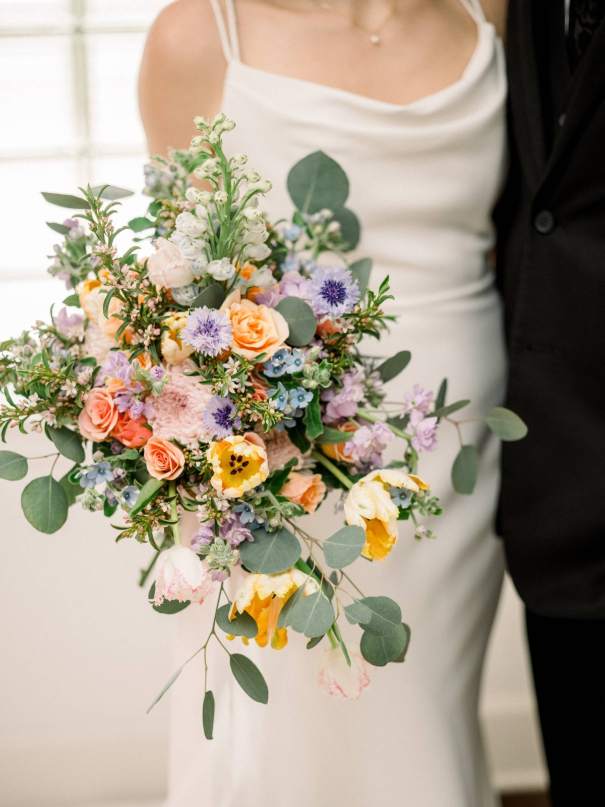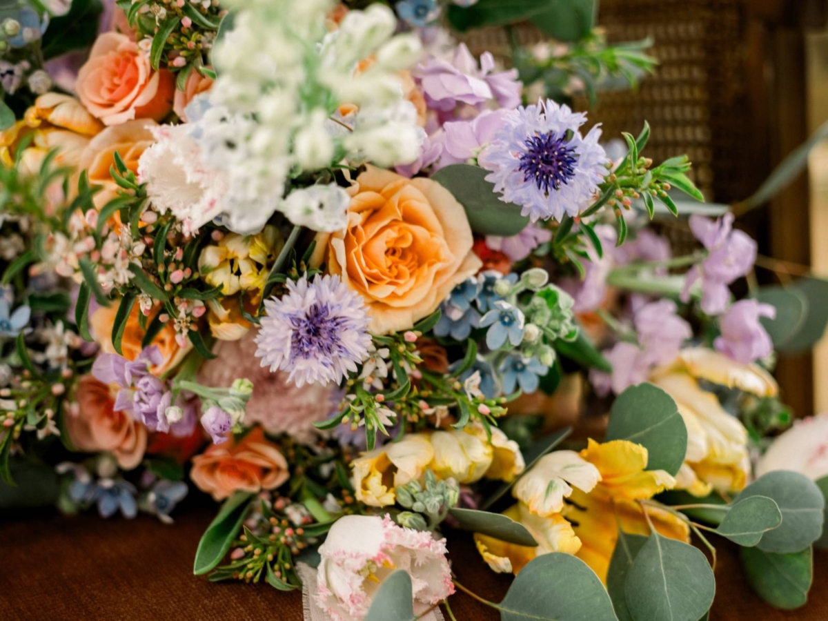 Florist Melody Rose Designs brought the design together with a cheerful, colorful bouquet for the bride, as well as smaller vases throughout the spaces. Florals included peach spray roses, creamy peach garden roses, lavender scabiosa, blue delphinium, white lisianthus, yellow tulips, lavender, waxflower, and eucalyptus leaves.