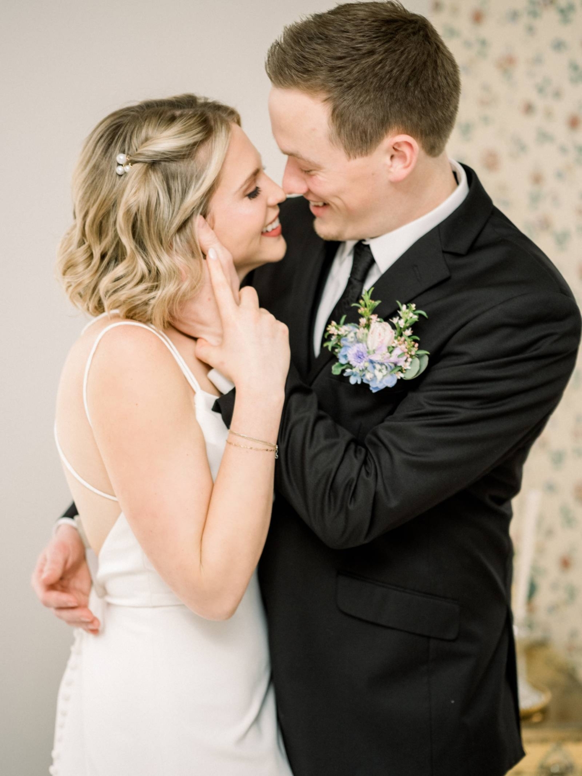 The bride wore an elegant, statuesque gown from Marah's Bridal. The gown featured sleek fabric, a cowl neck, thin straps, an open back, and a fit-and-flare silhouette. Lovely Elegance Hair and Makeup styled Libby's hair into loose waves that fell at her shoulders. A small portion of hair on either side was secured back with pearlescent clips, adding texture and volume. Makeup included a soft, smoky peach eyeshadow, subtle blush, and bold coral lip.