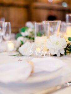 DID YOU USE ANY SPECIALTY CHAIRS, LINENS, CHARGERS, GLASSWARE OR DINNERWARE? We rented white farm tables to create a large king’s table in the center of the room, wood cross-back dining chairs, and pale blue linens.