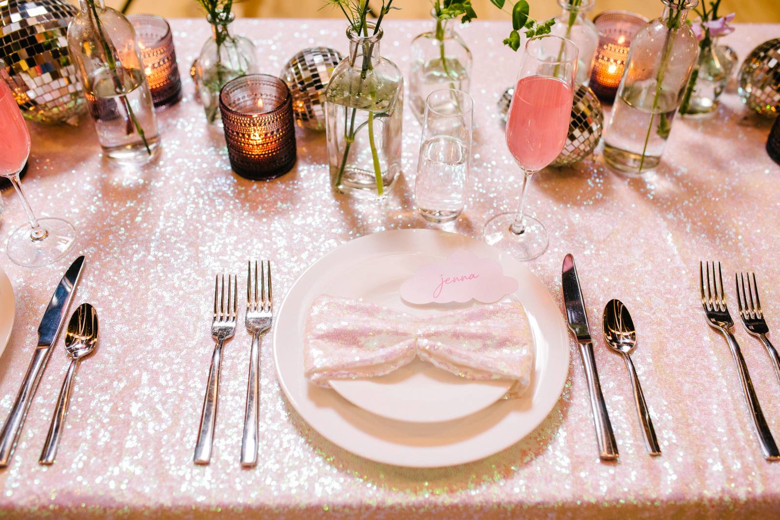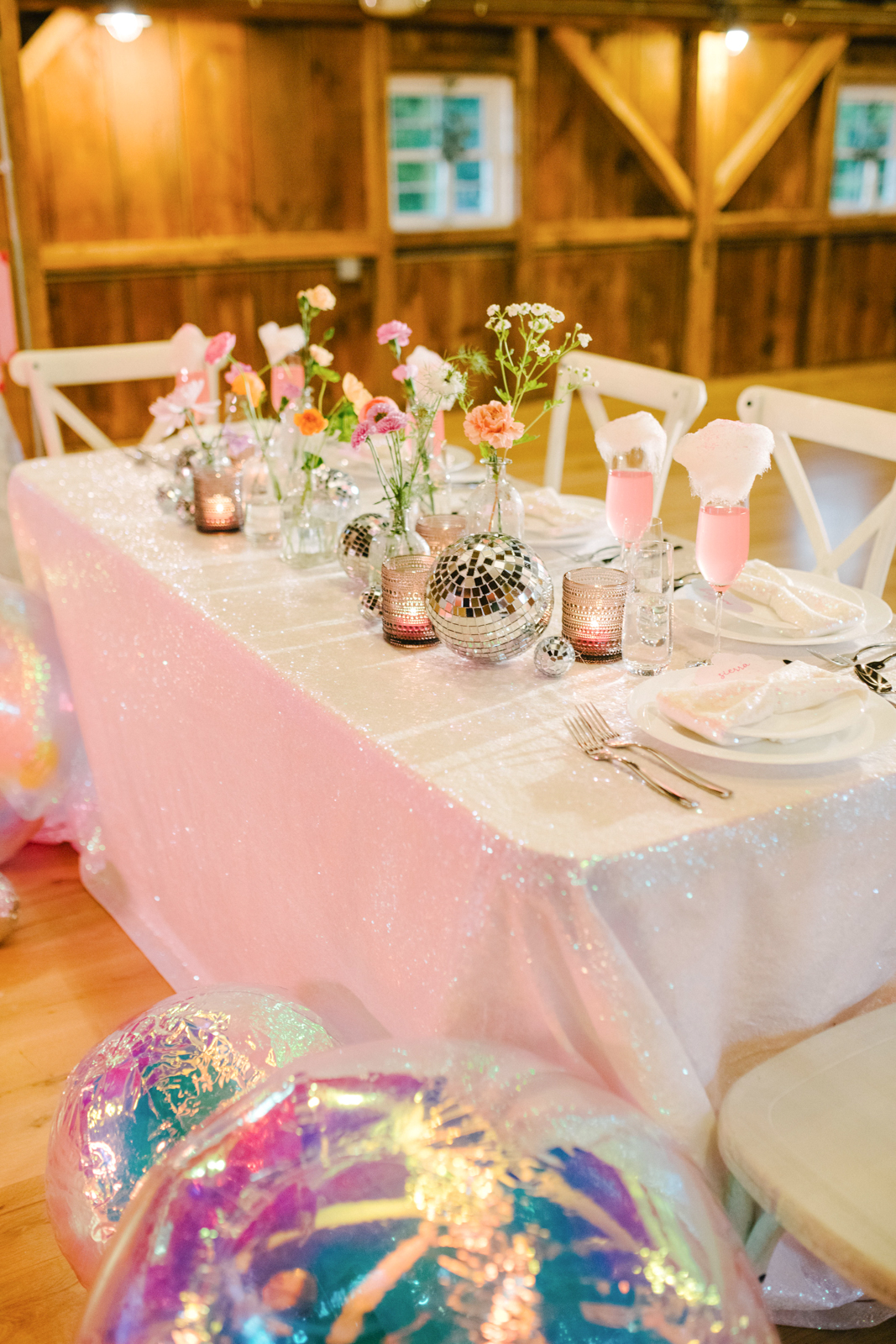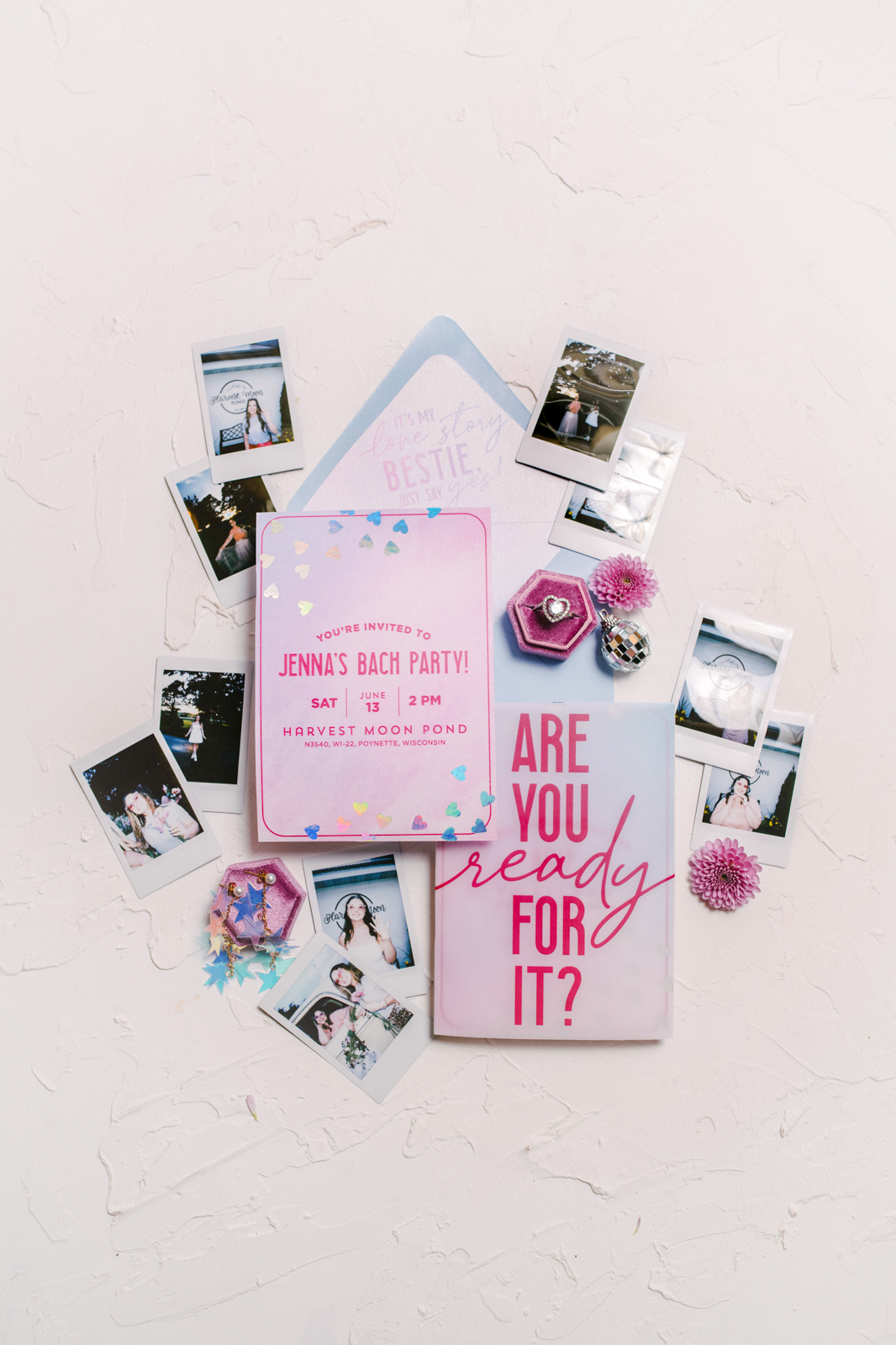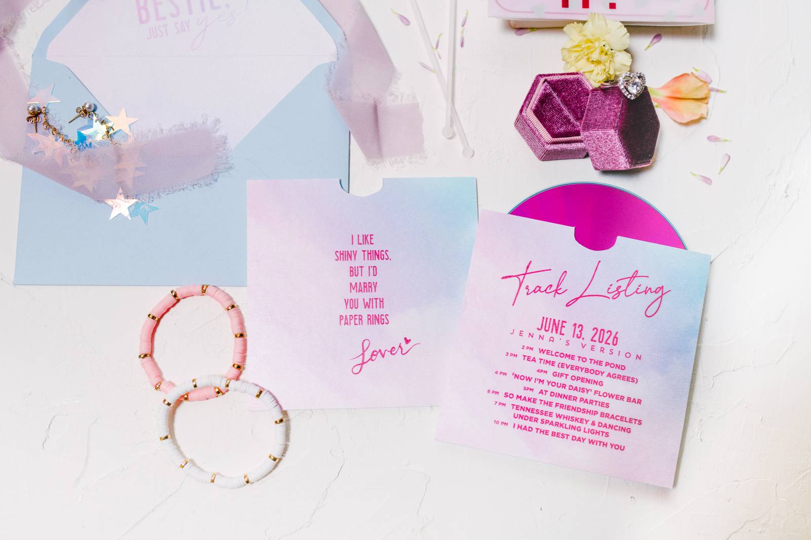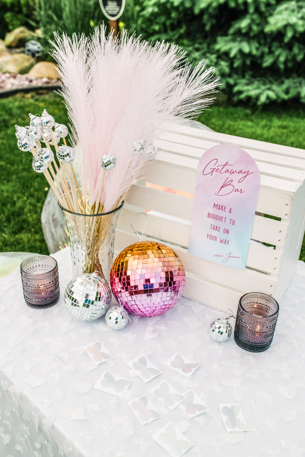 LK Bridal Studio kicked things off with a vellum-wrapped invitation suite designed to set an exciting tone for all the fun ahead! A hot pink, playful handwritten script font – reminiscent of Taylor Swift’s Lover album cover – was paired with bolder sans serif fonts, similar to those used for track listings. The invitation was sprinkled with holographic silver hearts, perfectly matching the disco balls and sparkly decor seen throughout the day. The rest of the suite featured lined envelopes, custom contour-cut cloud-shaped name cards, and even a CD sleeve itinerary card that doubled as a playlist keepsake. LK Bridal Studio also crafted custom concert-ready t-shirts for each bridesmaid to pair with a fun skirt to ensure everyone was dressed and ready for a night of celebrating their fellow Swiftie bride-to-be!