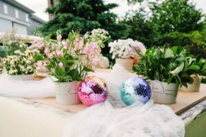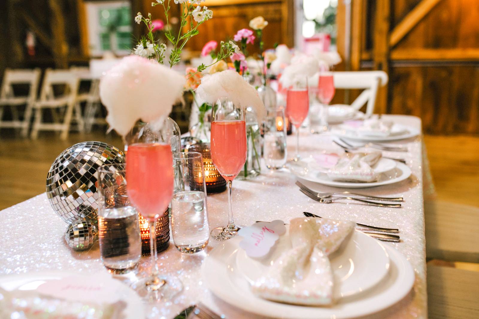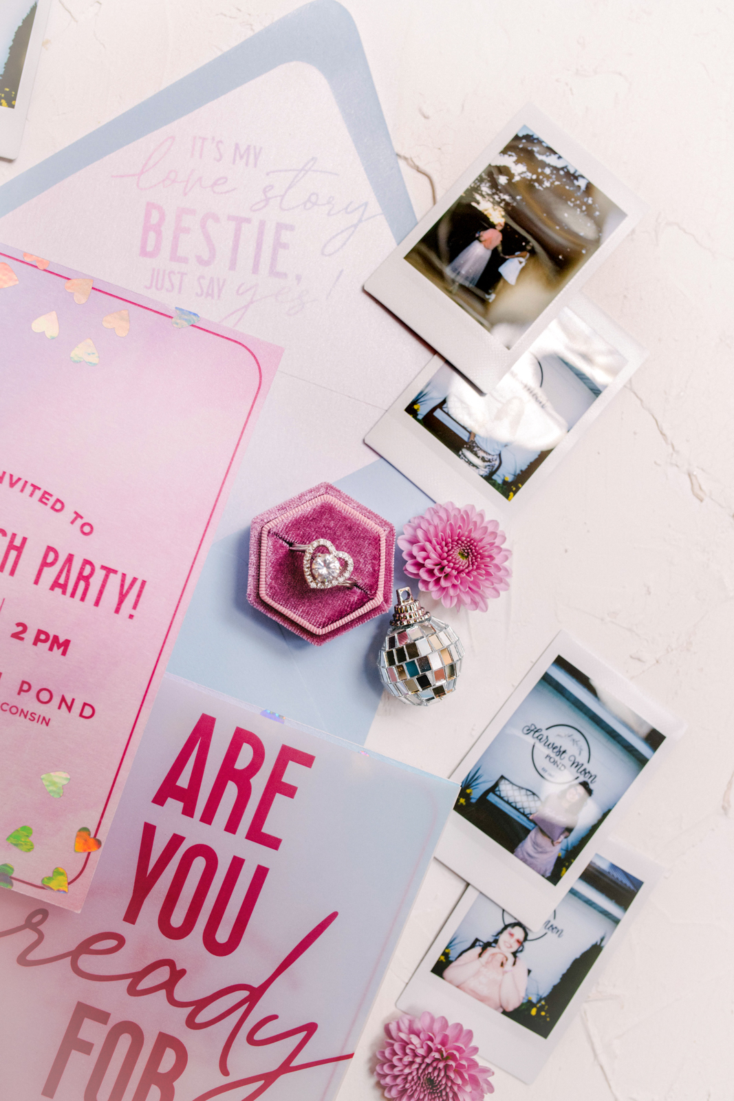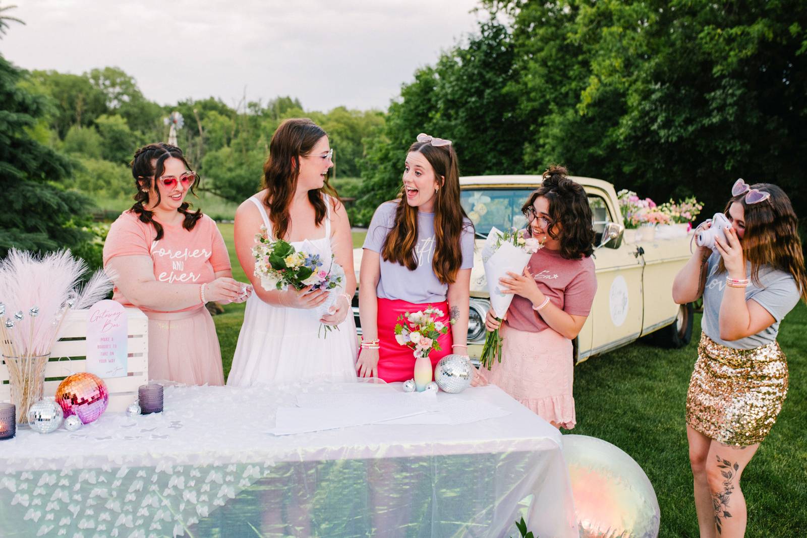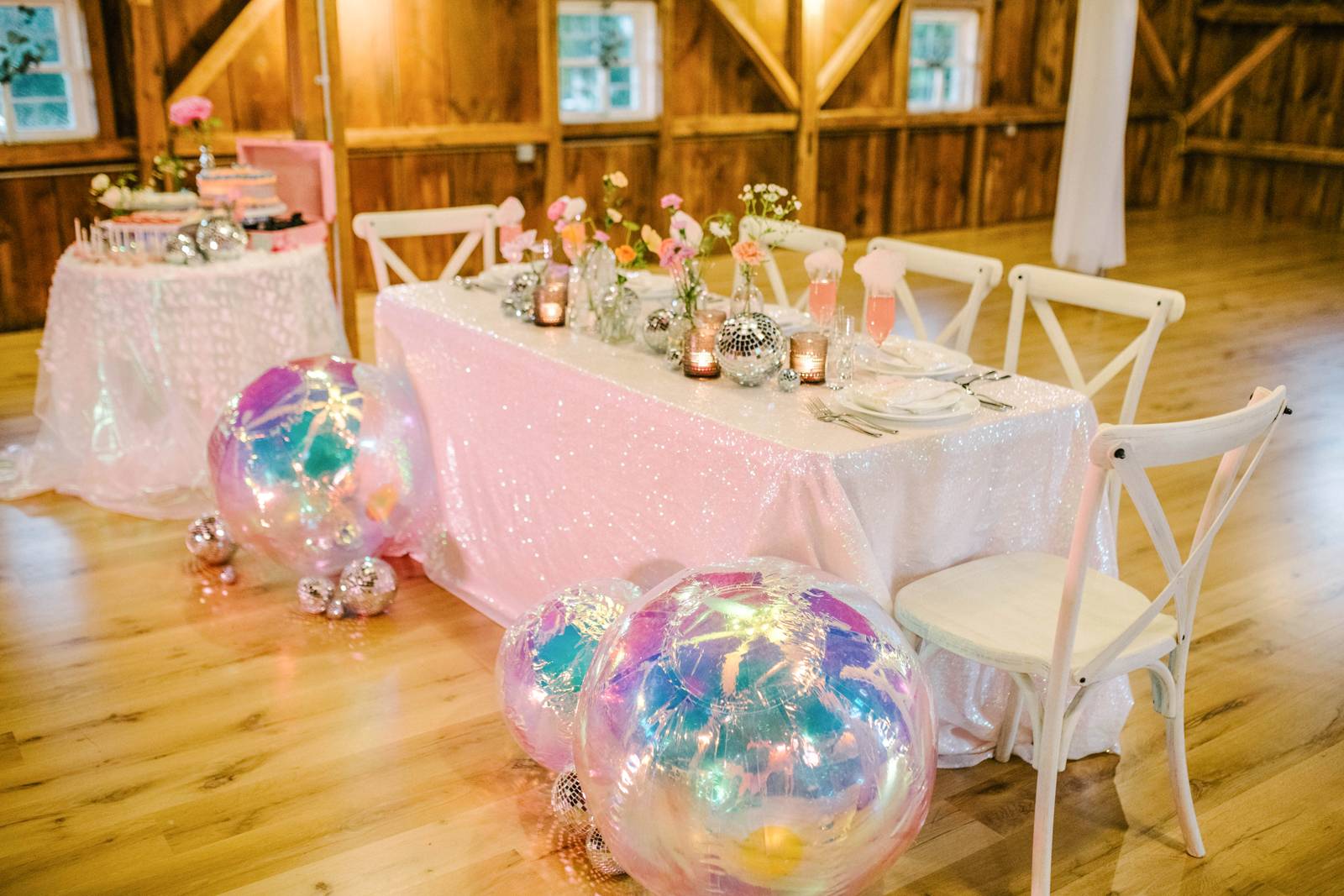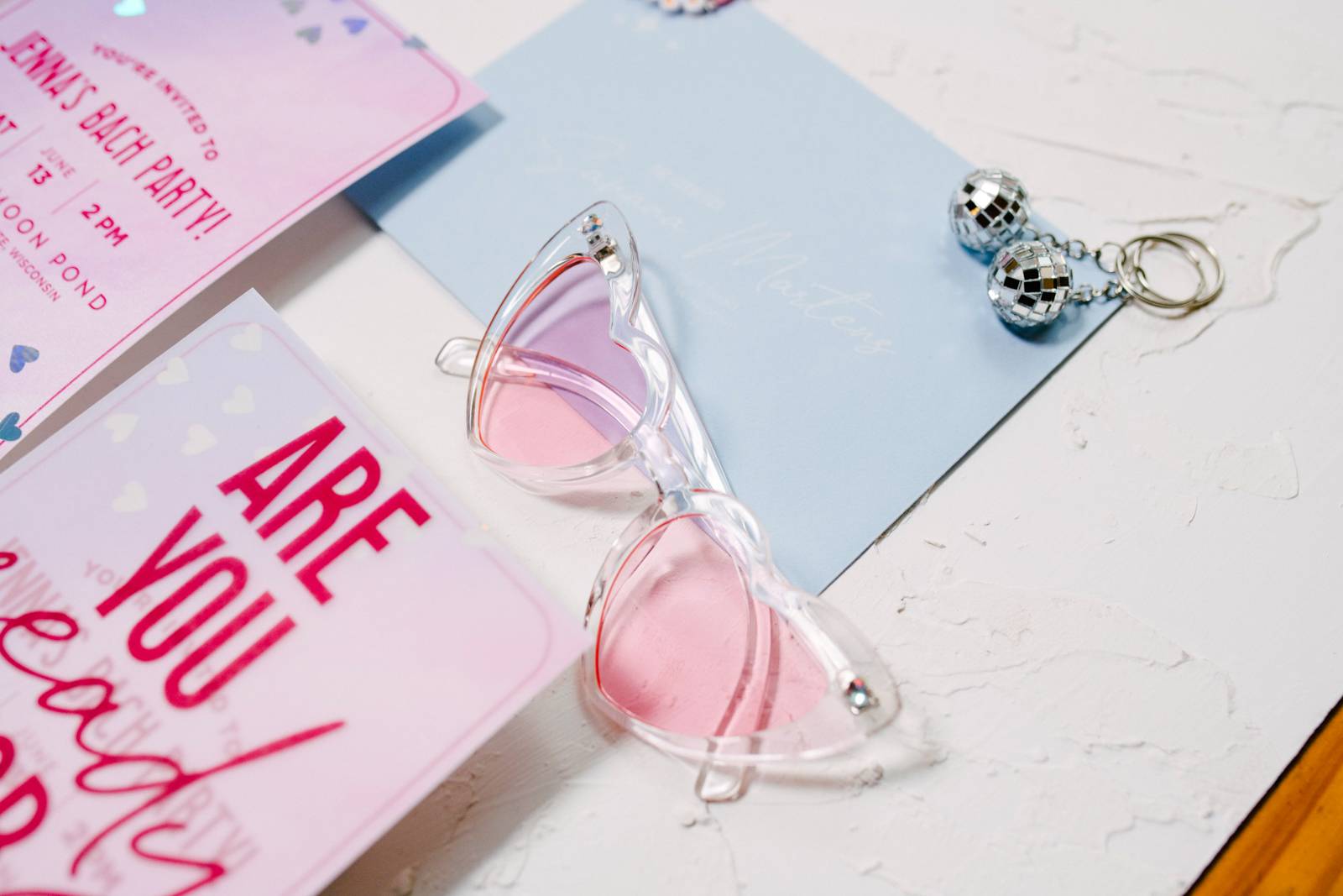 LK Bridal Studio kicked things off with a vellum-wrapped invitation suite designed to set an exciting tone for all the fun ahead! A hot pink, playful handwritten script font – reminiscent of Taylor Swift’s Lover album cover – was paired with bolder sans serif fonts, similar to those used for track listings. The invitation was sprinkled with holographic silver hearts, perfectly matching the disco balls and sparkly decor seen throughout the day. The rest of the suite featured lined envelopes, custom contour-cut cloud-shaped name cards, and even a CD sleeve itinerary card that doubled as a playlist keepsake. LK Bridal Studio also crafted custom concert-ready t-shirts for each bridesmaid to pair with a fun skirt to ensure everyone was dressed and ready for a night of celebrating their fellow Swiftie bride-to-be!