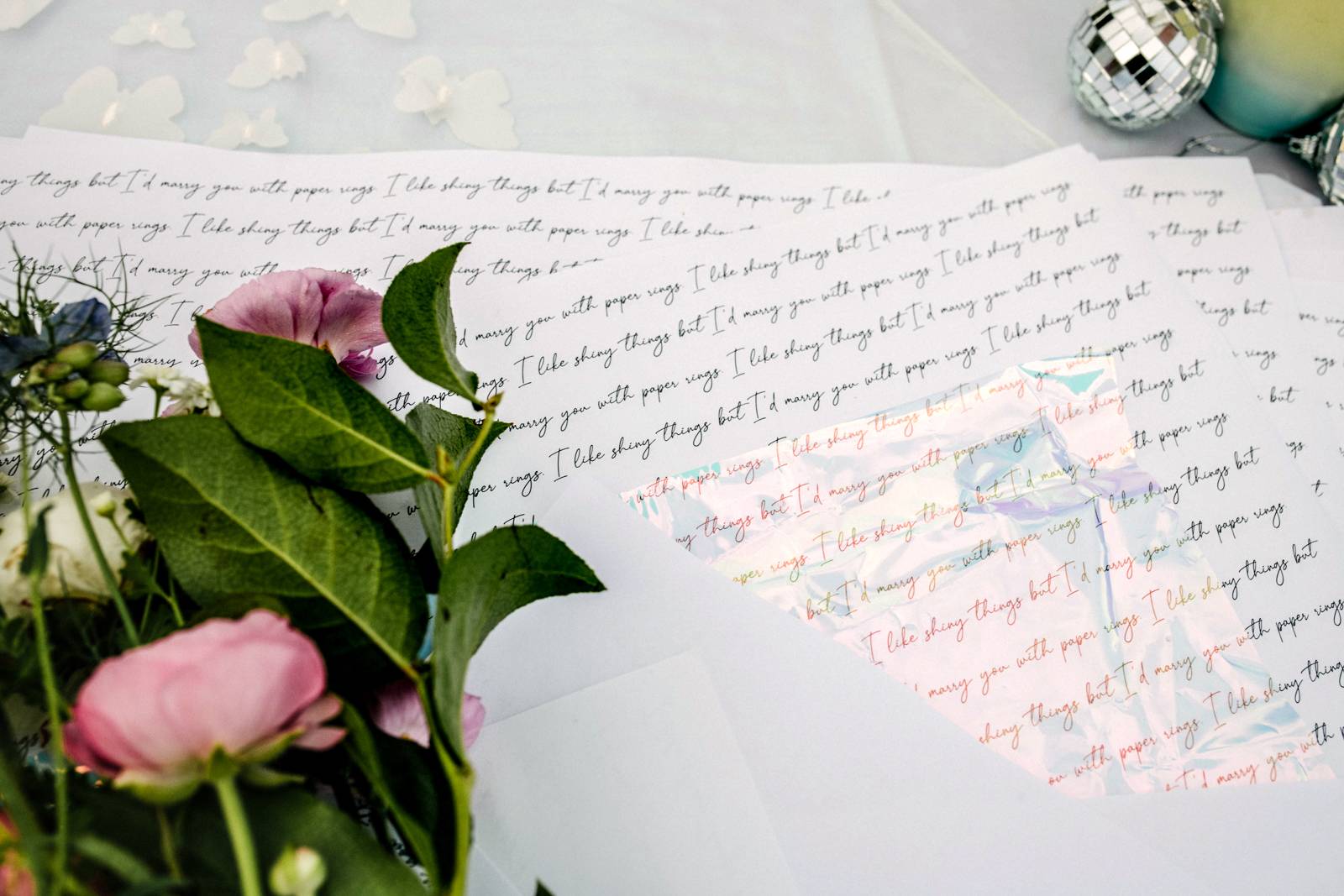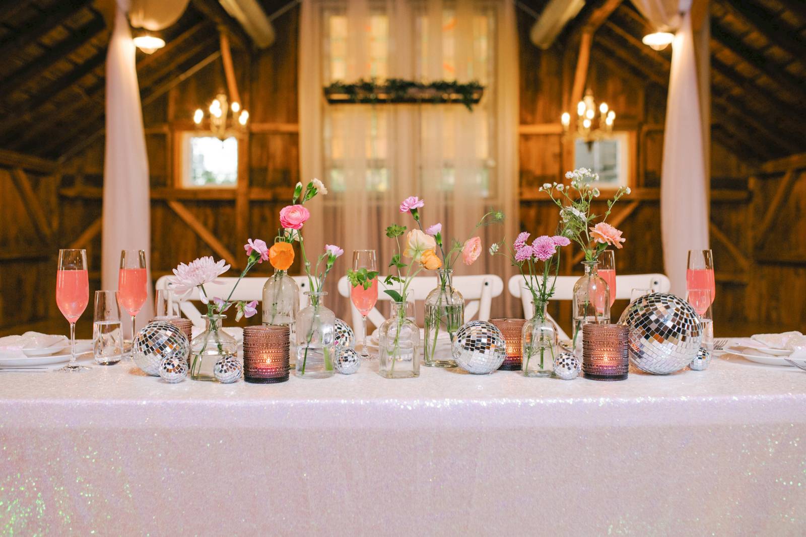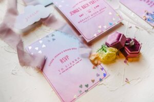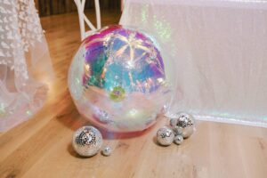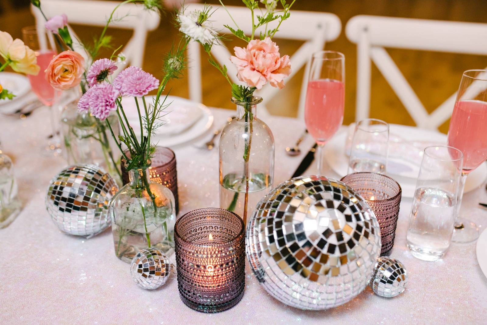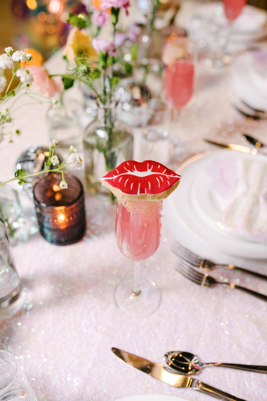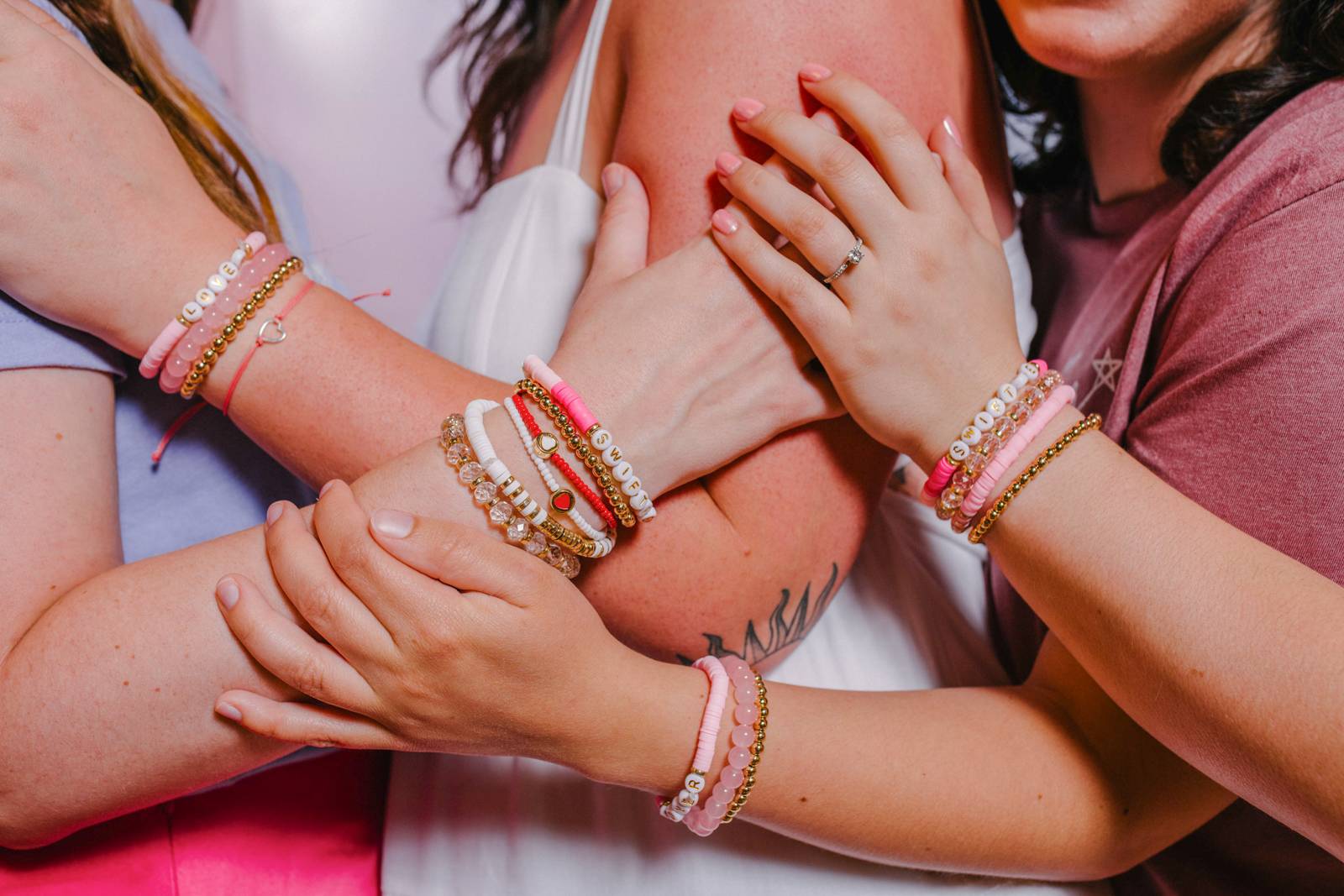 LK Bridal Studio kicked things off with a vellum-wrapped invitation suite designed to set an exciting tone for all the fun ahead! A hot pink, playful handwritten script font – reminiscent of Taylor Swift’s Lover album cover – was paired with bolder sans serif fonts, similar to those used for track listings. The invitation was sprinkled with holographic silver hearts, perfectly matching the disco balls and sparkly decor seen throughout the day. The rest of the suite featured lined envelopes, custom contour-cut cloud-shaped name cards, and even a CD sleeve itinerary card that doubled as a playlist keepsake. LK Bridal Studio also crafted custom concert-ready t-shirts for each bridesmaid to pair with a fun skirt to ensure everyone was dressed and ready for a night of celebrating their fellow Swiftie bride-to-be!