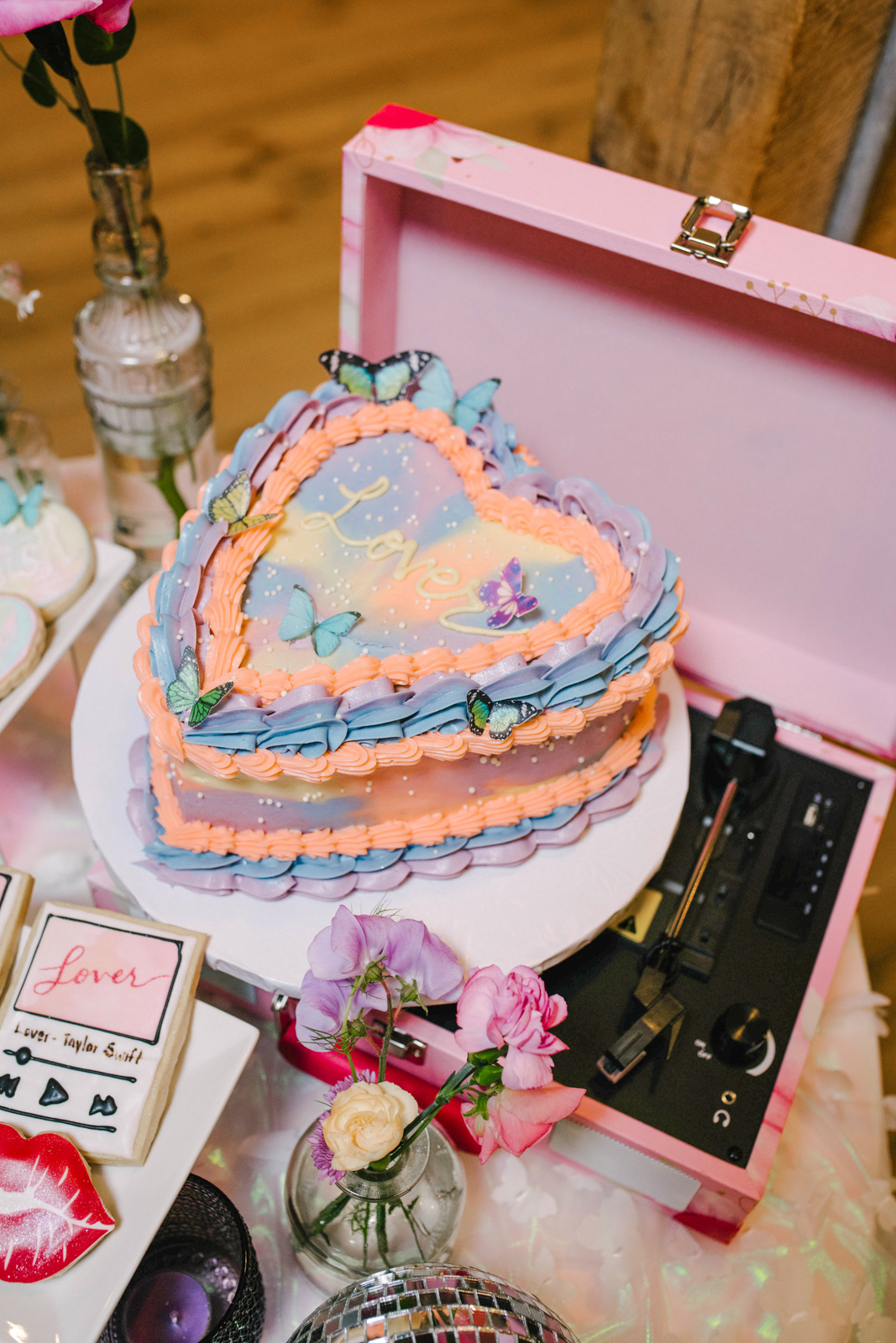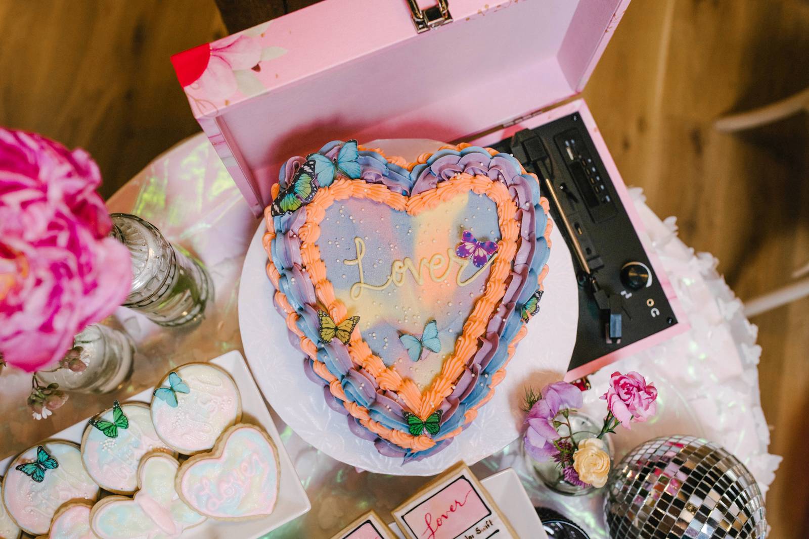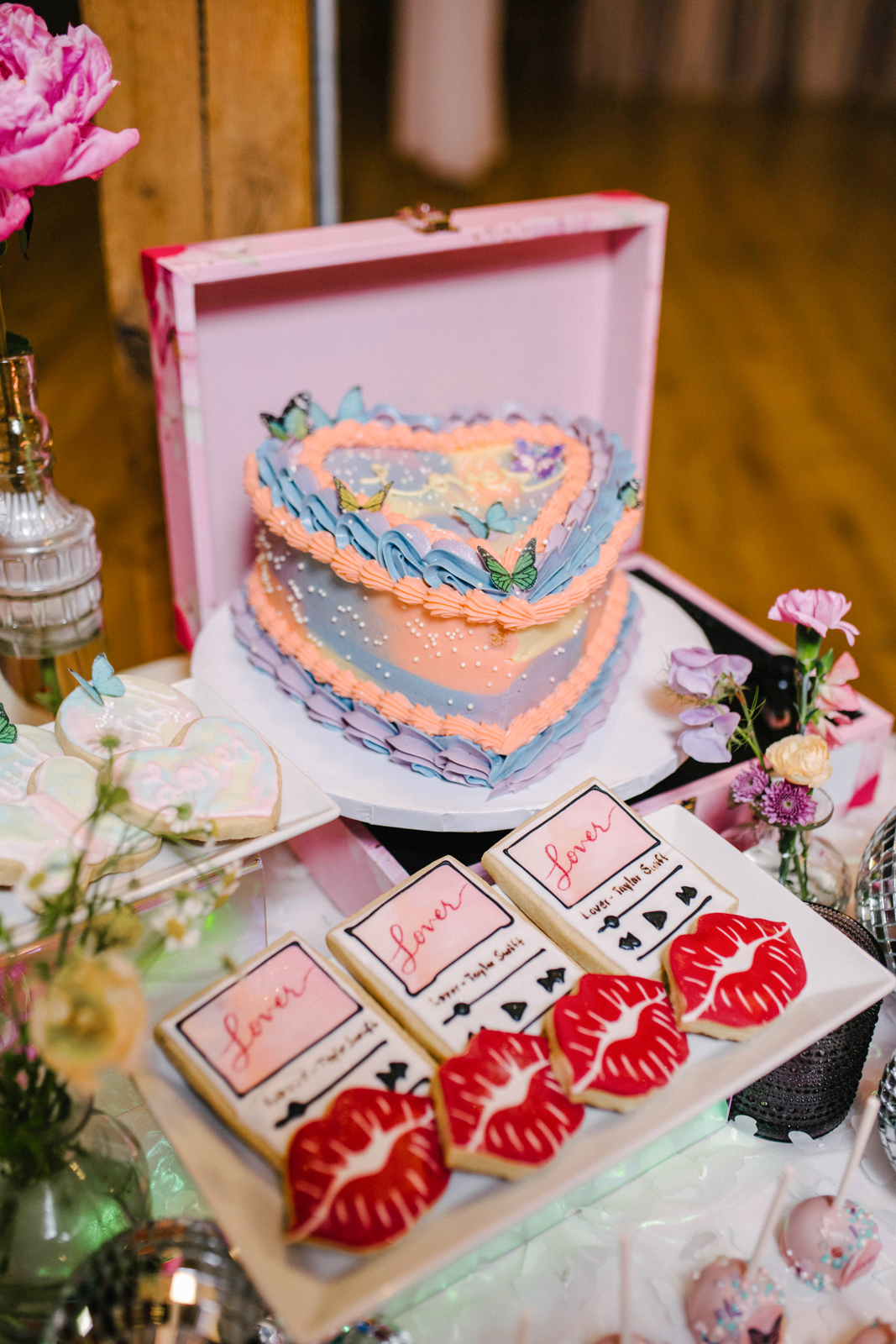 Sandy Kakes wowed everyone with a fabulous dessert spread that perfectly encapsulated the Lover-themed vibe! Displayed on a pink record player, a stunning multi-colored vintage heart cake took center stage. Adorned with edible butterflies made from printed wafer paper, this cake featured hand-written lettering reminiscent of Taylor Swift’s Lover album.