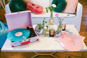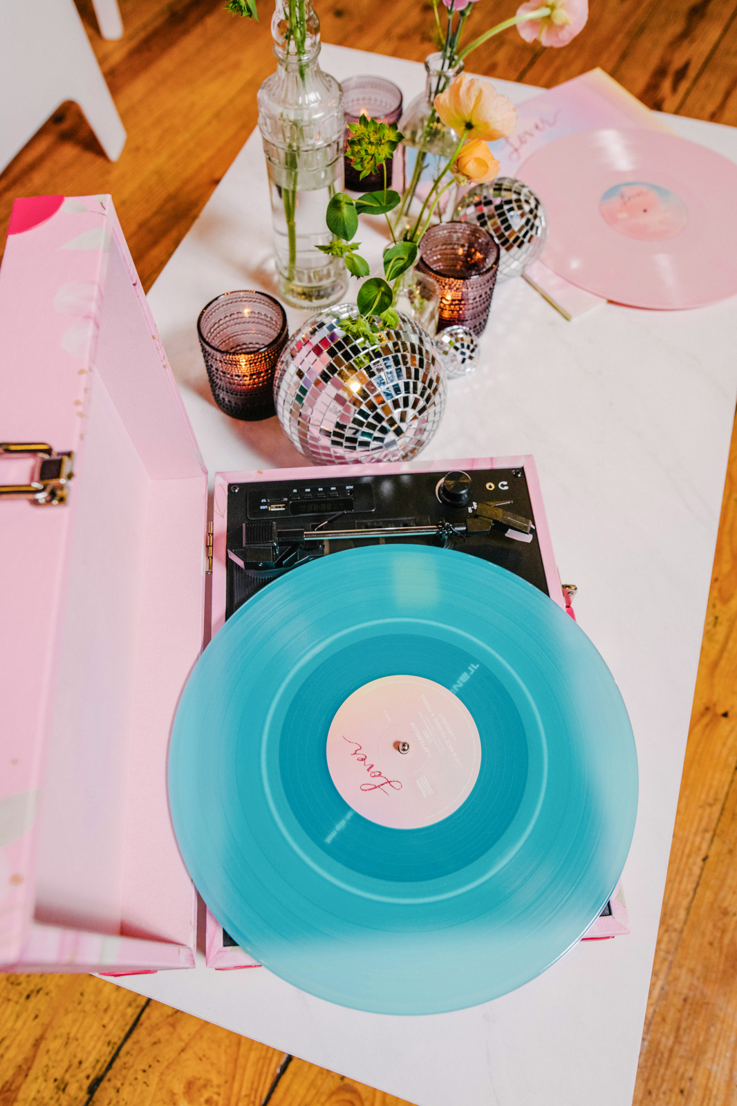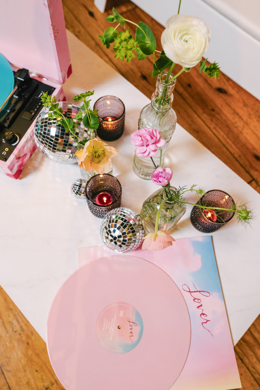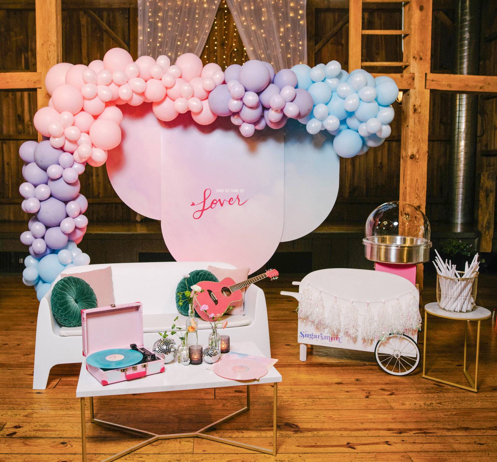 Sandy Kakes wowed everyone with a fabulous dessert spread that perfectly encapsulated the Lover-themed vibe! Displayed on a pink record player, a stunning multi-colored vintage heart cake took center stage. Adorned with edible butterflies made from printed wafer paper, this cake featured hand-written lettering reminiscent of Taylor Swift’s Lover album.