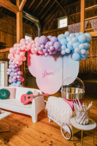 Aerial Balloons & Backdrops set the stage for all the photos, laughter, and fun with a stunning balloon installation that became the perfect focal point above the large arched signage. Soft pastel pinks, blues, and purples beautifully complemented the playful Lover-themed party, adding even more magic to the celebration!