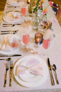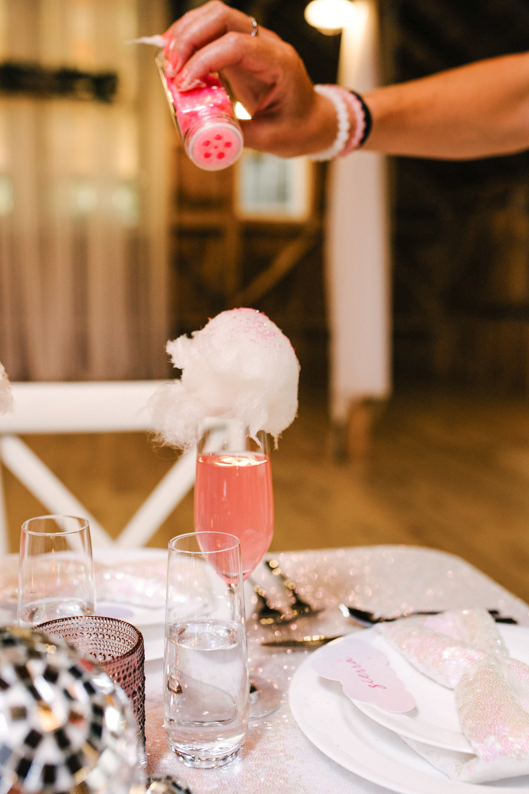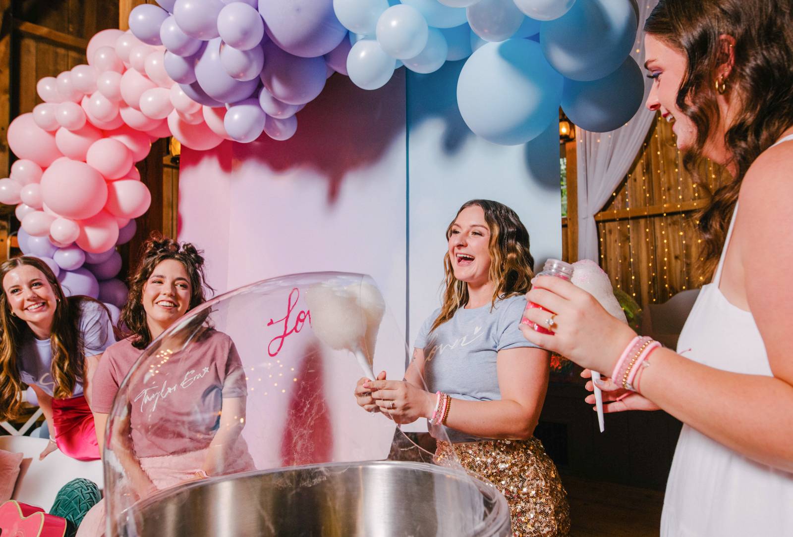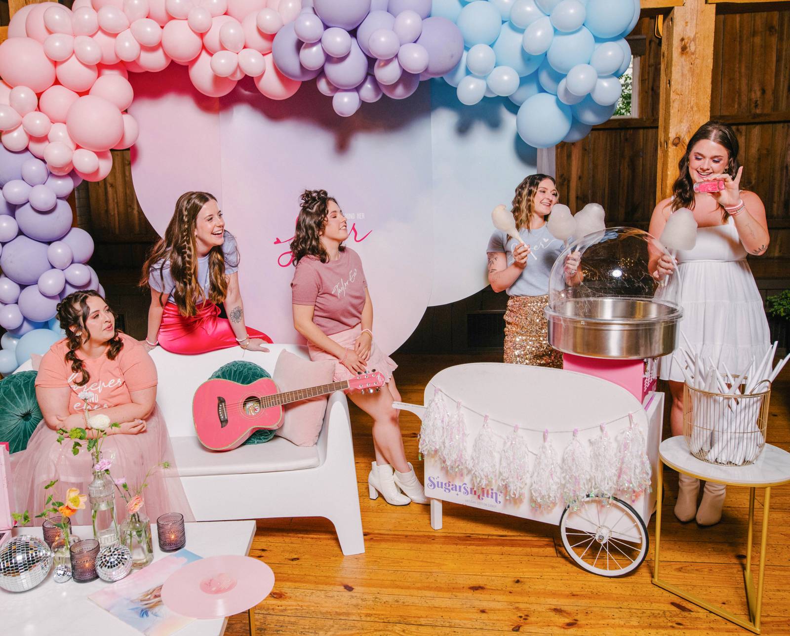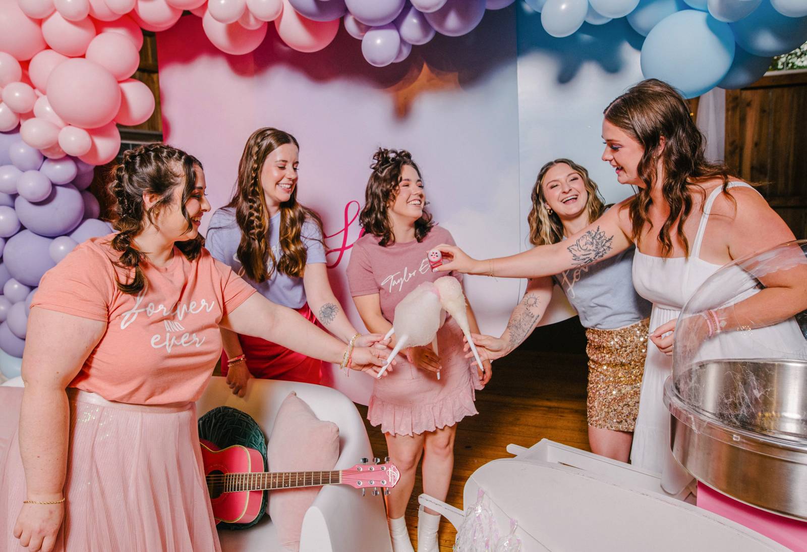 Sugarsmith added a delightful layer of sweetness to the celebration with their cotton candy cart, spinning fluffy, melt-in-your-mouth treats for all the guests. Each colorful swirl of cotton candy mirrored the dreamy cloud details from Taylor Swift’s Lover album aesthetic, seamlessly blending into the party’s theme. Their delicious confections, served in cones or topping off a fun cocktail, complemented the dazzling decor elements like disco balls and sparkling tablecloths.