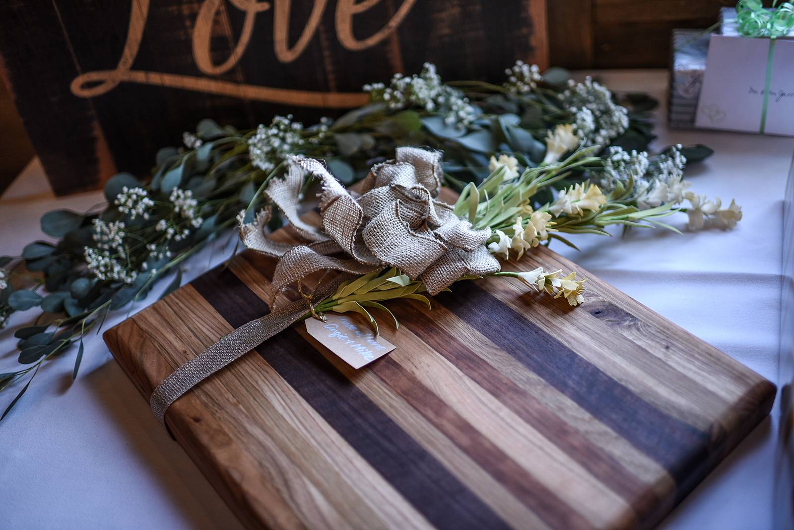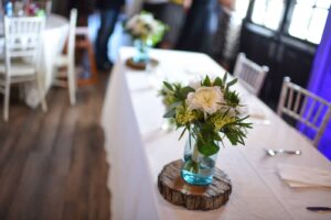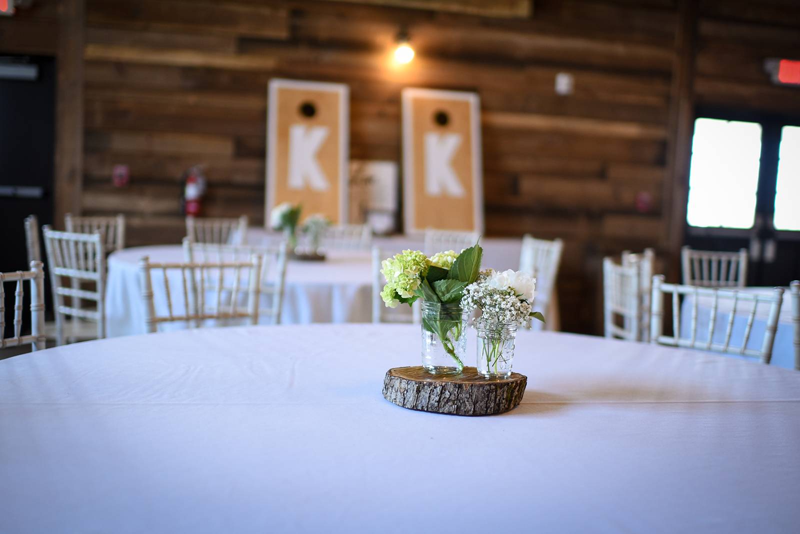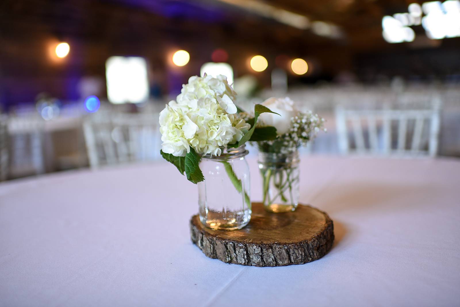 Our centerpieces consisted of a wooden disk topped with three mason jars and flowers. The wooden disks were cut from a tree that had fallen on Jake’s hunting land. The mason jars are from Danielle’s grandparents.