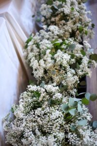 DESCRIBE YOUR WEDDING FLOWERS: All bouquets were white peonies with greens added. Aisle flowers were tin buckets with baby’s-breath. Centerpieces were three different sized mason jars with white peonies.