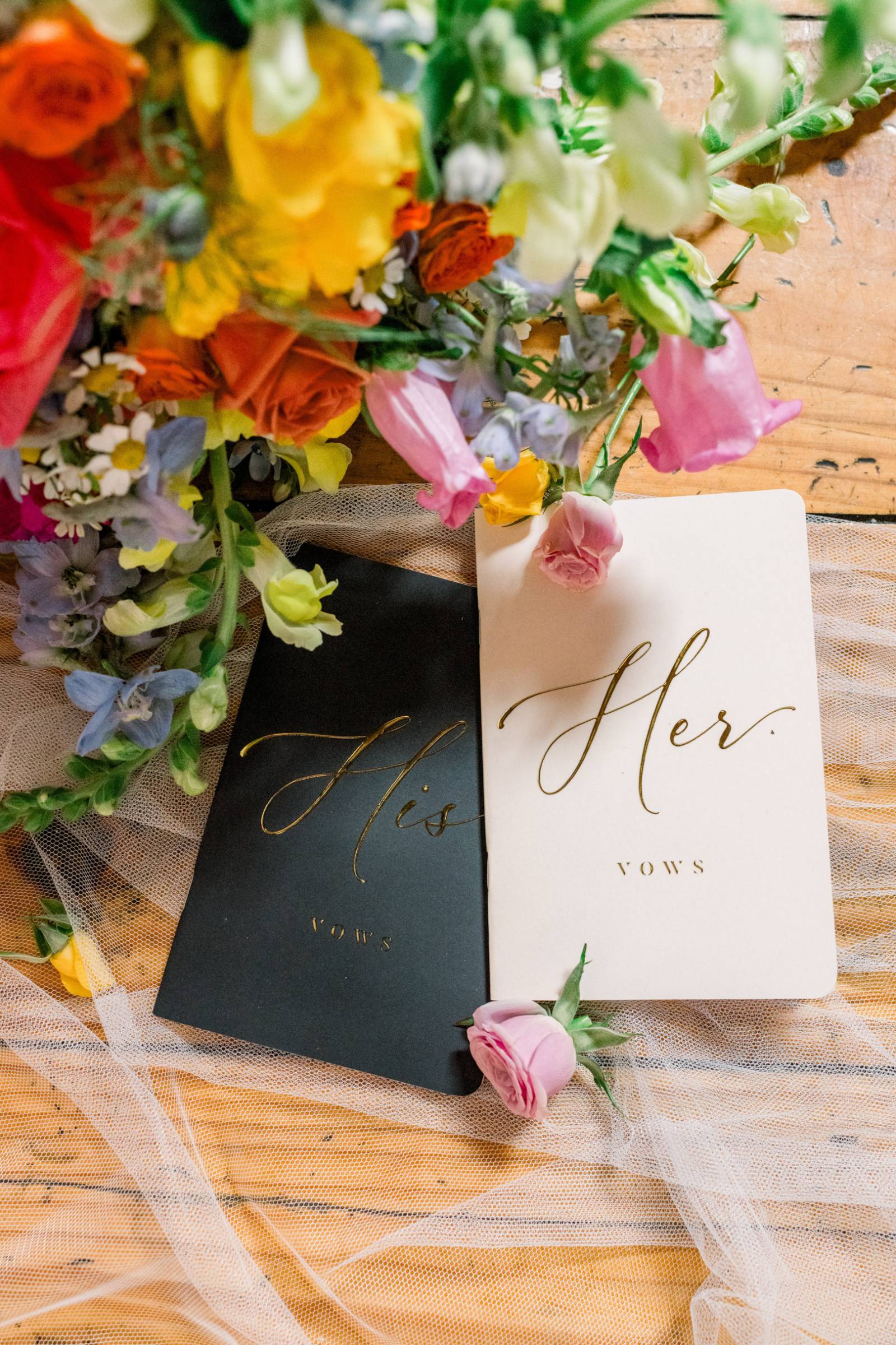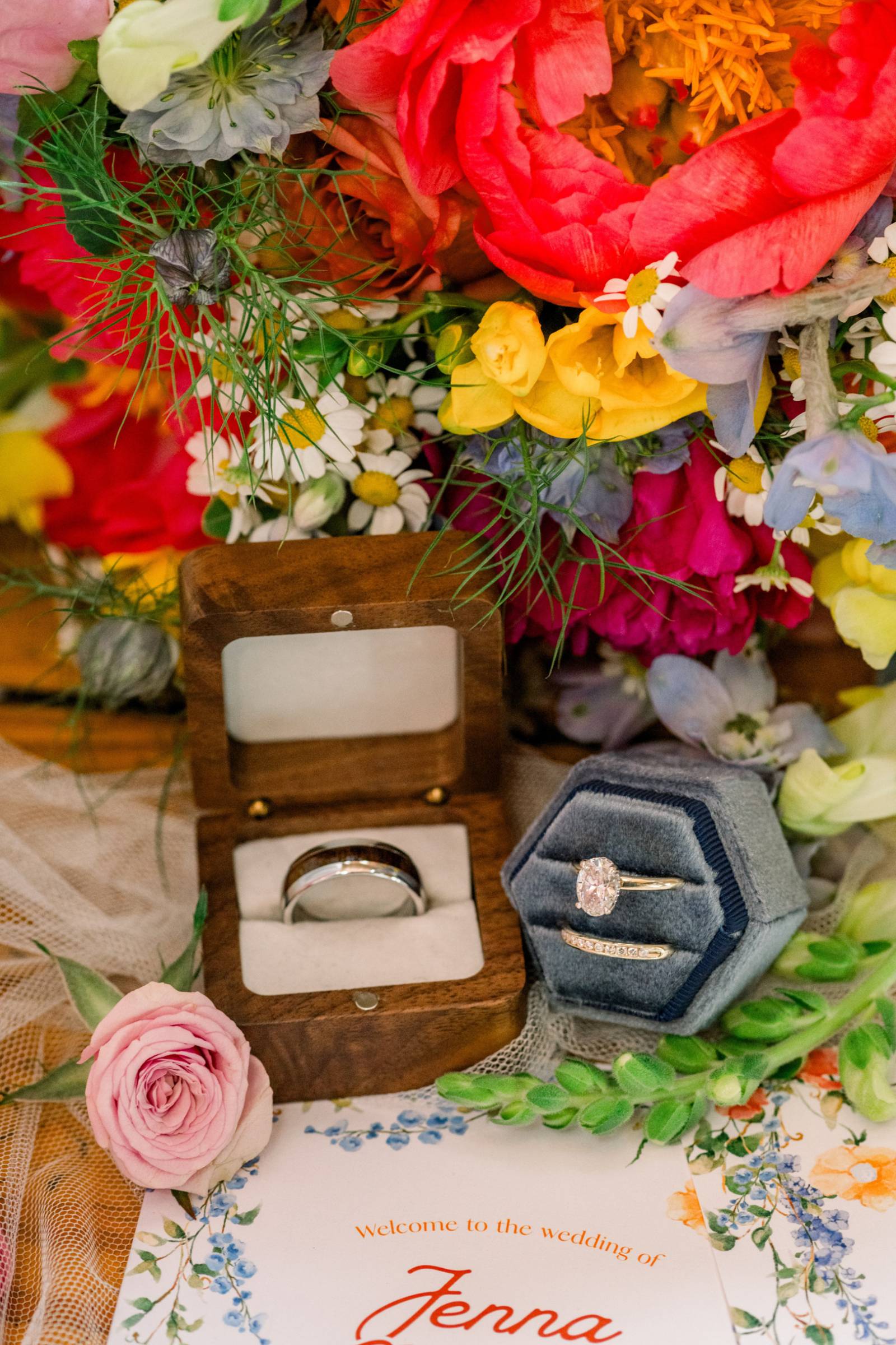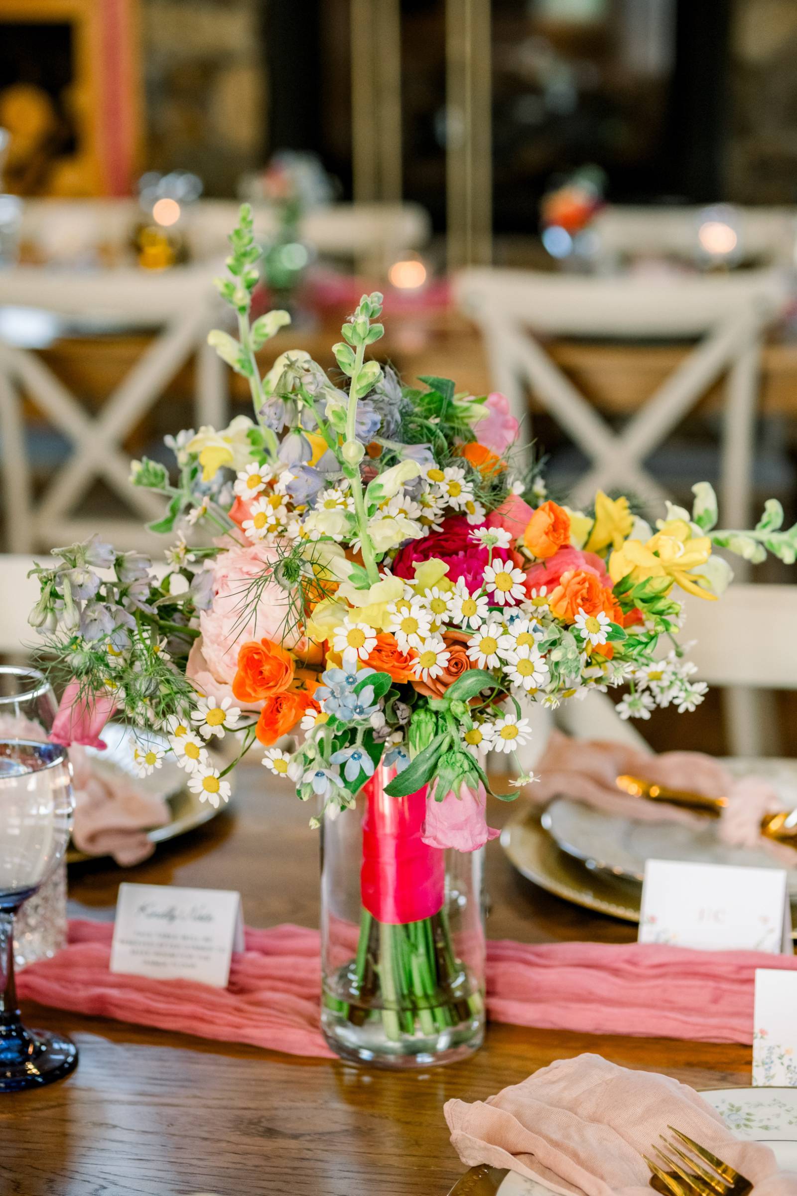 Bright florals and personal touches helped shape every decision, starting with colorful stationery by LK Bridal Studio. The color palette for the day consisted primarily of pink and orange, with touches of green, blue, and black.