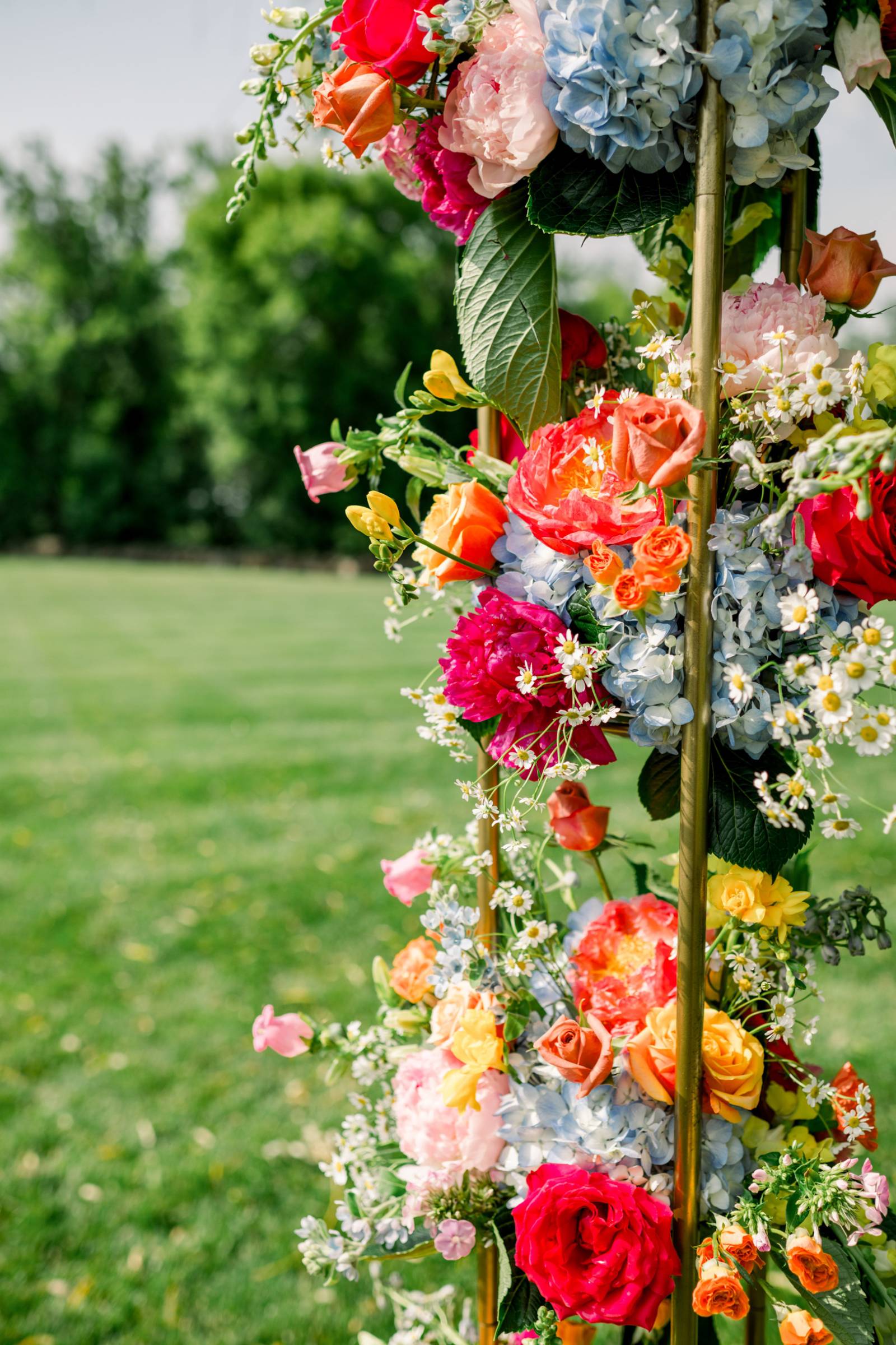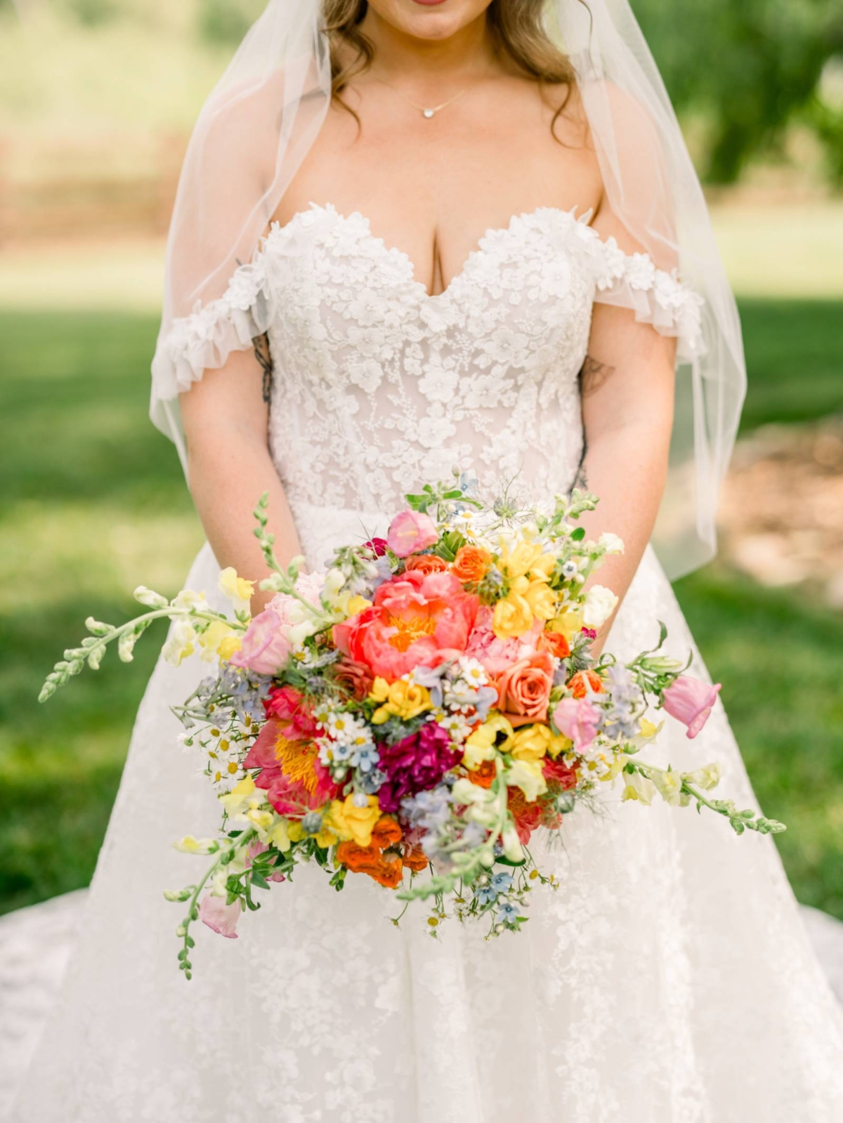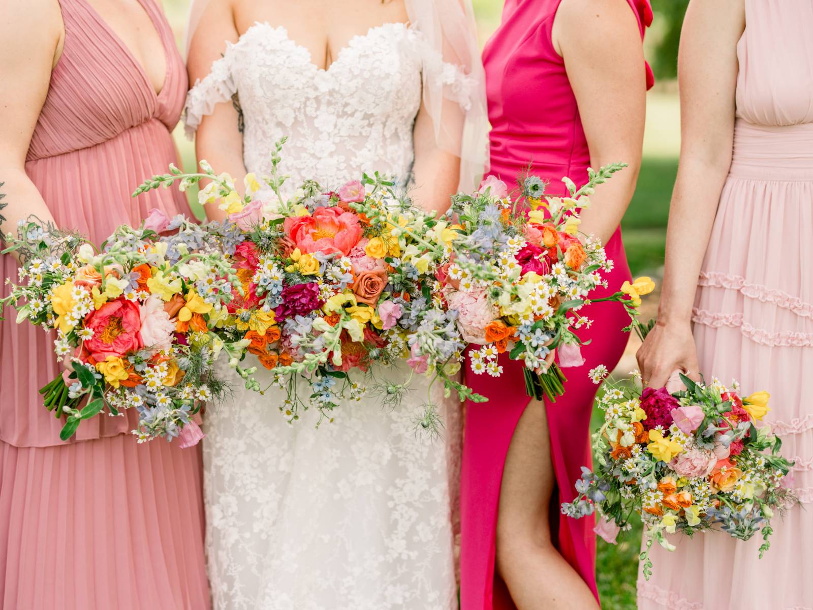 Bright florals and personal touches helped shape every decision, starting with colorful stationery by LK Bridal Studio. The color palette for the day consisted primarily of pink and orange, with touches of green, blue, and black.