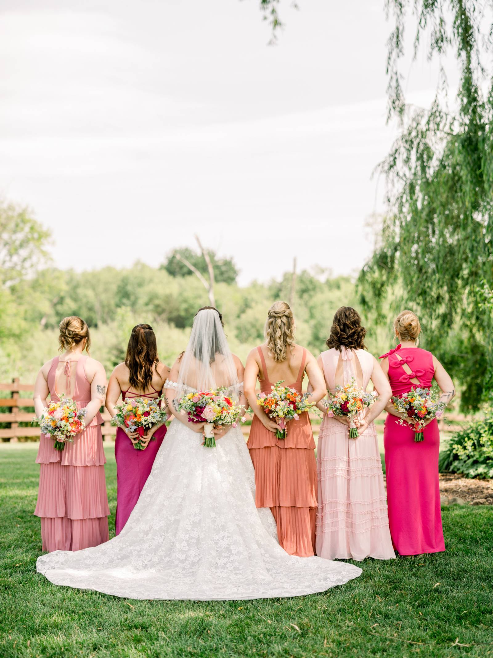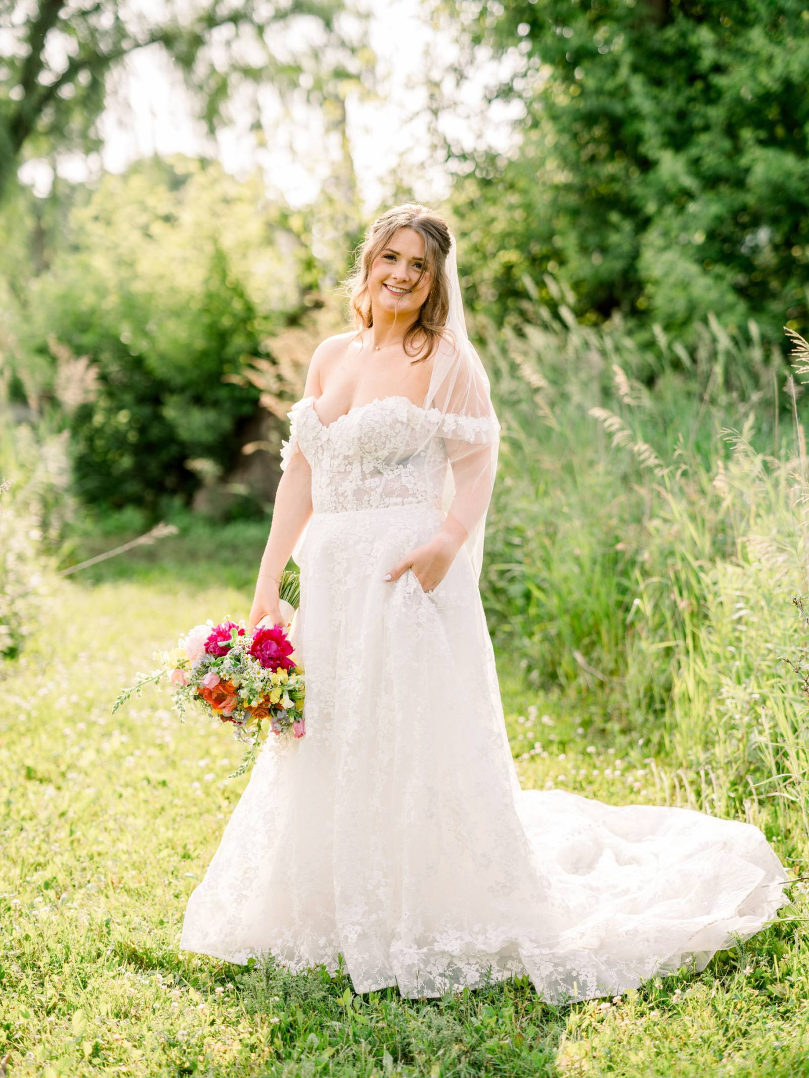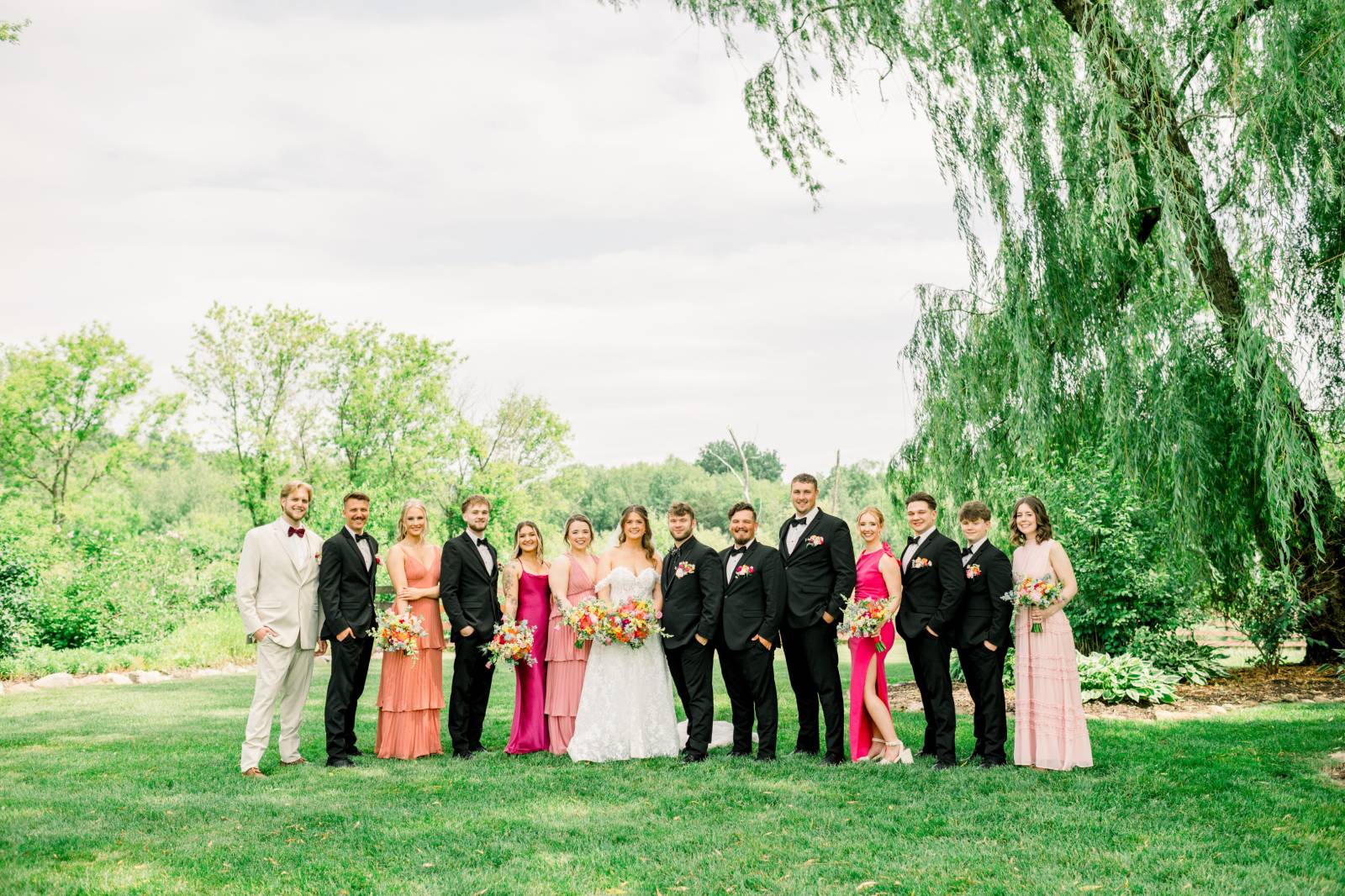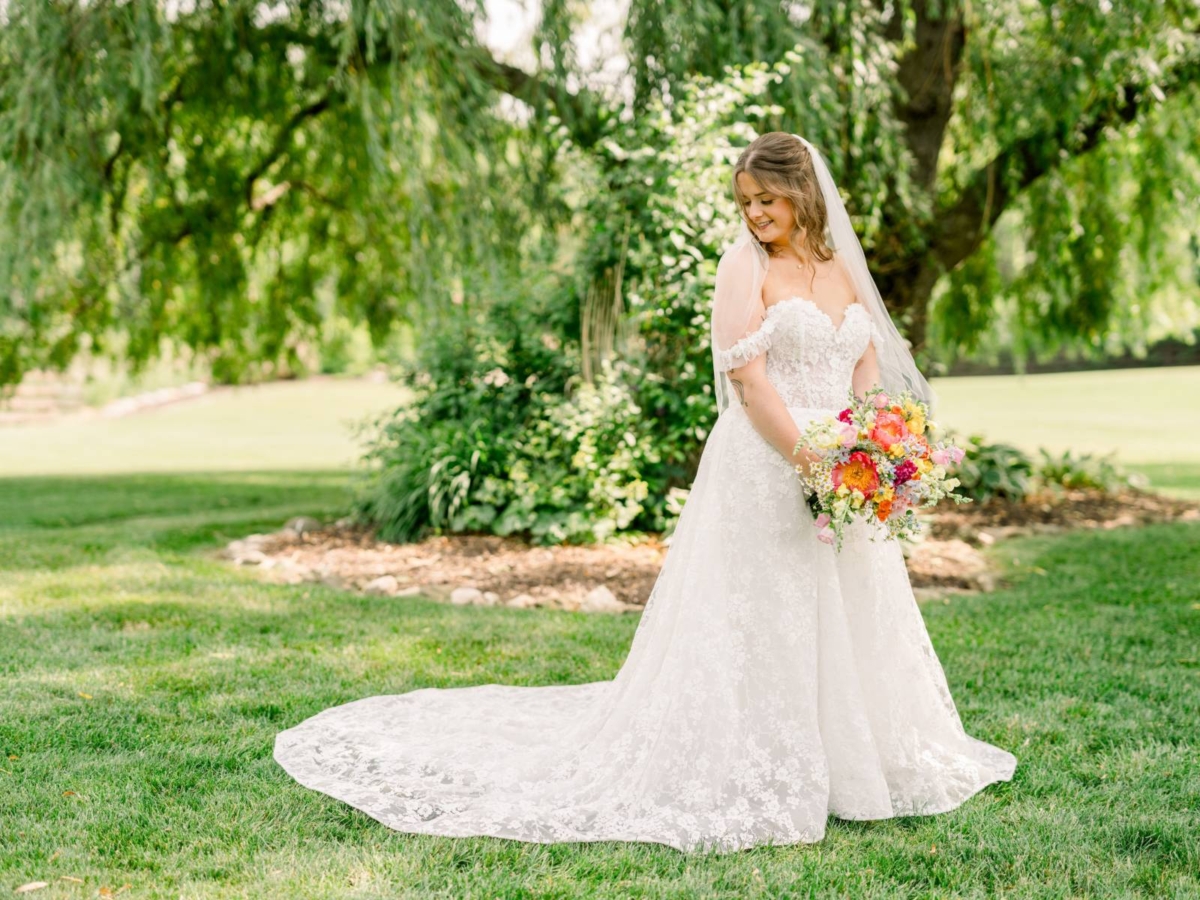Jenna found her dream dress–a romantic, ethereal gown–at Vera’s House of Bridal. The A-Line gown featured a structured bodice, off-the-shoulder sleeves, lace fabric, pockets, and a flowing train. Her bridal party selected their own dress or suit style, each unique, but within the color palette for the day.