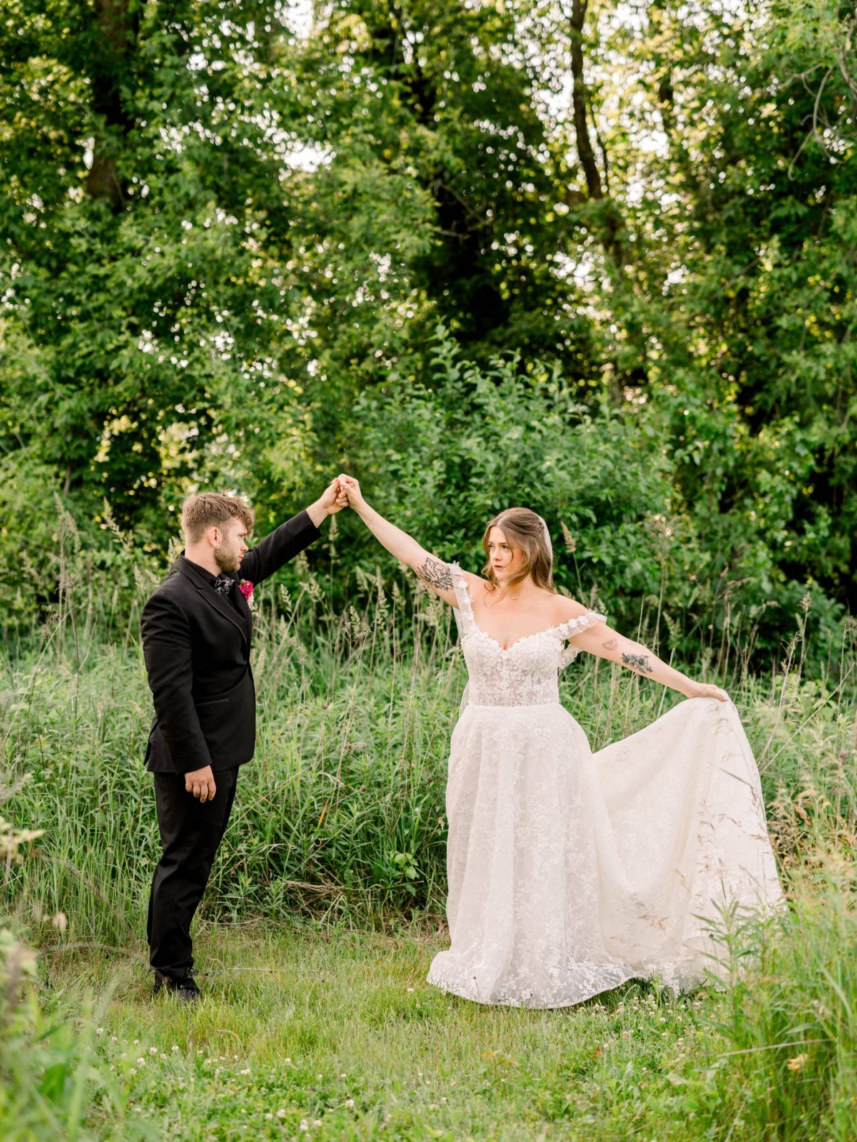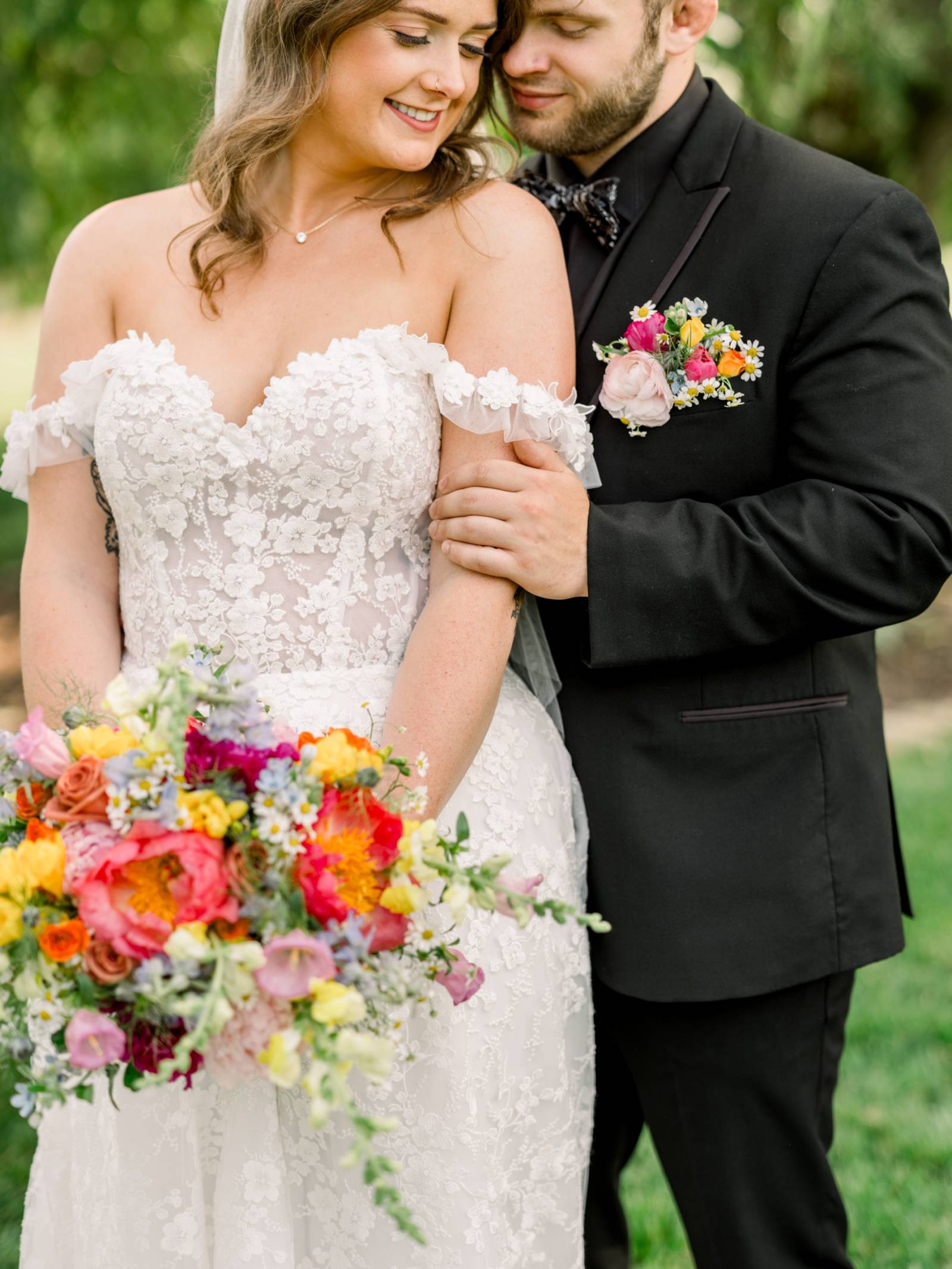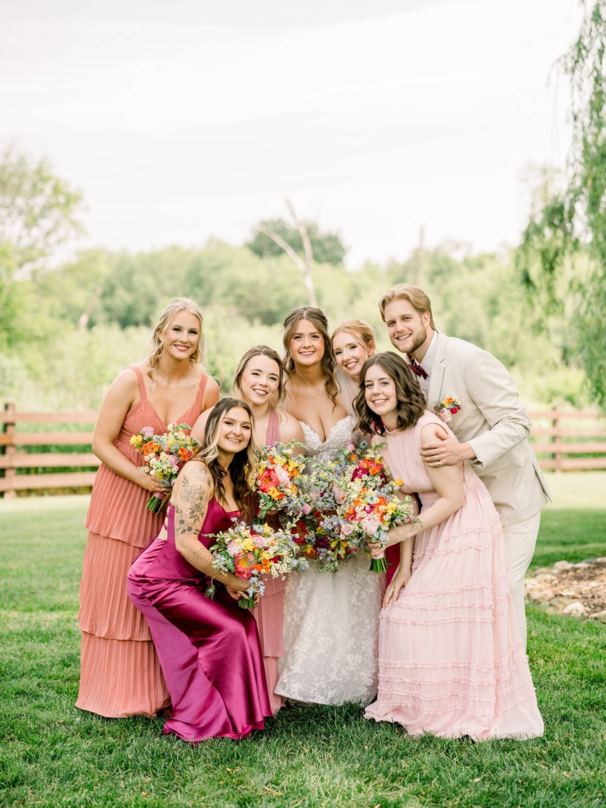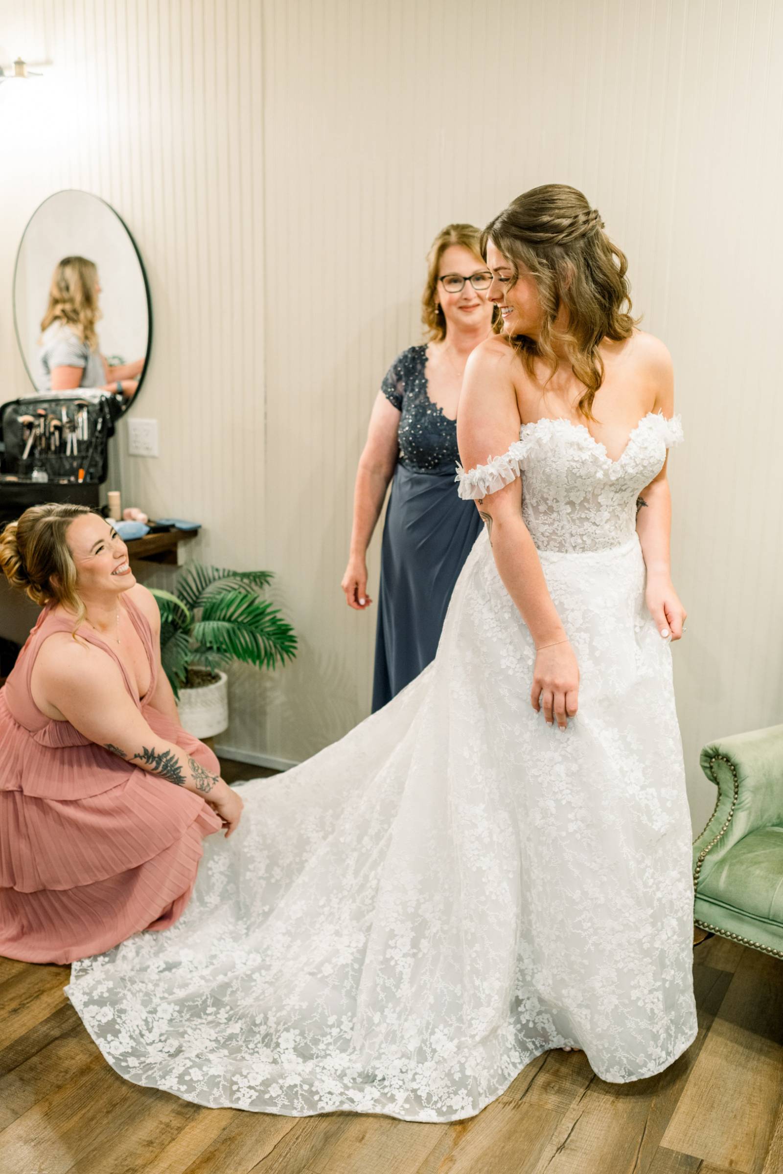 Jenna found her dream dress–a romantic, ethereal gown–at Vera’s House of Bridal. The A-Line gown featured a structured bodice, off-the-shoulder sleeves, lace fabric, pockets, and a flowing train. Her bridal party selected their own dress or suit style, each unique, but within the color palette for the day.