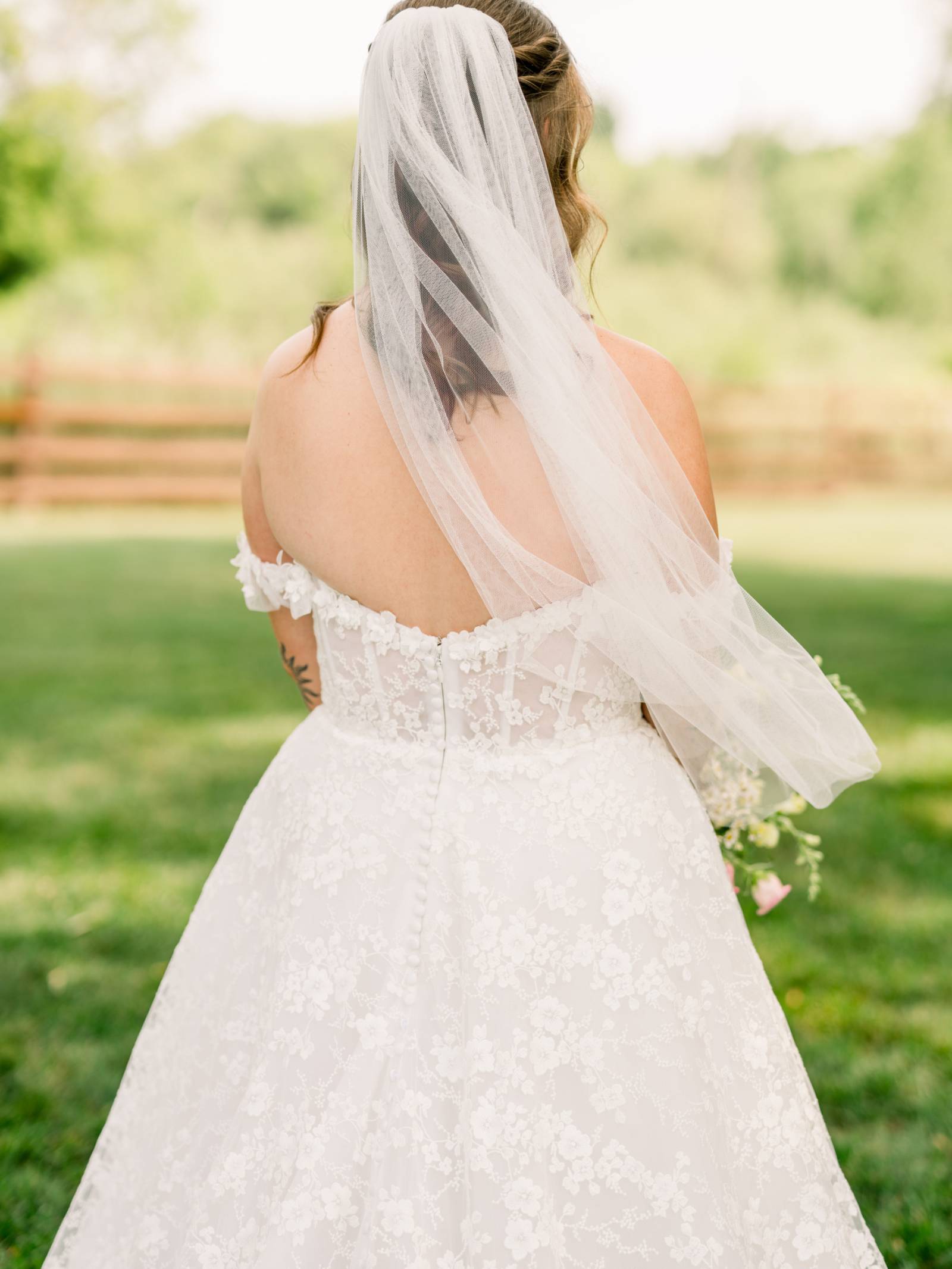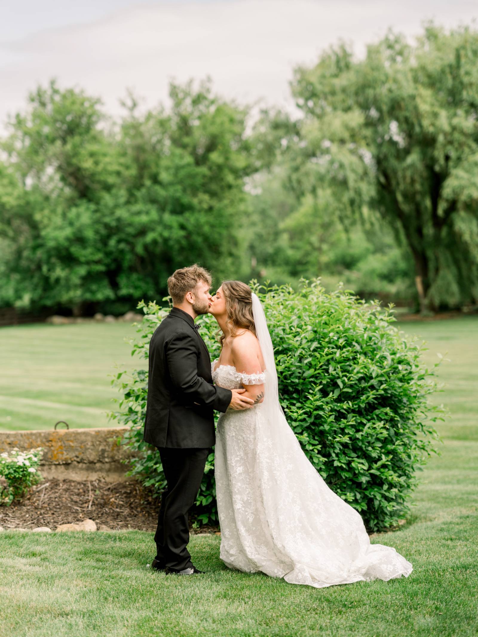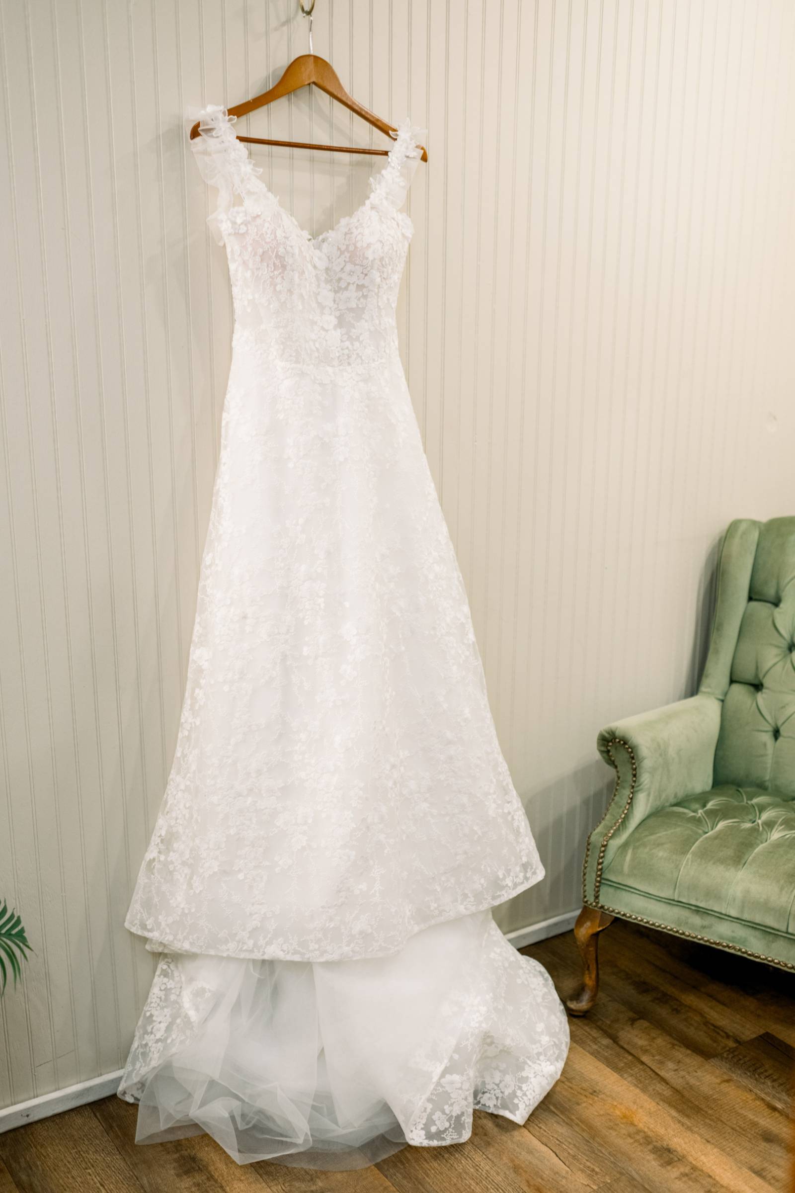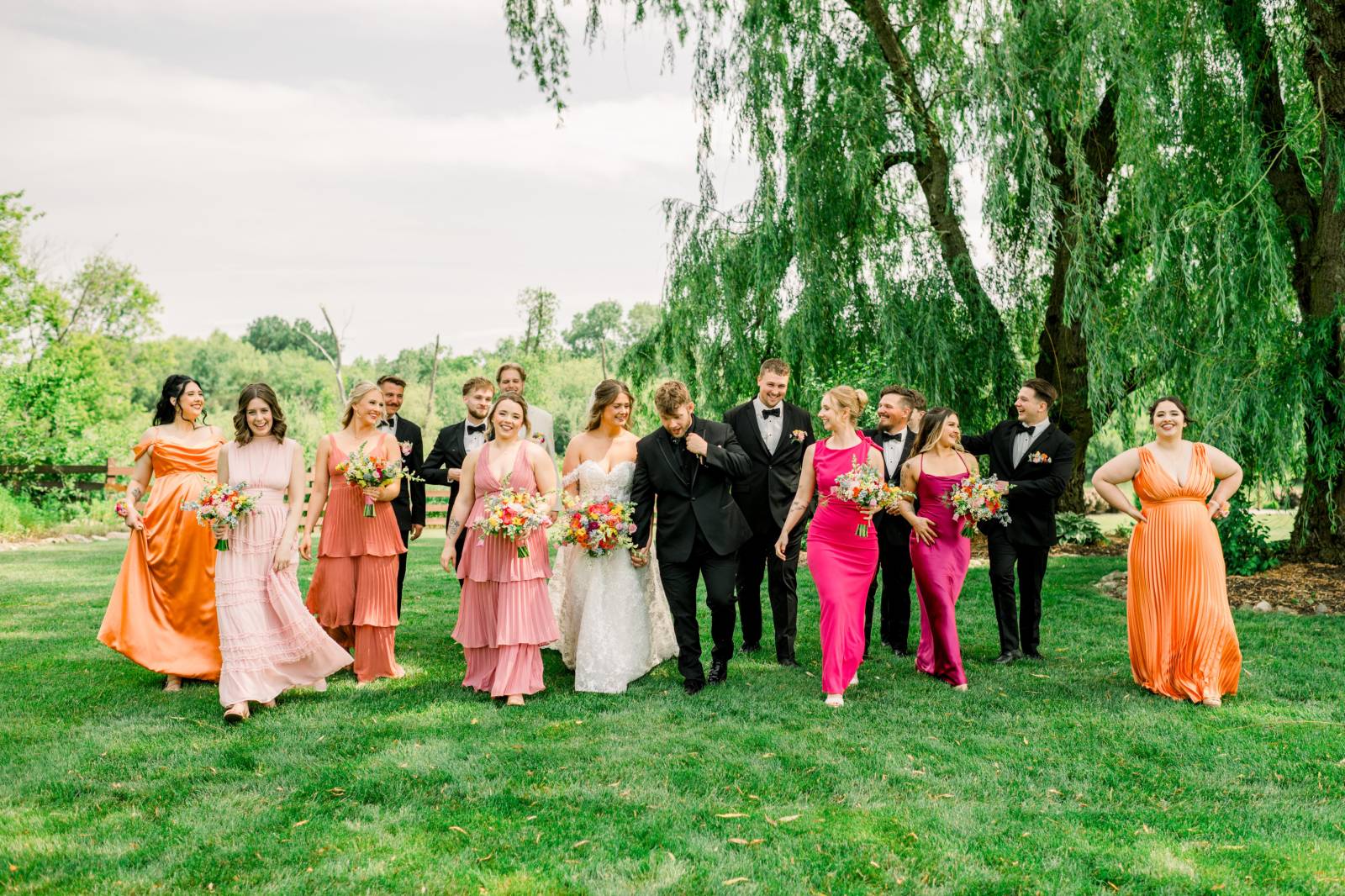 Jenna found her dream dress–a romantic, ethereal gown–at Vera’s House of Bridal. The A-Line gown featured a structured bodice, off-the-shoulder sleeves, lace fabric, pockets, and a flowing train. Her bridal party selected their own dress or suit style, each unique, but within the color palette for the day.