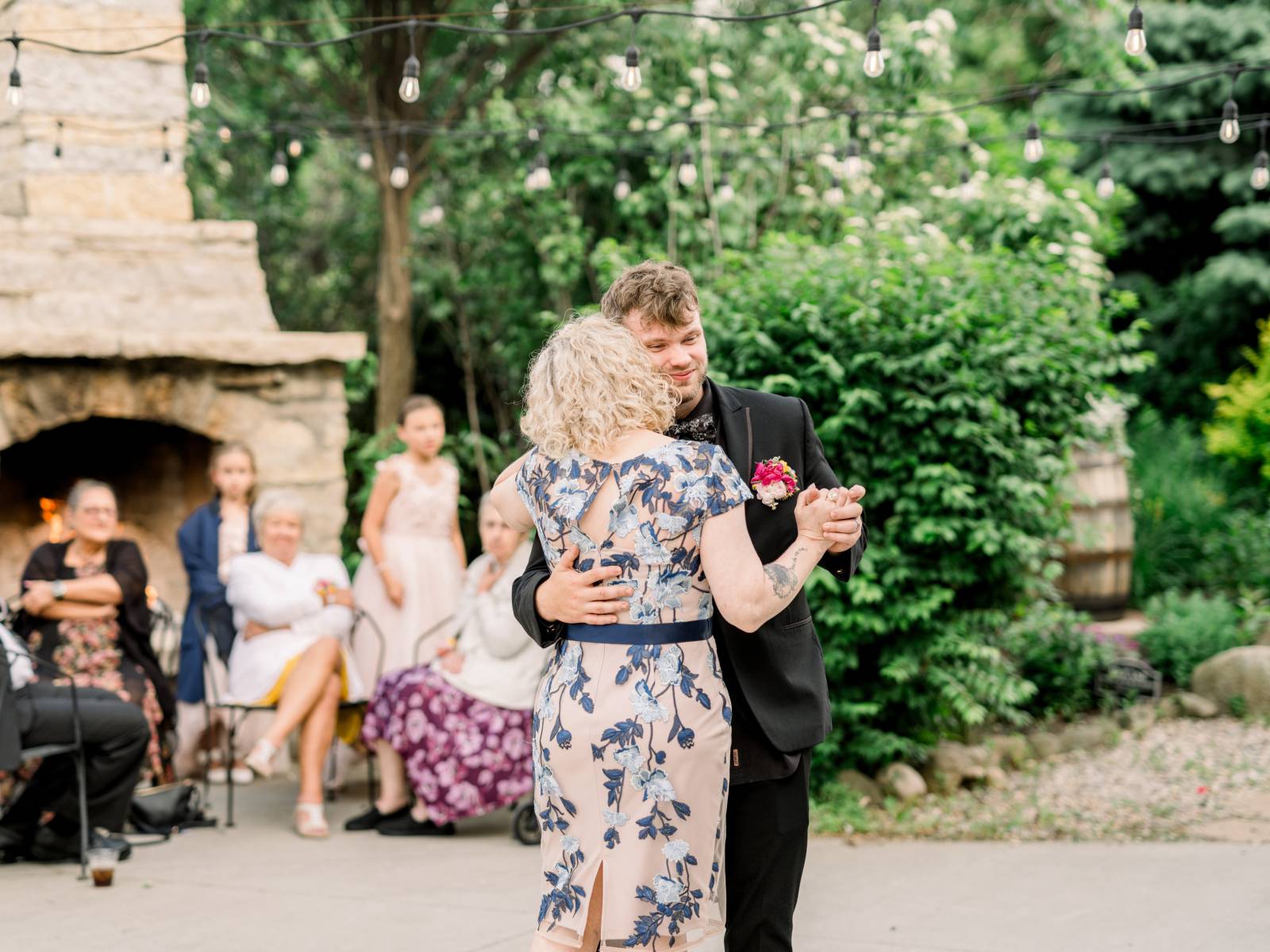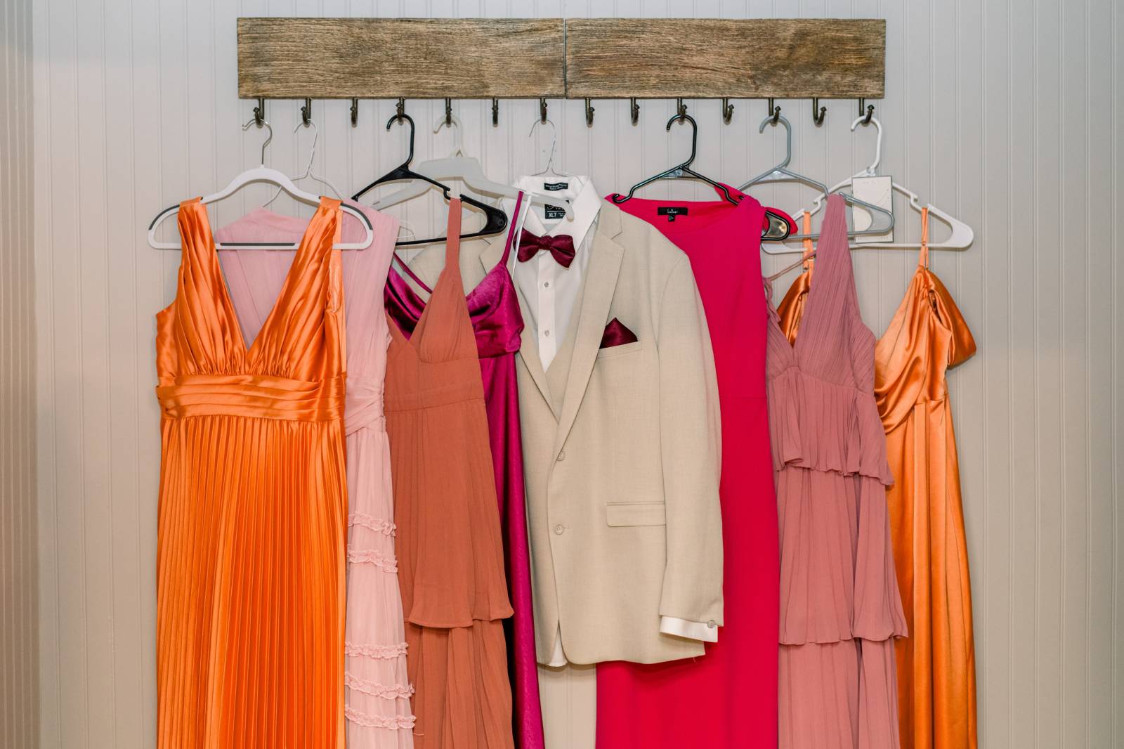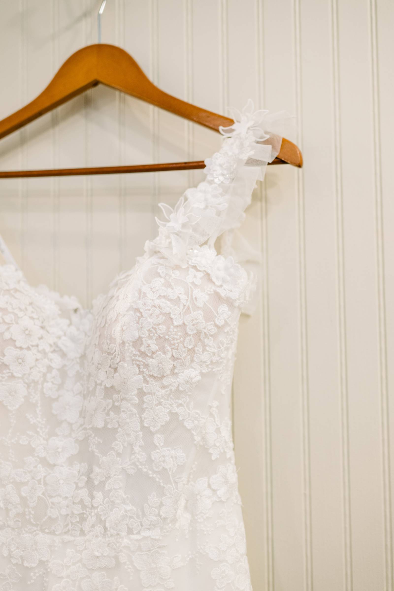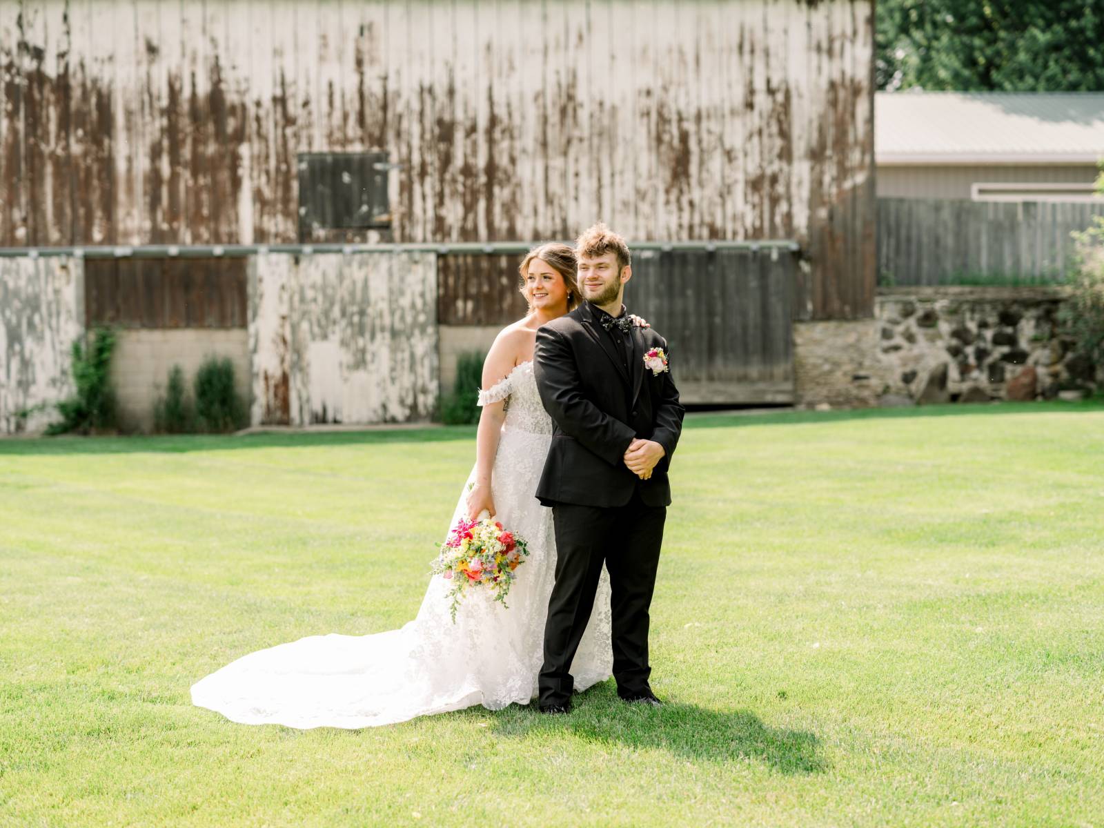 Jenna found her dream dress–a romantic, ethereal gown–at Vera’s House of Bridal. The A-Line gown featured a structured bodice, off-the-shoulder sleeves, lace fabric, pockets, and a flowing train. Her bridal party selected their own dress or suit style, each unique, but within the color palette for the day.