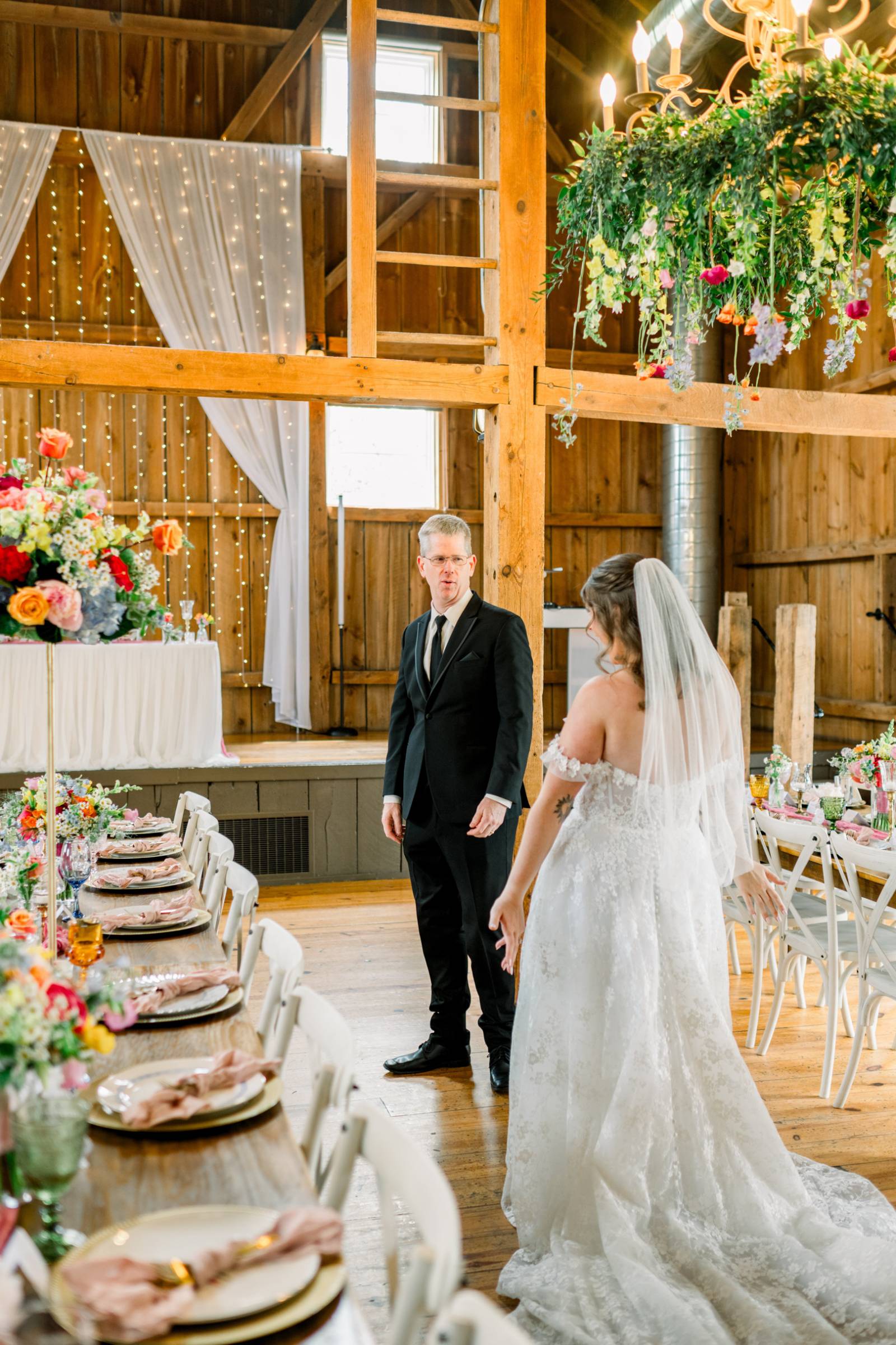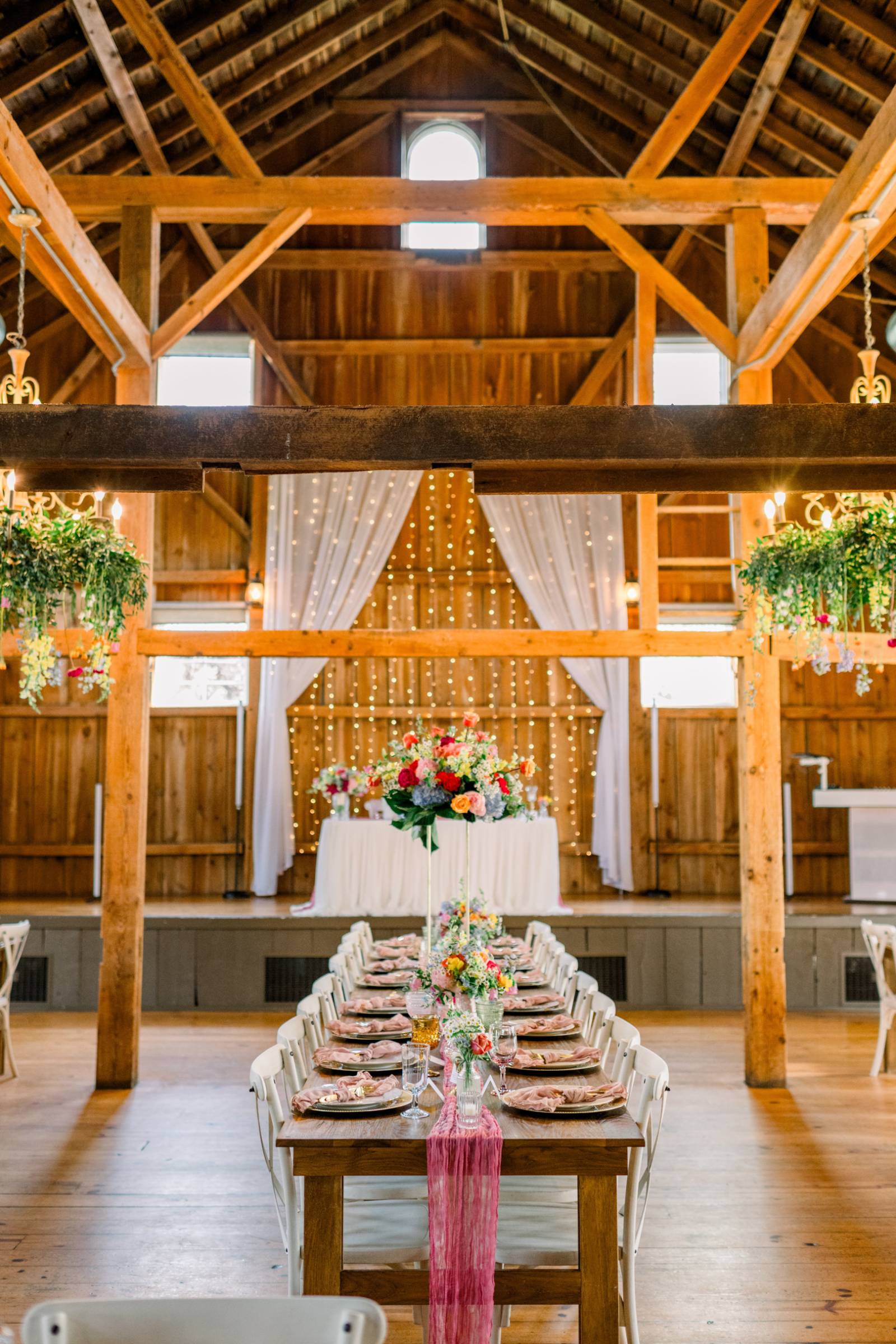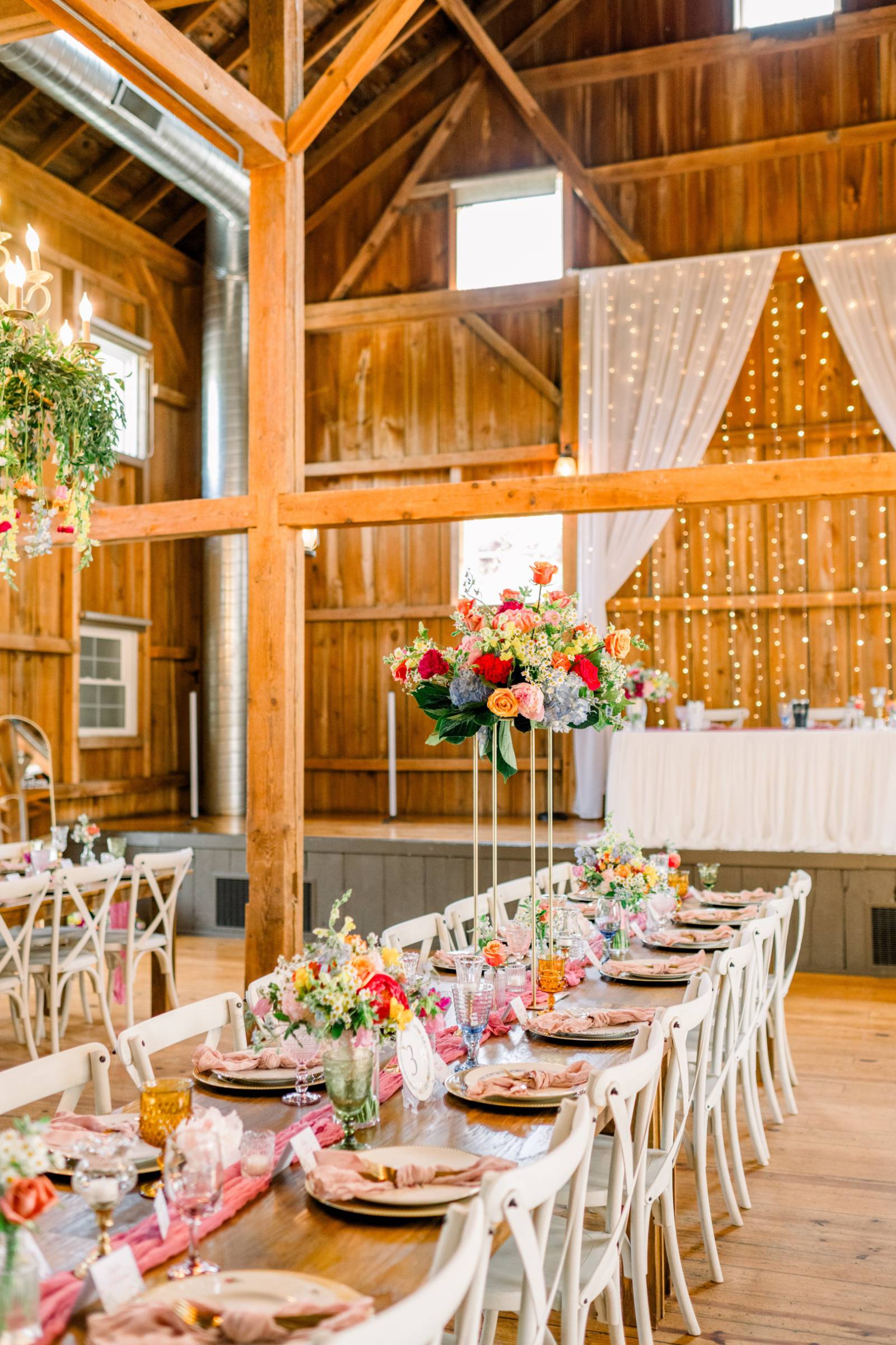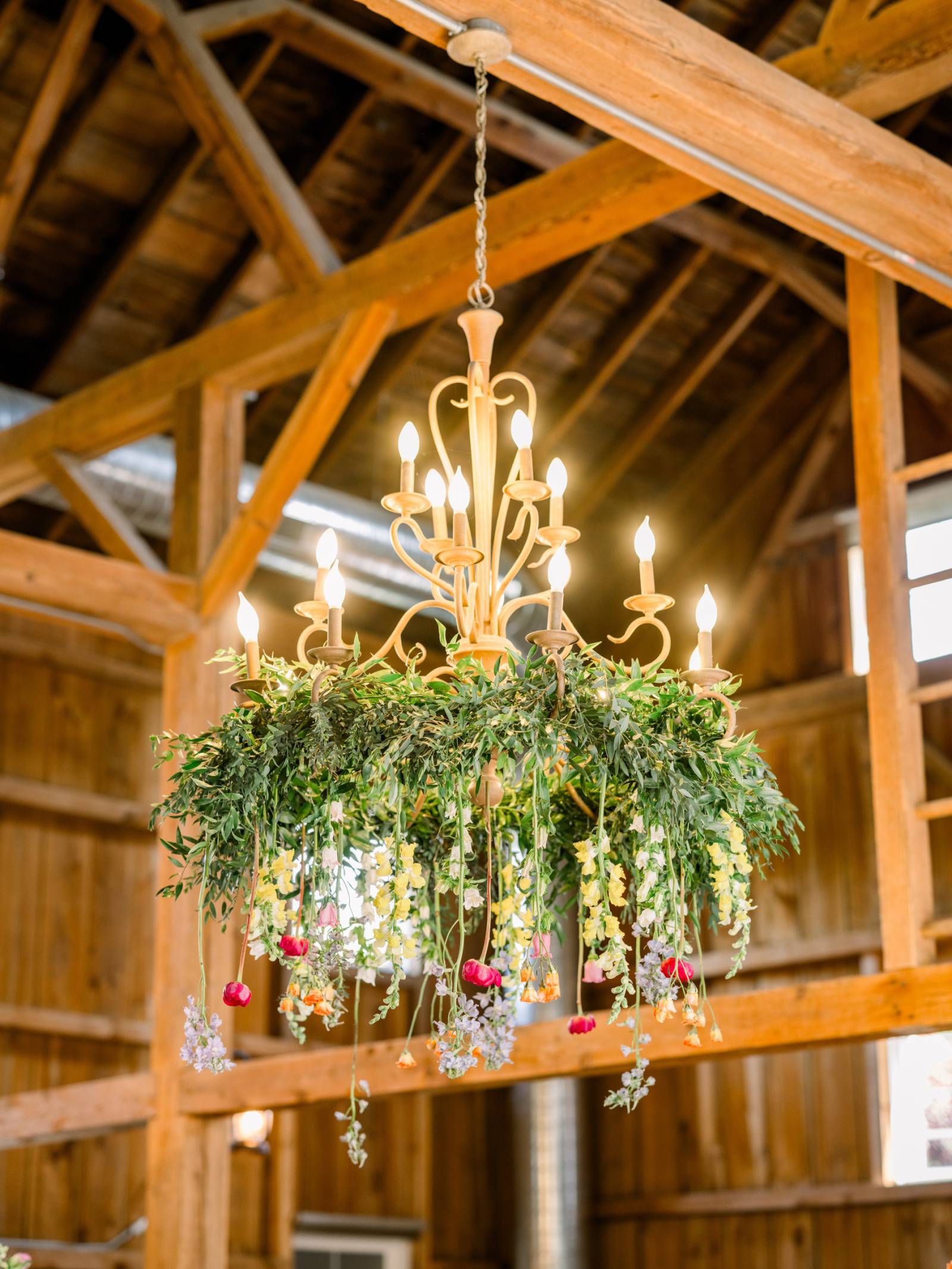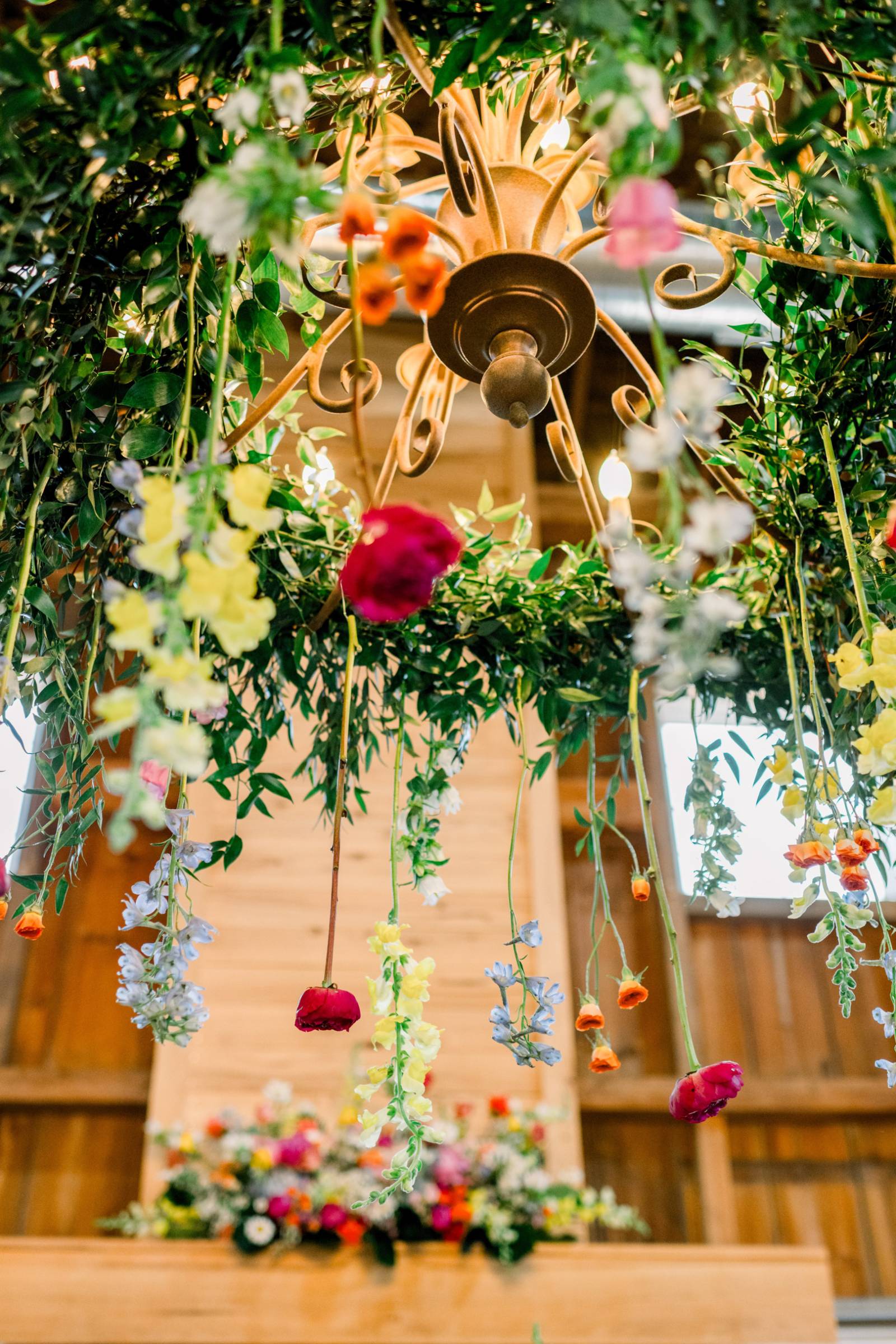 Melody Rose Designs continued the decor with floral arrangements ranging from bud vases to towering floral centerpieces. The barn’s chandeliers also dripped with greenery and long-stemmed flowers, creating a whimsical hanging installation.